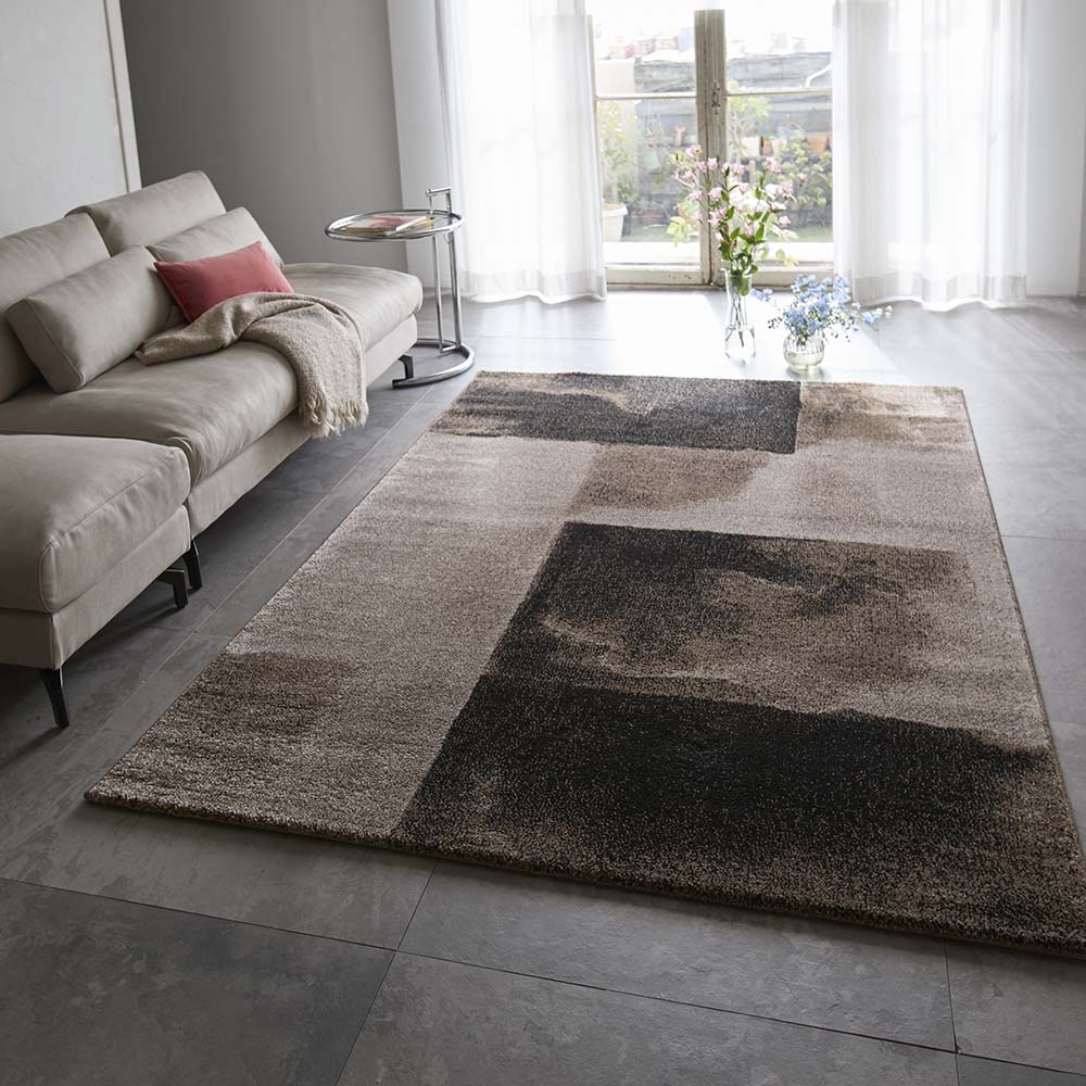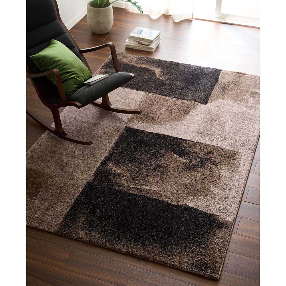 直線的なデザインを水彩画タッチで仕上げたモダンで印象的なデザインラグ。ふっくらボリューム感とコストパフォーマンスも魅力です。シンプルで直線的なデザインをトレンドのブラウン色を使い水彩画タッチで仕上げたモダンデザイン。ふっくらとしたボリューム感溢れるカーペットです。ボリュームももちろん、コストパフォーマンスも魅力です。【ウィルトン織】18世紀中期・イギリスのウィルトン市で発祥した機械織りのラグで、次のような特徴があります。【1】自由な表現力と高いデザイン性無地・柄ラグ共にパイルの長さを自由に変えることができることであらゆる表現力を持ち、デザイン性の高いラグを作ることができます。【2】頑丈なつくりで、耐久性がある表面のパイル糸以外に、地径糸(じだていと)・覆糸(おおいいと)・緯糸(よこいと)の4種類の糸を、織りこんで作ってあります。表面のパイル糸が下糸に直接絡み合わせて織り込んであるるために、パイルが抜けにくく、しっかりとした耐久性に優れた仕上がりになっています。【打込み数】織りの密度を表すもので一般的には1平方メートルあたりにどれくらいの織り目があるかをポイント数という単位であらわします。 ポイント数が多ければ多いほど高密度になり耐久性と重厚感がでるだけでなく、繊細な絵柄を表現することもできるようになり、一般的には価格も高くなります。【ポリプロピレン素材の特徴】ポリプロピレンは耐久性に優れた軽い素材で、吸湿性がないので濡れても乾きやすく、その分お手入れがしやすい素材です。着色する場合は原料から染色するので堅牢度に優れ、色落ちしにくいという特性も持っています。また他の素材に比べて遊び毛がほとんど出ないのも特徴です。【床暖房・ホットカーペット対応】床暖房がある部屋に、ラグやカーペットを敷きたいと考えている方におすすめ。ホットカーペットや床暖房にも対応しているため、オールシーズンで使えます。