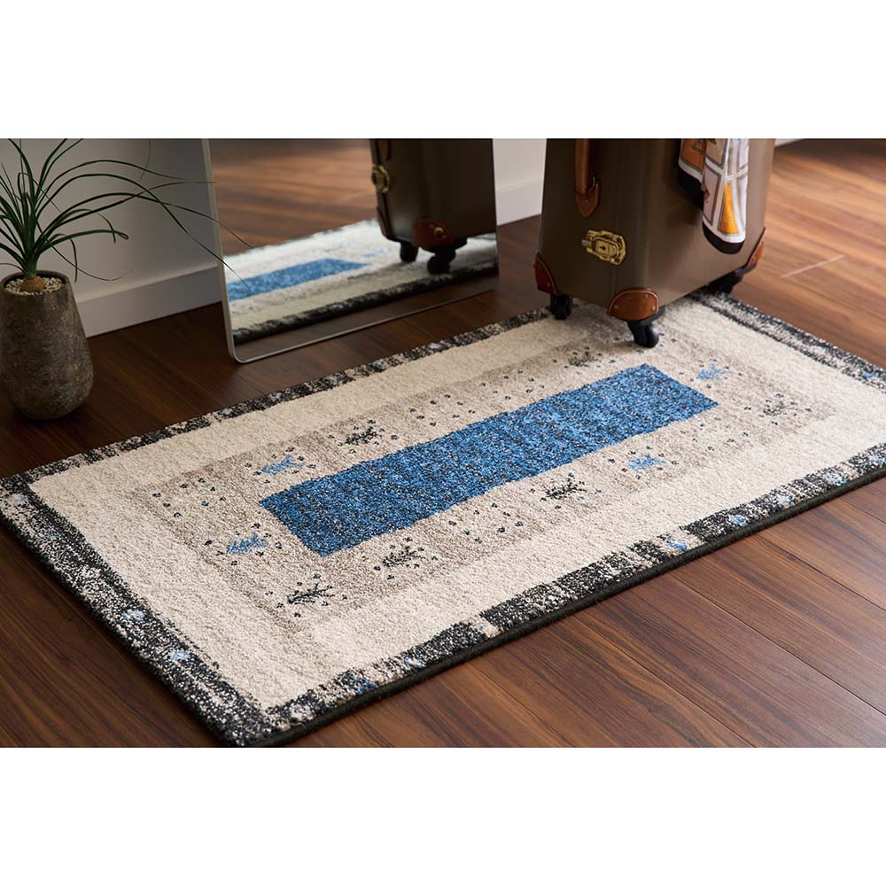 遊牧民達の手織りカーペットをインスピレーションに。温かみのある手織り風の色柄の表現で、長く愛されるラグ&マットです。遊牧民が使う手織りのカーペットをインスピレーションにデザインをしています。ニュアンスのあるラインの表現やミックス感が手織り風のやさしさを感じさせてくれます。サイズバリエーションが多いのも魅力です。【ウィルトン織】18世紀中期・イギリスのウィルトン市で発祥した機械織りのラグで、次のような特徴があります。【1】自由な表現力と高いデザイン性無地・柄ラグ共にパイルの長さを自由に変えることができることであらゆる表現力を持ち、デザイン性の高いラグを作ることができます。【2】頑丈なつくりで、耐久性がある表面のパイル糸以外に、地径糸(じだていと)・覆糸(おおいいと)・緯糸(よこいと)の4種類の糸を、織りこんで作ってあります。表面のパイル糸が下糸に直接絡み合わせて織り込んであるるために、パイルが抜けにくく、しっかりとした耐久性に優れた仕上がりになっています。【打込み数】織りの密度を表すもので一般的には1平方メートルあたりにどれくらいの織り目があるかをポイント数という単位であらわします。 ポイント数が多ければ多いほど高密度になり耐久性と重厚感がでるだけでなく、繊細な絵柄を表現することもできるようになり、一般的には価格も高くなります。【ポリプロピレン素材の特徴】ポリプロピレンは耐久性に優れた軽い素材で、吸湿性がないので濡れても乾きやすく、その分お手入れがしやすい素材です。着色する場合は原料から染色するので堅牢度に優れ、色落ちしにくいという特性も持っています。また他の素材に比べて遊び毛がほとんど出ないのも特徴です。【遊び毛が出にくいヒートセット加工】パイル糸に熱処理(ヒートセット加工)を施し、更に撚り加工を施すことで、やわらかな感触と弾力のあるふみ心地に。また、遊び毛が出にくくホコリが立ちにくいので、お掃除もラクに。【床暖房・ホットカーペット対応】床暖房がある部屋に、ラグやカーペットを敷きたいと考えている方におすすめ。ホットカーペットや床暖房にも対応しているため、オールシーズンで使えます。