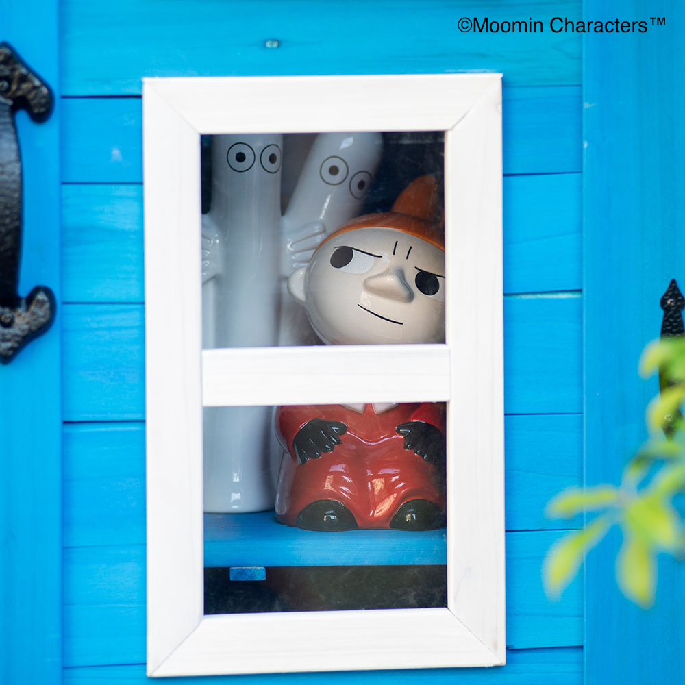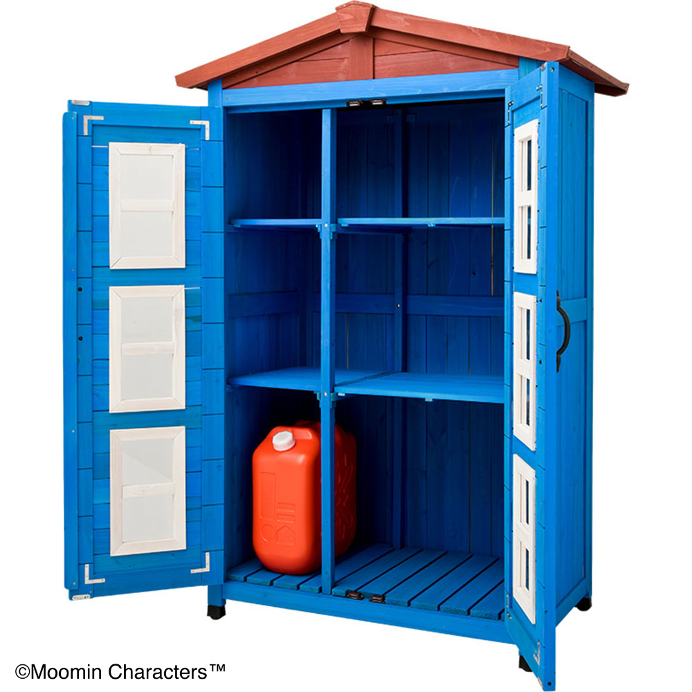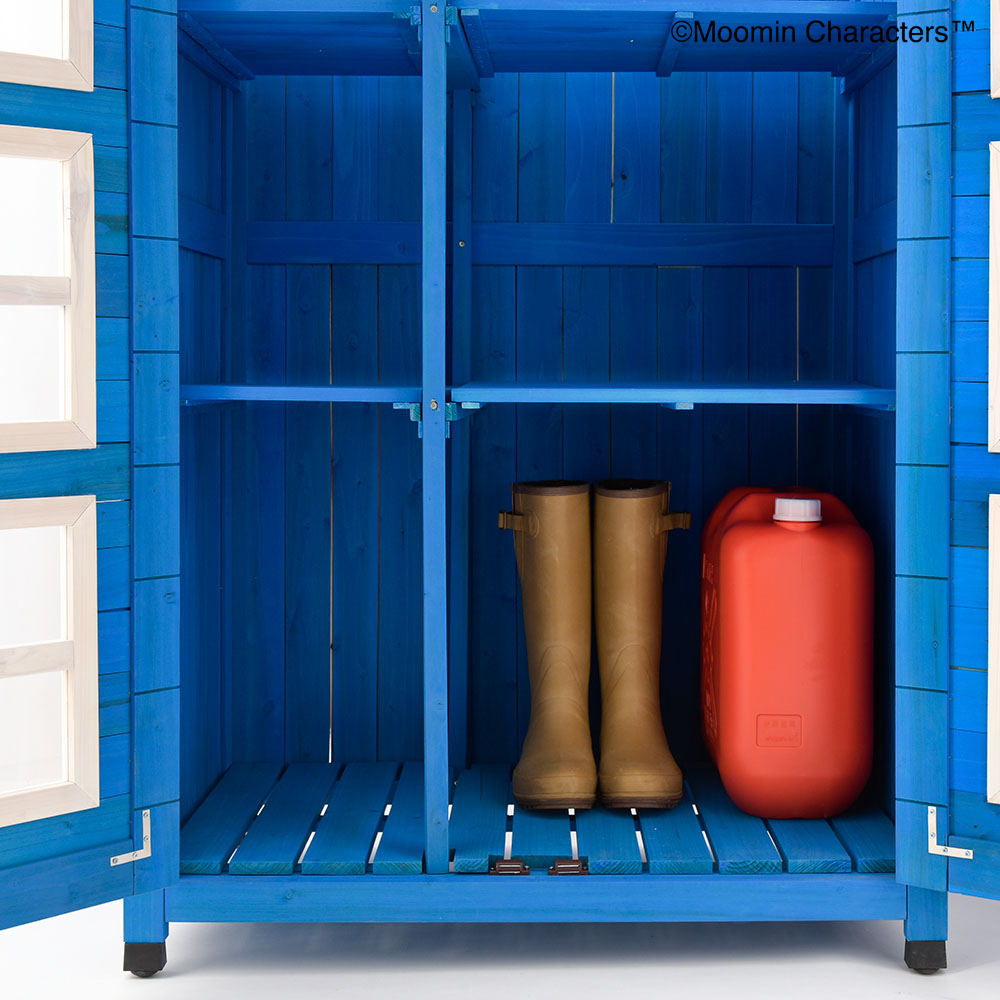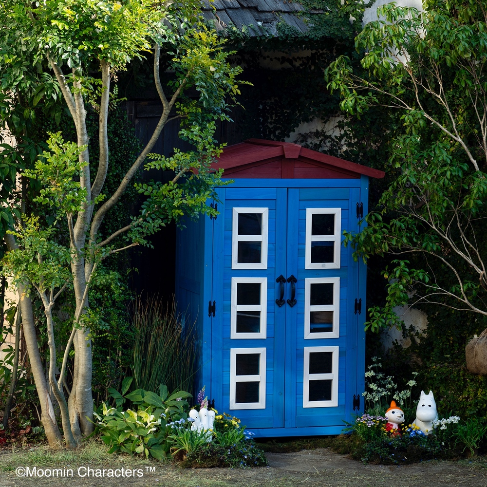 憧れの「ムーミンやしき」がご自宅のお庭に♪ムーミンの世界を楽しめる天然木製の収納庫を作ってみました!〜ムーミンの世界観をご自宅のお庭に〜▼ムーミンやしきを再現「青の壁面」「白枠の窓」「赤い屋根」を完全再現!お庭やテラスに憧れのムーミンの世界観を再現できちゃいます。まるでムーミン谷の仲間たちが、やしきから出てくるかのよう…♪植栽と収納庫がどちらも主役に!・あたたかみのある天然木製。自然の素材はやっぱりお庭に馴染むんです。・前面のドアの窓はアクリル板。覗き込めば中を確認できるので、庫内にオーナメント(別売り)を置けば部屋の中からムーミンファミリーが外をのぞくような演出もできちゃいます!▼細部まで抜け目ない情緒性・取っ手にもこだわりを。重厚感がありながら、愛らしいデザイン。・こんな物置なら園芸用品の片付けまで楽しくなりそう。・高さがあるからたまにしか見えないけど天板もこだわりを。 防水シートを屋根の中に挟んでおります。雰囲気を壊さない木製の見た目です。※完全防水ではございません。〜自慢の機能性〜▼機能性1・可動棚で収納物に合わせたスペースを生み出す!・たっぷりの奥行と前後左右の可動棚が自慢。・奥行があるから底面積のあるポリタンクや肥料、土なども収納できます。・前の棚板を外してホウキ、高枝切りバサミ等の長尺物もすっきりと収納できます。・可動棚板のアレンジ次第で、収納する物に合わせて専用収納スペースをつくれます。・棚板の耐荷重は、棚板(小)12キロ 棚板(大)22キロ。▼機能性2・ツールフック付き!・便利なツールフックが2個付属。ガーデンツールなどを掛けられます。・土や肥料などの大物は収納庫の中に、スコップやフォークなどのガーデンツール小物はフックにかければ整理もしやすい!2025年は「ムーミン」小説1作目の出版80周年です。2025年は「ムーミン」小説1 作目の出版80周年です。80周年のテーマは“The door is always open”。ムーミンたちの暮らすムーミン谷には、たくさんの個性的な住人がいます。住人たちは自由にムーミンやしきを訪れて、おもいおもいに過ごします。ドアに鍵をかけないムーミンやしきは、どんな生きものでも受け入れるのです。帰る場所や居場所の大切さを物語の中で見つけてほしい。それが、物語が始まった80年前から現在に至るまで変わることのないおもいです。商品企画担当コメント2025年は『ムーミン』小説出版80周年。そしてそのテーマを聞いてdinosで人気の木製収納庫がピッタリだと思いました。機能的なサイズや仕様はそのままに、ムーミンやしきのデザインに変更、綺麗な色合いを再現…普段商品開発する際は、「いかに植栽に馴染むか?」「植物たちの色を邪魔しないか?」に一番気を遣いますが、でも今回はお庭の中で、「ムーミンやしき」を再現出来るように。。。実際に庭に置いたときに違和感があるかも…という懸念がありましたが、実際に完成した商品を庭に置いてみると植栽と相性良く、かつムーミンの世界に入ったかのように感じさせてくれる収納庫となりました!自分だけのムーミンの世界をご自宅のお庭で楽しんでいただけたら嬉しいです♪ちなみに…夜は収納庫の中にライトを入れて点灯してみたり、別売りの『ムーミン 陶器の置物』を収納庫の周囲に設置したりするとよりムーミンの世界観をより表現できるのでオススメです!