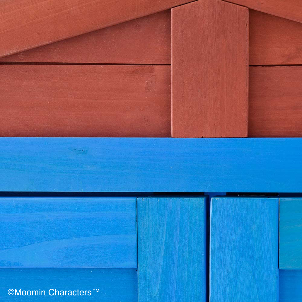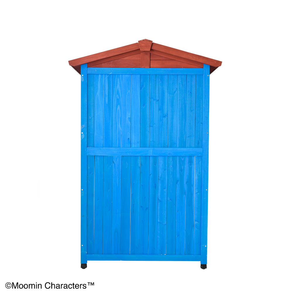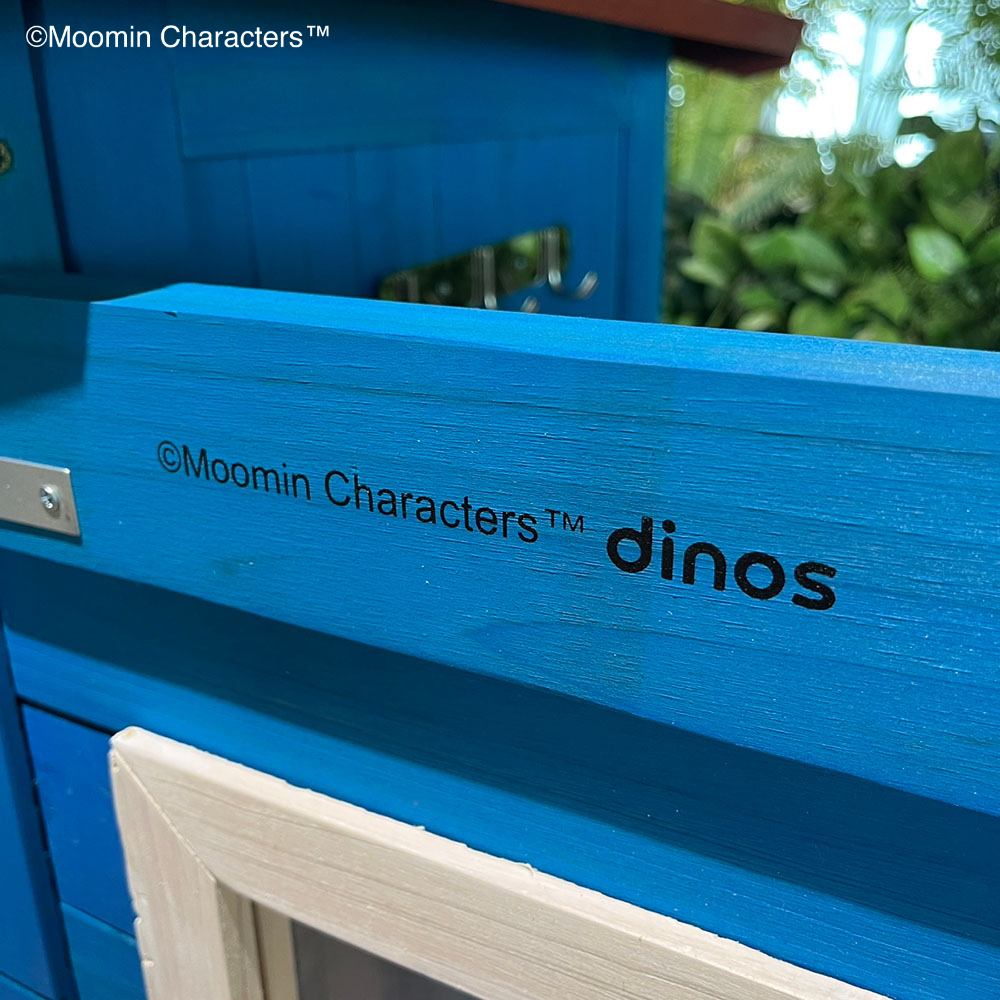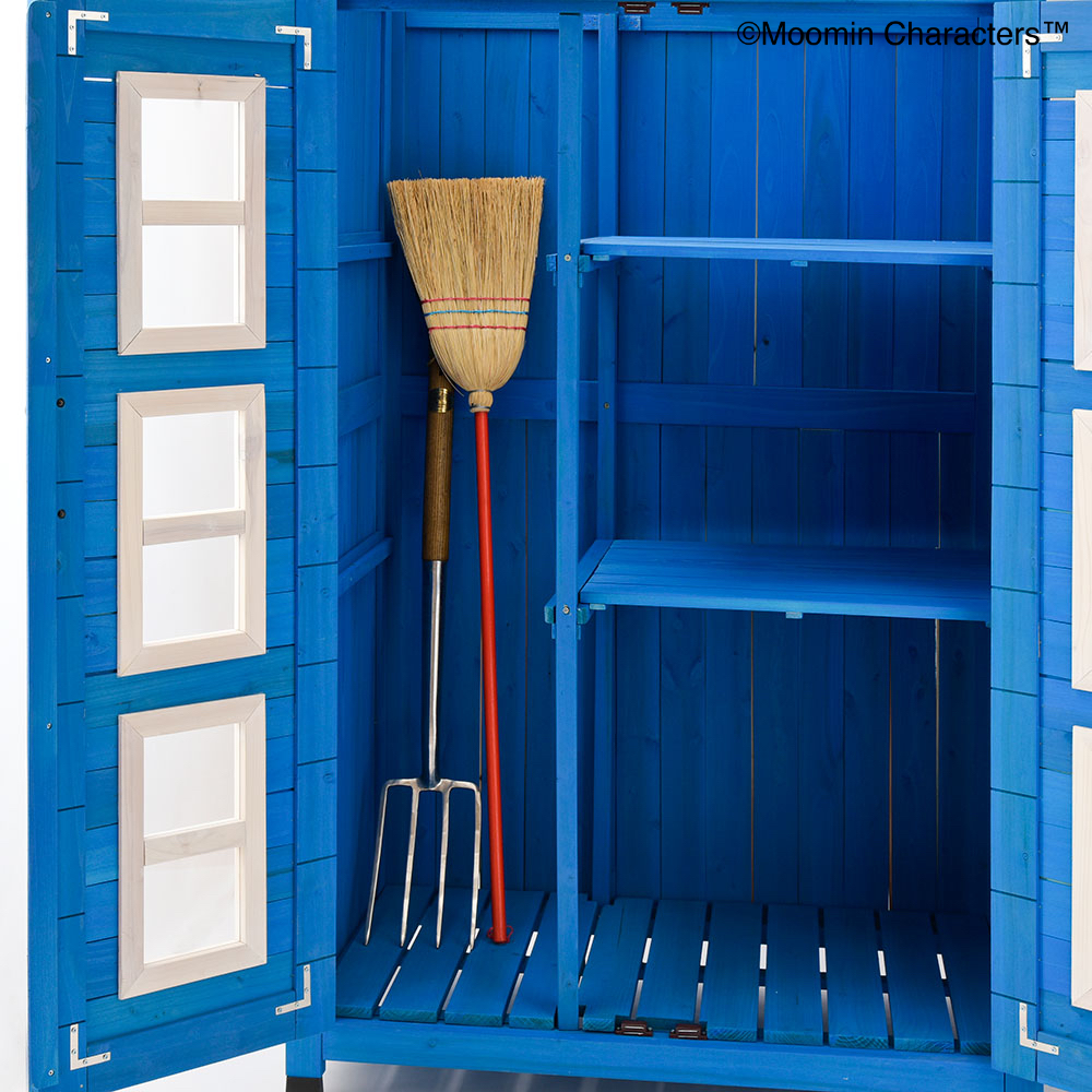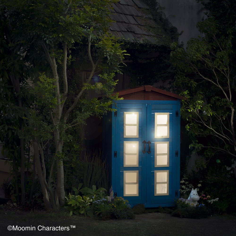 憧れの「ムーミンやしき」がご自宅のお庭に♪ムーミンの世界を楽しめる天然木製の収納庫を作ってみました!〜ムーミンの世界観をご自宅のお庭に〜▼ムーミンやしきを再現「青の壁面」「白枠の窓」「赤い屋根」を完全再現!お庭やテラスに憧れのムーミンの世界観を再現できちゃいます。まるでムーミン谷の仲間たちが、やしきから出てくるかのよう…♪植栽と収納庫がどちらも主役に!・あたたかみのある天然木製。自然の素材はやっぱりお庭に馴染むんです。・前面のドアの窓はアクリル板。覗き込めば中を確認できるので、庫内にオーナメント(別売り)を置けば部屋の中からムーミンファミリーが外をのぞくような演出もできちゃいます!▼細部まで抜け目ない情緒性・取っ手にもこだわりを。重厚感がありながら、愛らしいデザイン。・こんな物置なら園芸用品の片付けまで楽しくなりそう。・高さがあるからたまにしか見えないけど天板もこだわりを。 防水シートを屋根の中に挟んでおります。雰囲気を壊さない木製の見た目です。※完全防水ではございません。〜自慢の機能性〜▼機能性1・可動棚で収納物に合わせたスペースを生み出す!・たっぷりの奥行と前後左右の可動棚が自慢。・奥行があるから底面積のあるポリタンクや肥料、土なども収納できます。・前の棚板を外してホウキ、高枝切りバサミ等の長尺物もすっきりと収納できます。・可動棚板のアレンジ次第で、収納する物に合わせて専用収納スペースをつくれます。・棚板の耐荷重は、棚板(小)12キロ 棚板(大)22キロ。▼機能性2・ツールフック付き!・便利なツールフックが2個付属。ガーデンツールなどを掛けられます。・土や肥料などの大物は収納庫の中に、スコップやフォークなどのガーデンツール小物はフックにかければ整理もしやすい!2025年は「ムーミン」小説1作目の出版80周年です。2025年は「ムーミン」小説1 作目の出版80周年です。80周年のテーマは“The door is always open”。ムーミンたちの暮らすムーミン谷には、たくさんの個性的な住人がいます。住人たちは自由にムーミンやしきを訪れて、おもいおもいに過ごします。ドアに鍵をかけないムーミンやしきは、どんな生きものでも受け入れるのです。帰る場所や居場所の大切さを物語の中で見つけてほしい。それが、物語が始まった80年前から現在に至るまで変わることのないおもいです。商品企画担当コメント2025年は『ムーミン』小説出版80周年。そしてそのテーマを聞いてdinosで人気の木製収納庫がピッタリだと思いました。機能的なサイズや仕様はそのままに、ムーミンやしきのデザインに変更、綺麗な色合いを再現…普段商品開発する際は、「いかに植栽に馴染むか?」「植物たちの色を邪魔しないか?」に一番気を遣いますが、でも今回はお庭の中で、「ムーミンやしき」を再現出来るように。。。実際に庭に置いたときに違和感があるかも…という懸念がありましたが、実際に完成した商品を庭に置いてみると植栽と相性良く、かつムーミンの世界に入ったかのように感じさせてくれる収納庫となりました!自分だけのムーミンの世界をご自宅のお庭で楽しんでいただけたら嬉しいです♪ちなみに…夜は収納庫の中にライトを入れて点灯してみたり、別売りの『ムーミン 陶器の置物』を収納庫の周囲に設置したりするとよりムーミンの世界観をより表現できるのでオススメです!