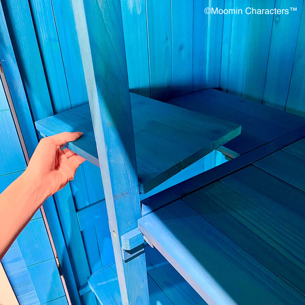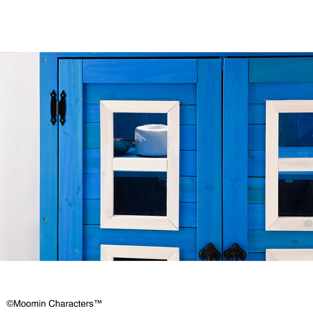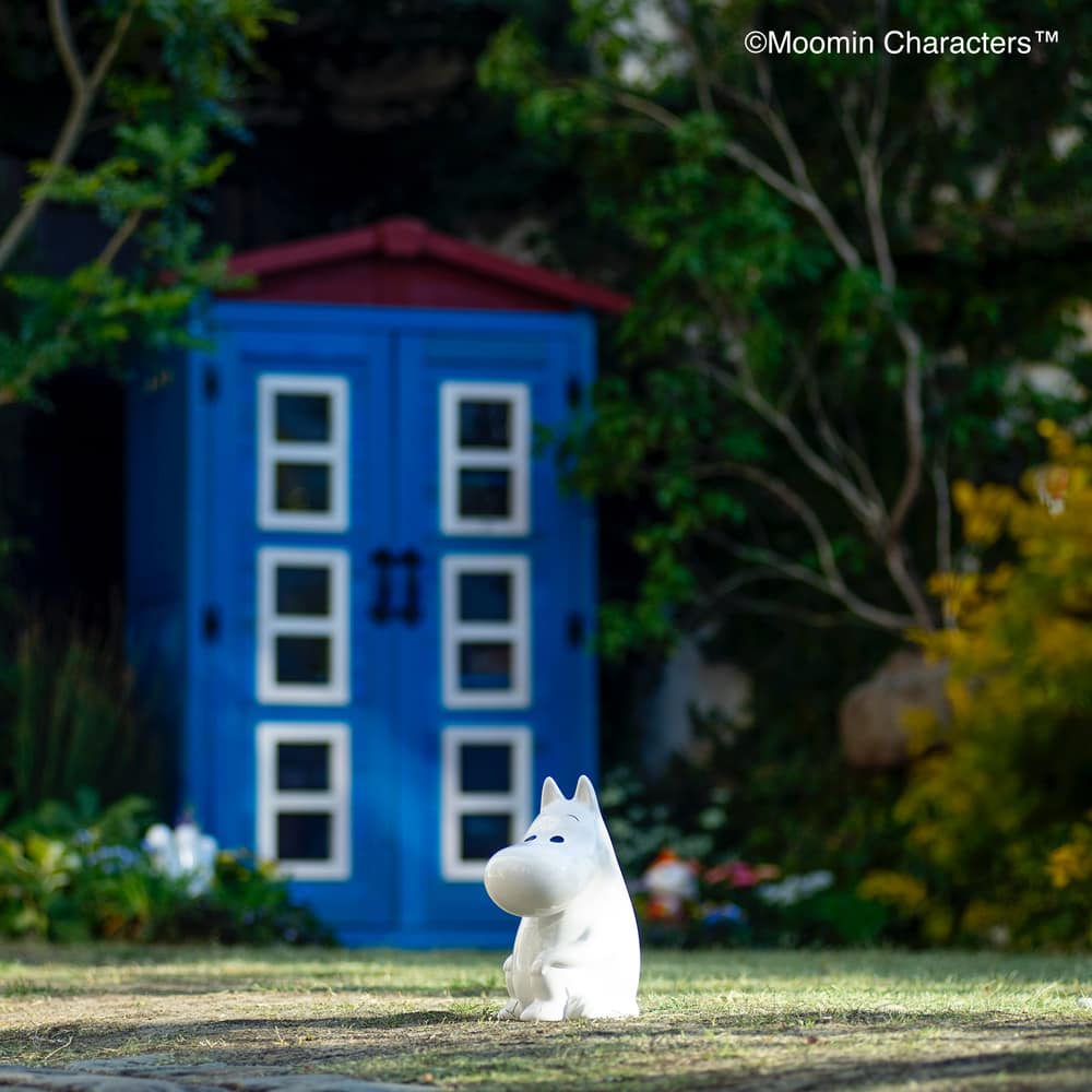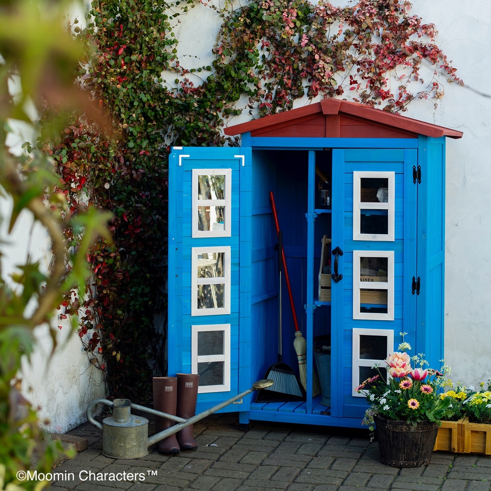 憧れの「ムーミンやしき」がご自宅のお庭に♪ムーミンの世界を楽しめる天然木製の収納庫を作ってみました!〜ムーミンの世界観をご自宅のお庭に〜▼ムーミンやしきを再現「青の壁面」「白枠の窓」「赤い屋根」を完全再現!お庭やテラスに憧れのムーミンの世界観を再現できちゃいます。まるでムーミン谷の仲間たちが、やしきから出てくるかのよう…♪植栽と収納庫がどちらも主役に!・あたたかみのある天然木製。自然の素材はやっぱりお庭に馴染むんです。・前面のドアの窓はアクリル板。覗き込めば中を確認できるので、庫内にオーナメント(別売り)を置けば部屋の中からムーミンファミリーが外をのぞくような演出もできちゃいます!▼細部まで抜け目ない情緒性・取っ手にもこだわりを。重厚感がありながら、愛らしいデザイン。・こんな物置なら園芸用品の片付けまで楽しくなりそう。・高さがあるからたまにしか見えないけど天板もこだわりを。 防水シートを屋根の中に挟んでおります。雰囲気を壊さない木製の見た目です。※完全防水ではございません。〜自慢の機能性〜▼機能性1・可動棚で収納物に合わせたスペースを生み出す!・たっぷりの奥行と前後左右の可動棚が自慢。・奥行があるから底面積のあるポリタンクや肥料、土なども収納できます。・前の棚板を外してホウキ、高枝切りバサミ等の長尺物もすっきりと収納できます。・可動棚板のアレンジ次第で、収納する物に合わせて専用収納スペースをつくれます。・棚板の耐荷重は、棚板(小)12キロ 棚板(大)22キロ。▼機能性2・ツールフック付き!・便利なツールフックが2個付属。ガーデンツールなどを掛けられます。・土や肥料などの大物は収納庫の中に、スコップやフォークなどのガーデンツール小物はフックにかければ整理もしやすい!2025年は「ムーミン」小説1作目の出版80周年です。2025年は「ムーミン」小説1 作目の出版80周年です。80周年のテーマは“The door is always open”。ムーミンたちの暮らすムーミン谷には、たくさんの個性的な住人がいます。住人たちは自由にムーミンやしきを訪れて、おもいおもいに過ごします。ドアに鍵をかけないムーミンやしきは、どんな生きものでも受け入れるのです。帰る場所や居場所の大切さを物語の中で見つけてほしい。それが、物語が始まった80年前から現在に至るまで変わることのないおもいです。商品企画担当コメント2025年は『ムーミン』小説出版80周年。そしてそのテーマを聞いてdinosで人気の木製収納庫がピッタリだと思いました。機能的なサイズや仕様はそのままに、ムーミンやしきのデザインに変更、綺麗な色合いを再現…普段商品開発する際は、「いかに植栽に馴染むか?」「植物たちの色を邪魔しないか?」に一番気を遣いますが、でも今回はお庭の中で、「ムーミンやしき」を再現出来るように。。。実際に庭に置いたときに違和感があるかも…という懸念がありましたが、実際に完成した商品を庭に置いてみると植栽と相性良く、かつムーミンの世界に入ったかのように感じさせてくれる収納庫となりました!自分だけのムーミンの世界をご自宅のお庭で楽しんでいただけたら嬉しいです♪ちなみに…夜は収納庫の中にライトを入れて点灯してみたり、別売りの『ムーミン 陶器の置物』を収納庫の周囲に設置したりするとよりムーミンの世界観をより表現できるのでオススメです!