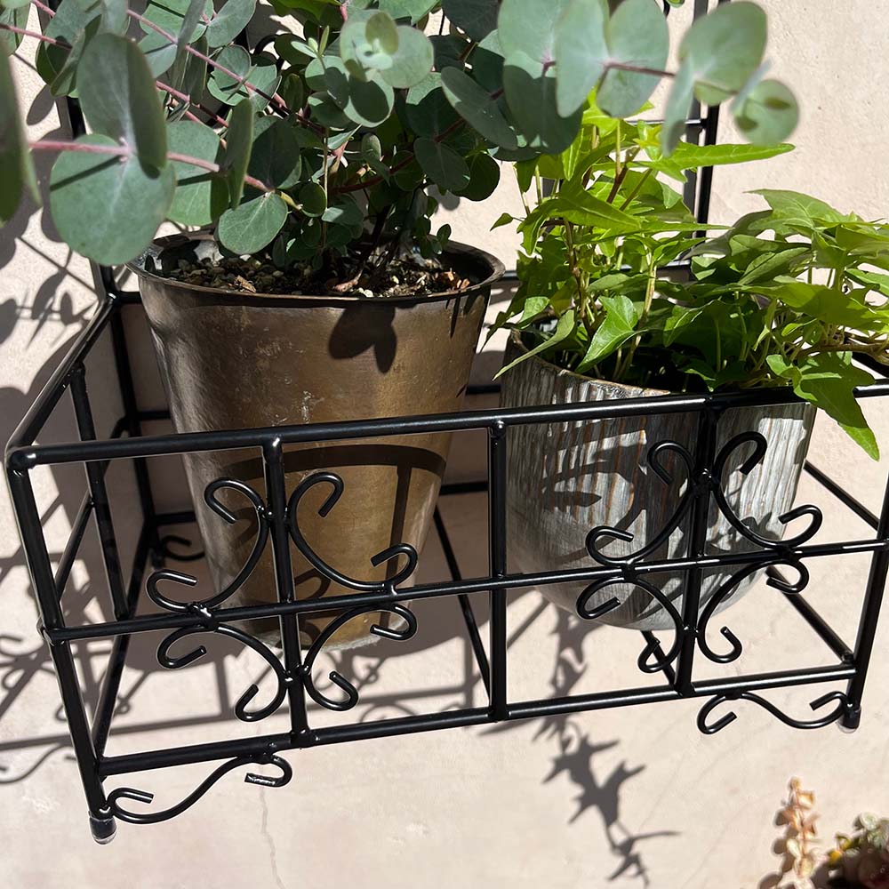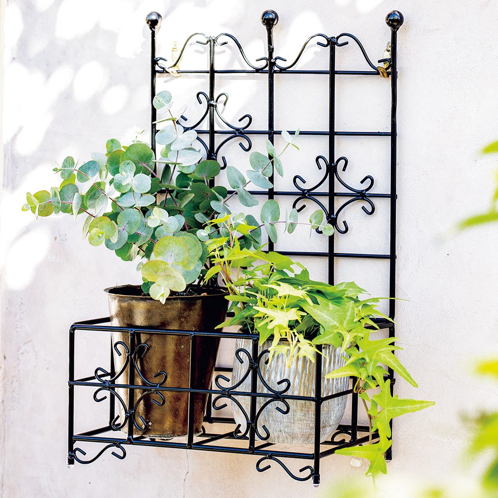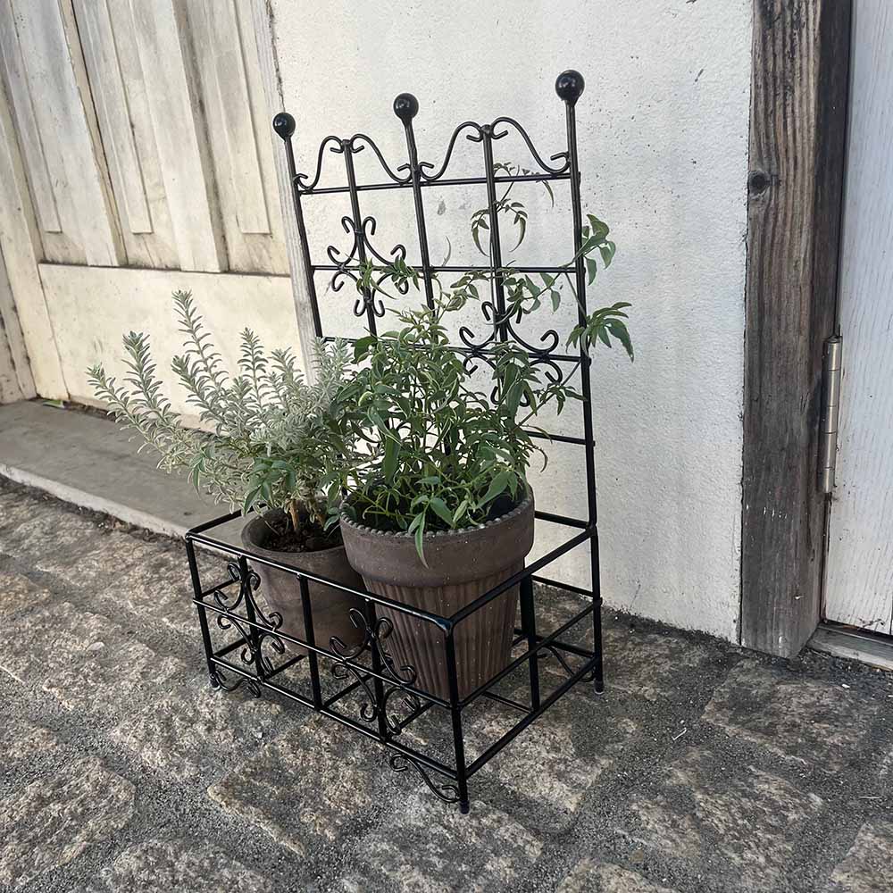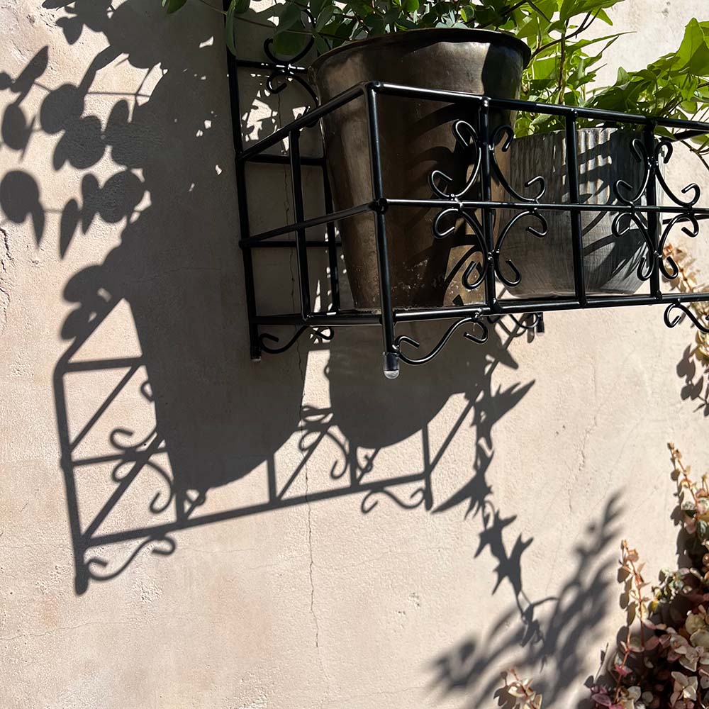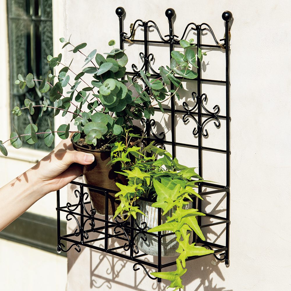 置き型、掛け型 どちらの使い方も可能な背景のあるプランターボックス。▼置き掛け2WAY・置き型底面を見てみると、実は脚があり地面に直接底面が当たらない仕様になっているんです。この脚のおかげで地面と密着しないから空気の通り道ができ、根腐れや虫対策になります。背景があるので、お花があっても無くても華やかな印象に。誘引も叶います。・掛け型市販のフックを使用して壁に掛ければ、育てている自慢のポットを目線の高さに持ってくることができます。中にフェイクグリーンを入れて壁掛けすれば、室内の殺風景な壁がガラリと変身。目の高さの緑化が叶います。▼2つ繋げると…背面のデザインはエレガントなモチーフが左に2つ、右に1つ…商品を2つ並べたときにバランスよくモチーフが配置されるように企画しました。壁際に置いても◎、花壇の背景にしても◎です。▼影も楽しめるこのモチーフの影を楽しむのも一興。つる性の植物を誘引すれば、風に揺れる植物の影とモチーフの影が折り重なります。風を感じ、植物を感じ、また影も含めた自然を視覚で楽しむのもまたいいですよね。