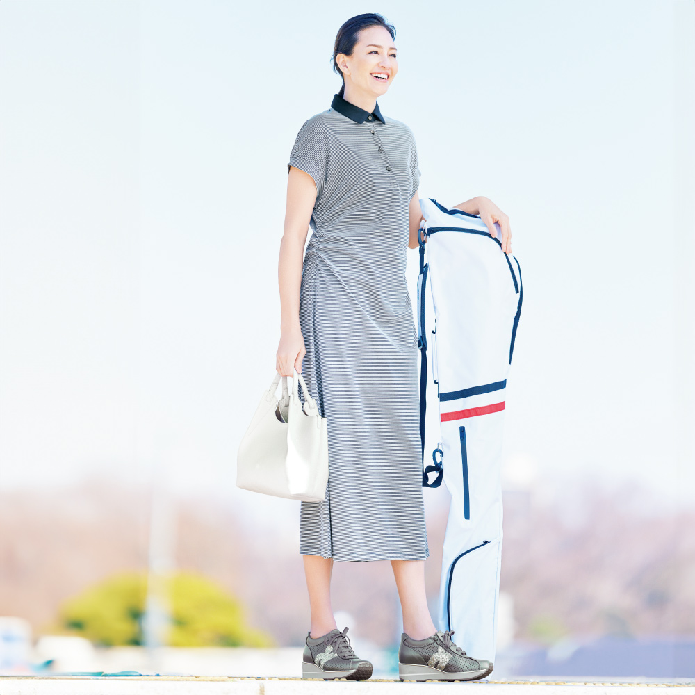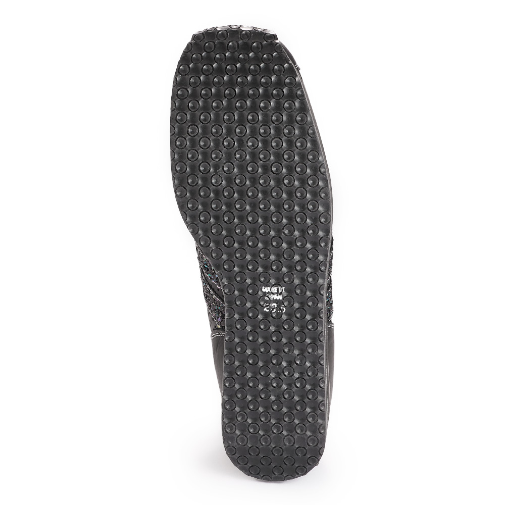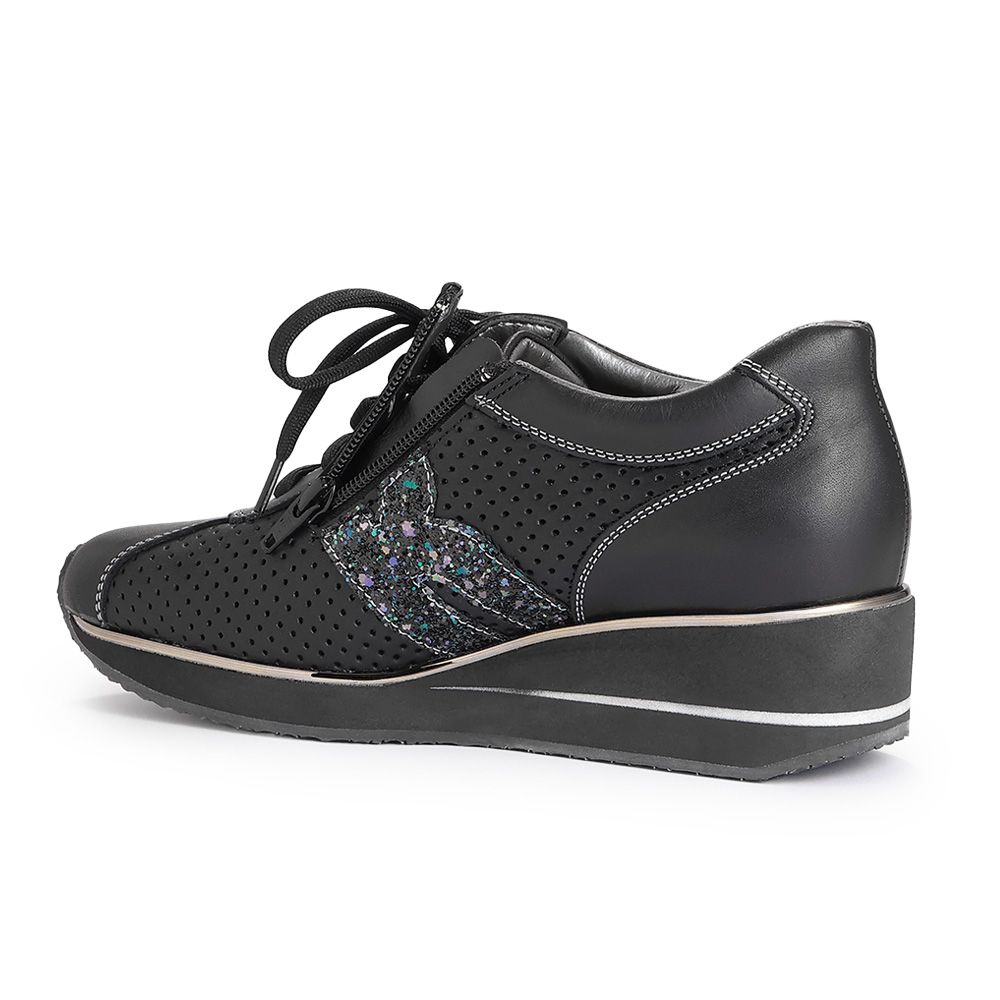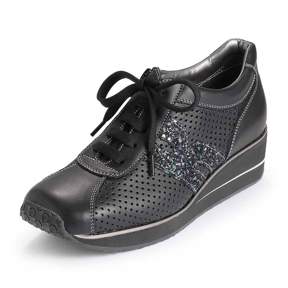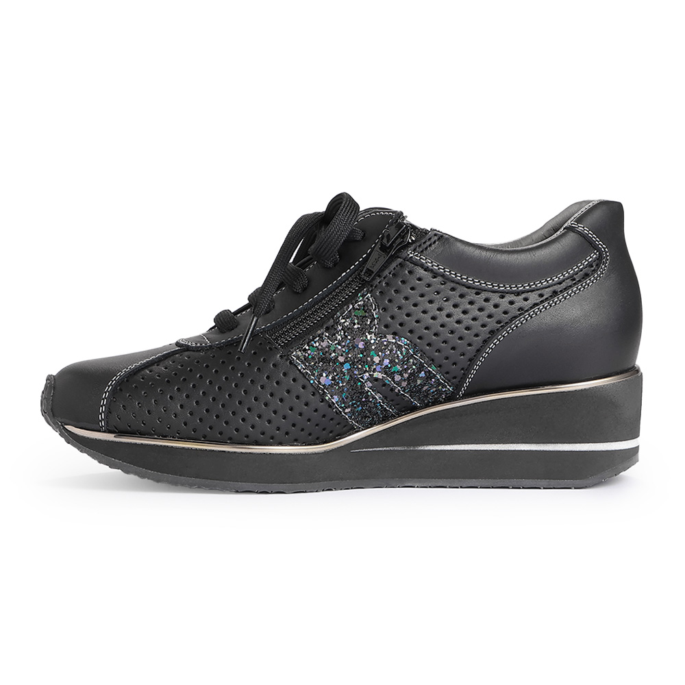 弾むような足取りで、スタイルアップを叶えてゆったりしたワイズ(足囲)ながら、足がシャープに見える美形スニーカー。約5cmヒールの厚底はウエッジ型で安定感があります。さり気なく華やぐラメのロゴマーク、着脱のラクな内側ファスナーなど美点が多数。