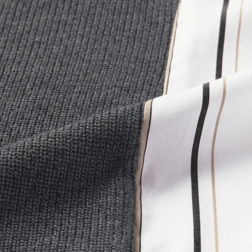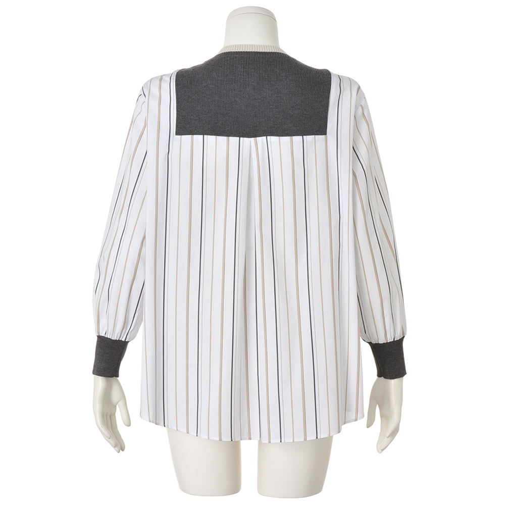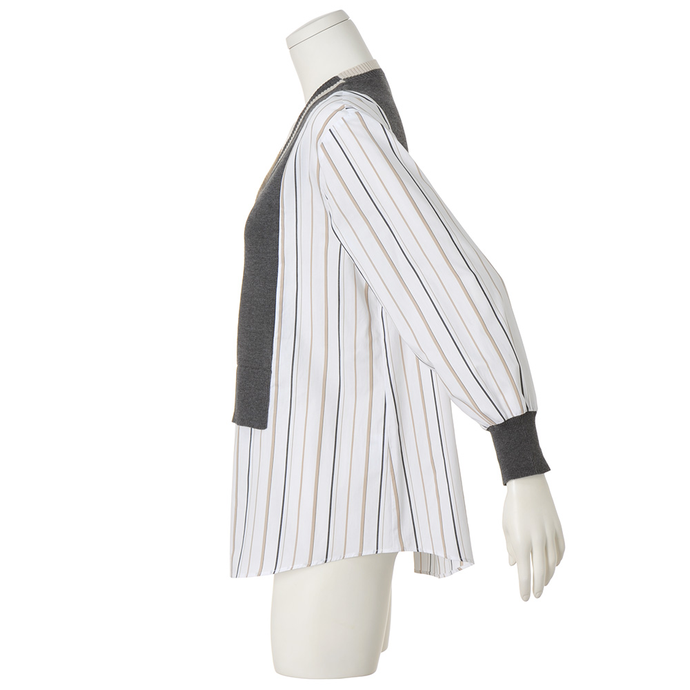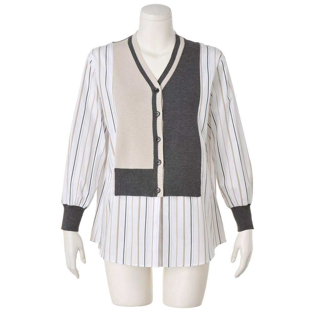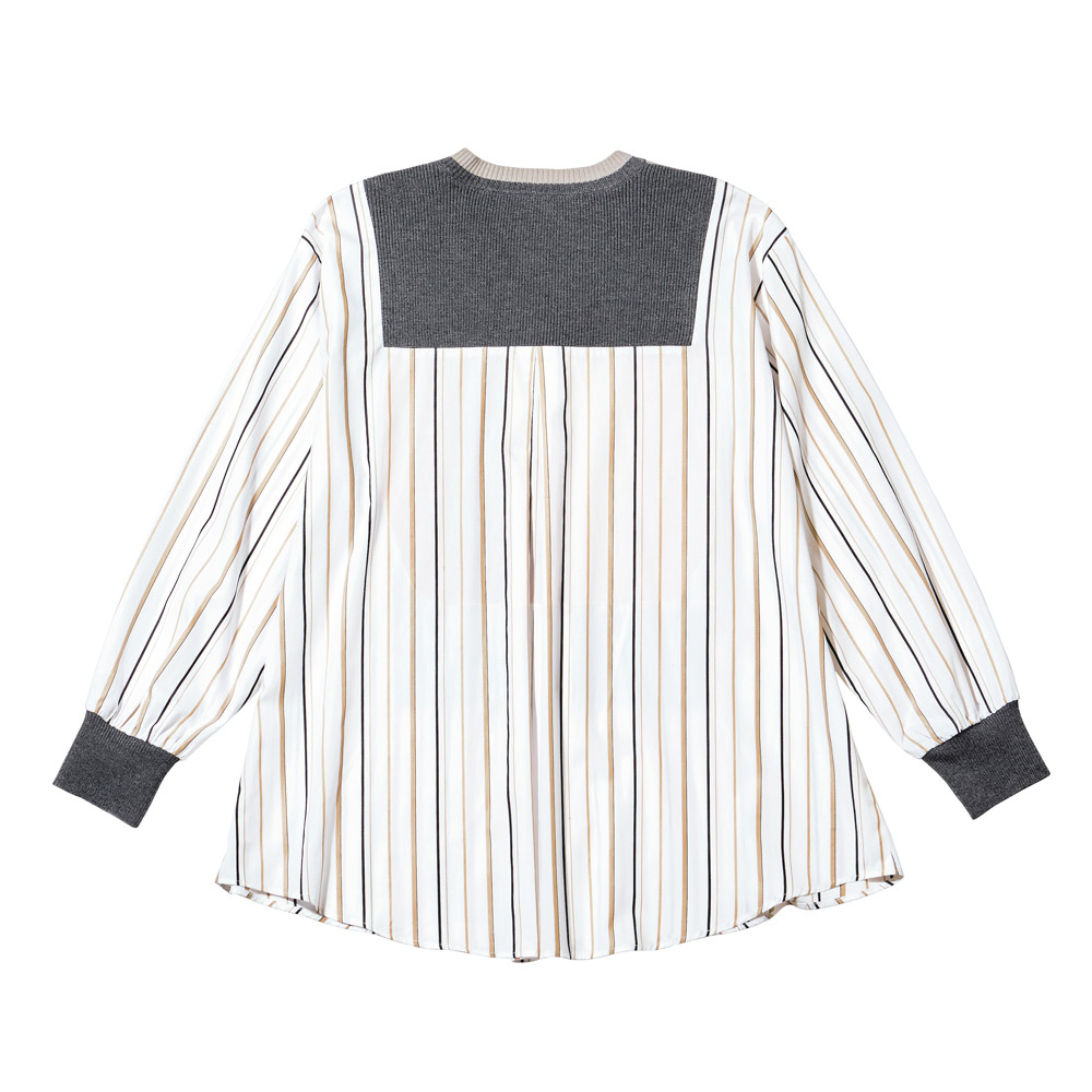ドッキングアイテムニットと布帛……、異なる生地をドッキングさせたひとクセデザインは、大人の遊び心たっぷり。鮮度もまとえるいち押しアイテムです。ブラウンとブラックを用いたマルチストライプ柄の白シャツに、片畔編みで肉厚感をもたせたベージュとグレーのニットをドッキング。シックな上品配色が、洗練感を後押し。袖口にもニットをあしらい、自然に生まれるパフスリーブのような立体感が、女性らしさを引き立てます。