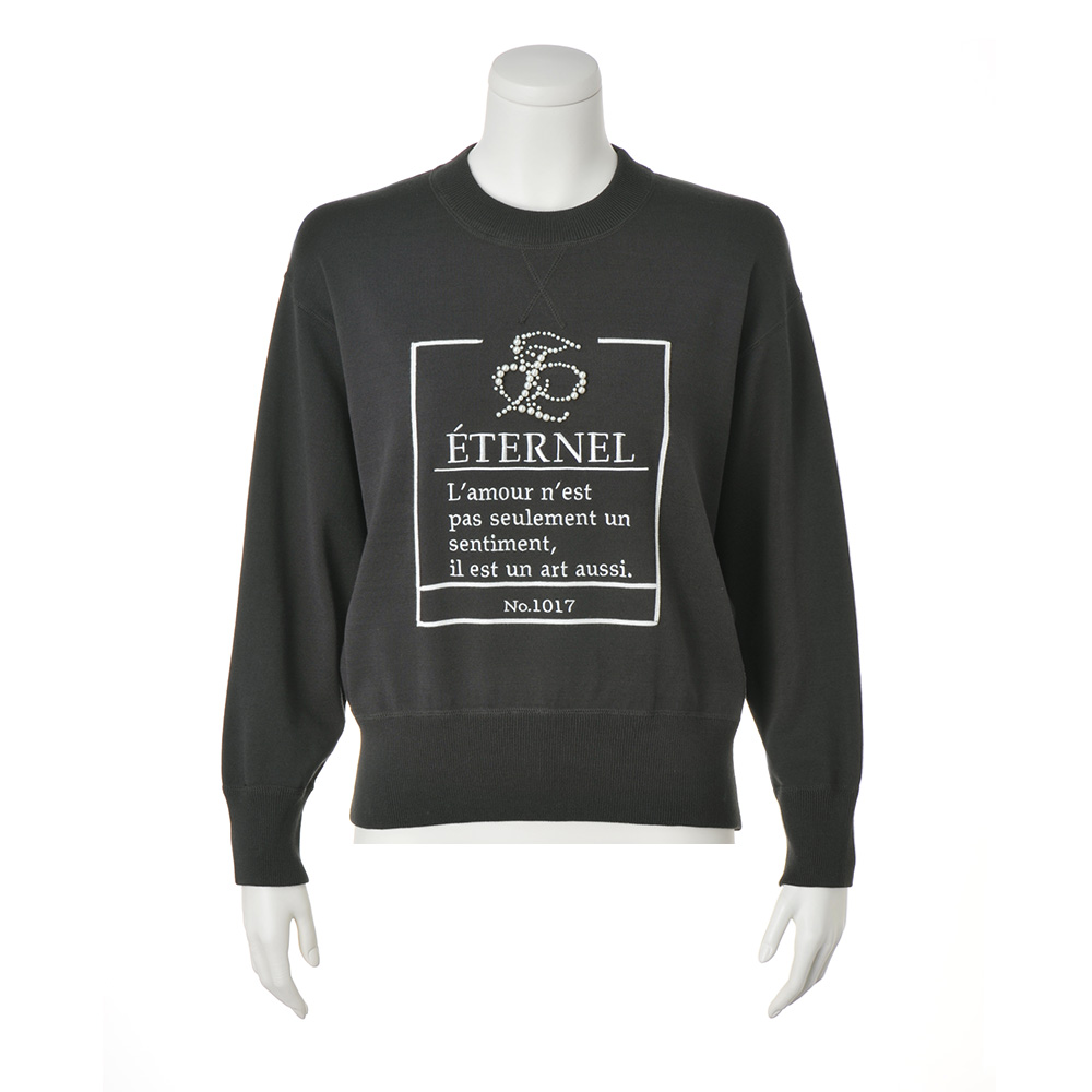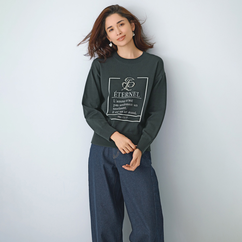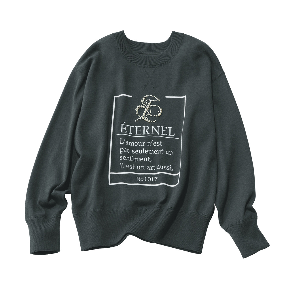 テクニックデザインニット目新しいものをお探しの方は必見!一着で主役になれる、デザインニットにクローズアップ。ベーシックなボトムに合わせるだけで、旬のコーディネートが即完成します。パールビーズと刺しゅう使いがアクセント!スウェットみたいに着られるニットフォルムはカジュアルなスウェット風ながら、ニットのコシと落ち感があるためきれいめな印象に。袖口や襟・裾などは太めのリブ編みで引き締め、シルエットにメリハリが生まれます。ロゴ部分には刺しゅうとパールビーズをほどこし、華やかさを兼ね備えた一着です。