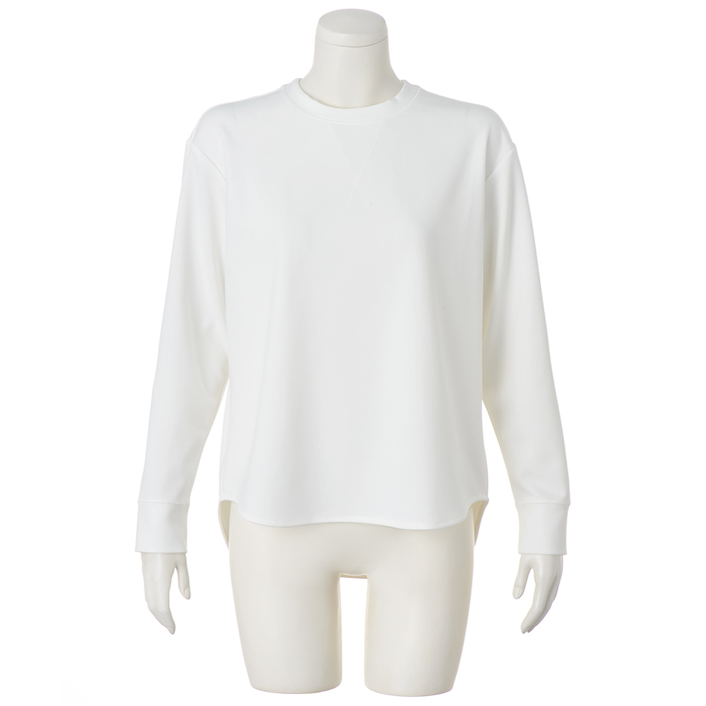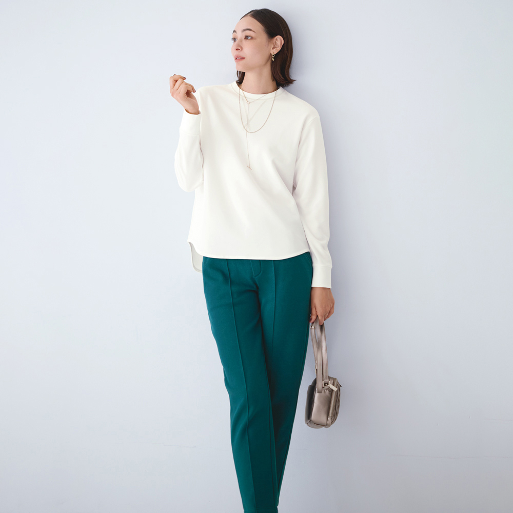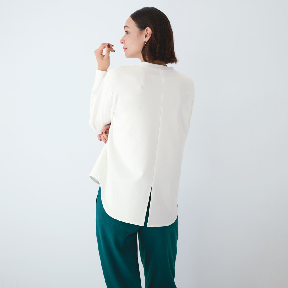 とろみブラウス横ストレッチ、防シワ機能つきでTシャツのように着心地がよいのに、見ためはブラウスのようなきちんと感が。裾は前後の長さが異なり、バックスタイルはヒップがしっかり隠れる丈感でスリット入り。オフィスにもカジュアルにも使える、着こなしの幅が広い一着。UVカット機能つきで春先まで活躍します。[横ストレッチ / 防シワ / UVカット]