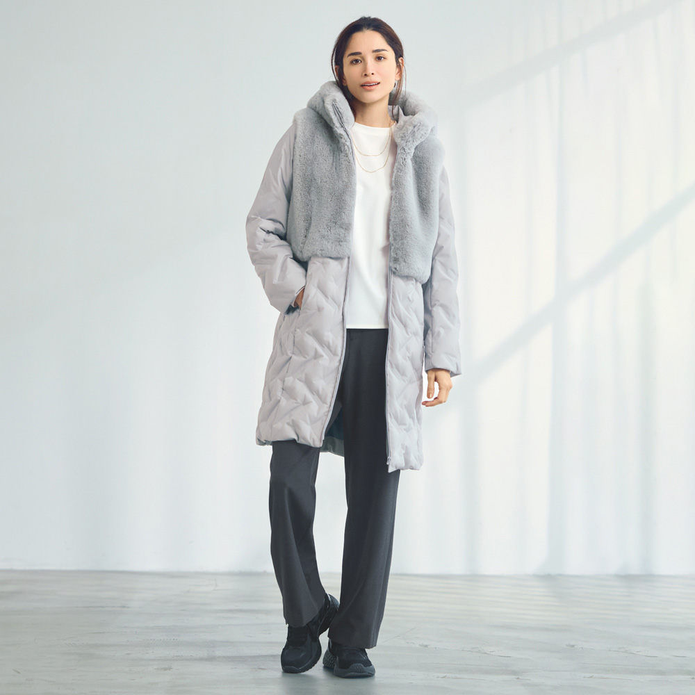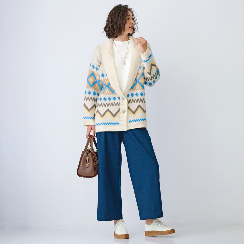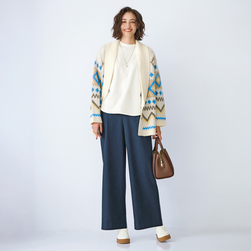コーディネート例 /ほっこり見えしがちなニットアウターを、きちんと感のあるコーディネートにアップデート。とろみブラウスを重ねることで、都会的なレイヤードスタイルが完成。