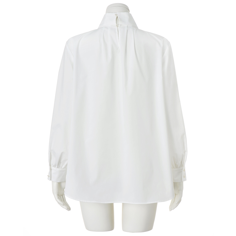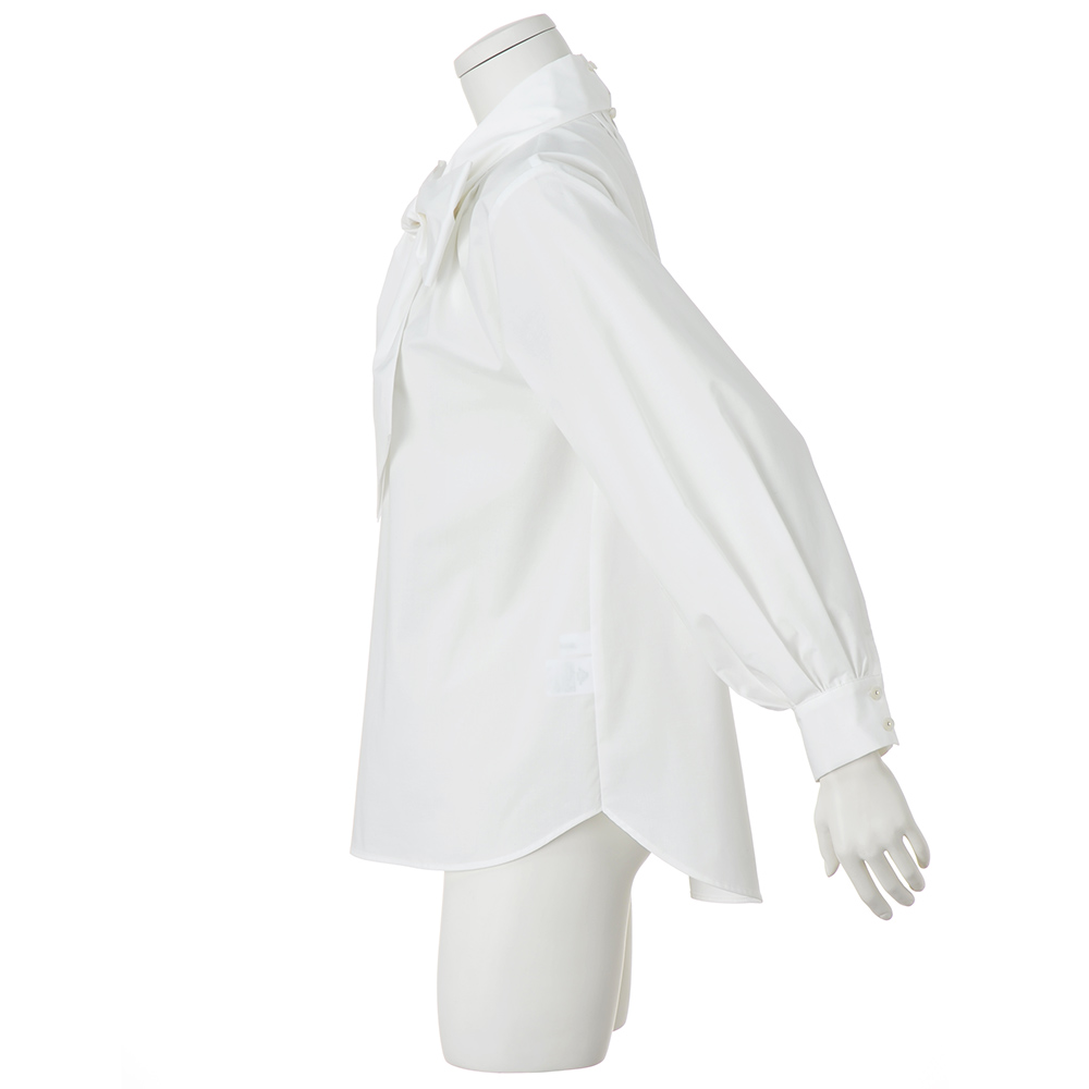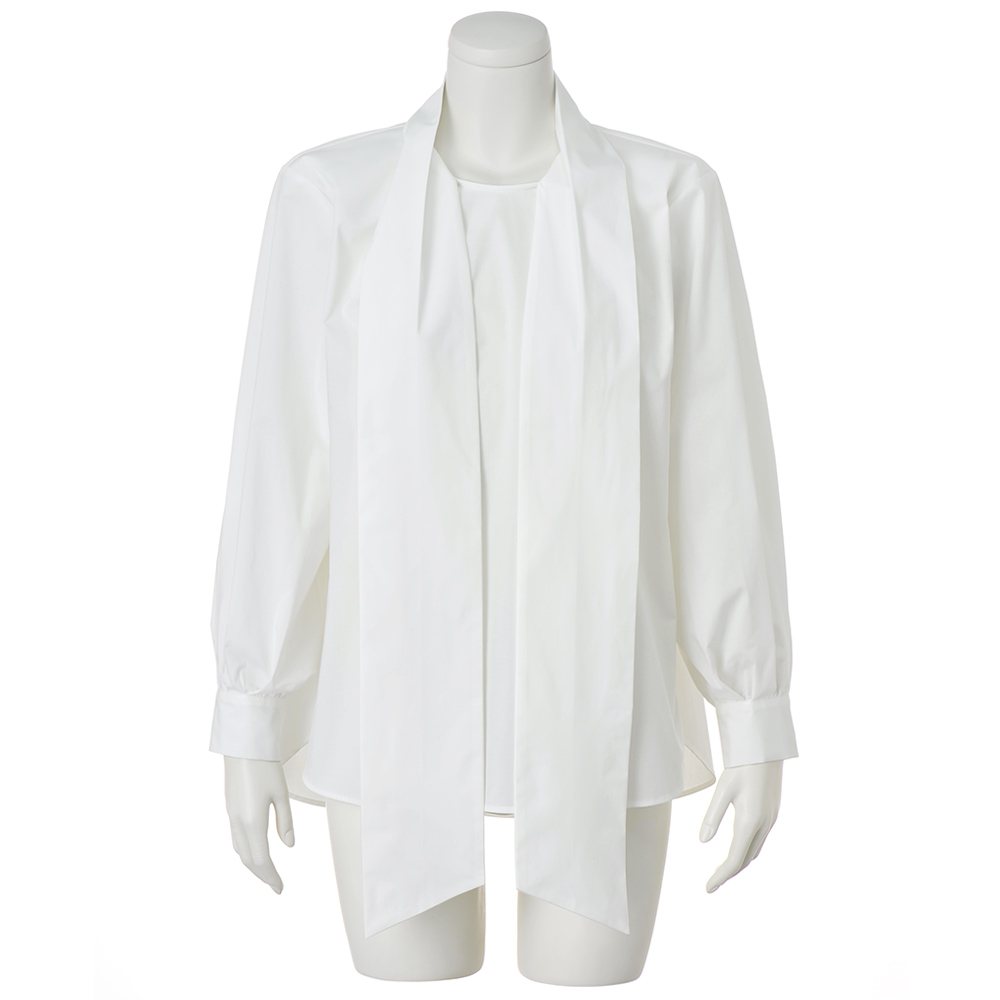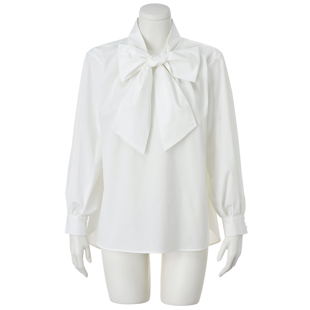 “抜け感”を楽しむ、品格きれいめスタイル毎日に寄り添いながら、きちんと感も華やかさも欲張れる。女性らしさを引き出し、品よく着映える「大人のおでかけ服」に、今年らしいエッセンスを加えました。リボンの可愛げをシックにまとう辛口フェミニンな一着ハリのある生地が、立体的なシルエットを生み、後ろタックやパフスリーブで華やかさを演出。着るだけでサマになるディテールにこだわりました。程よくハリ感がありながらも、動きやすく快適な着心地。ボウタイは、片方を垂らしても、結んでもスタイリッシュに決まります。ジャケットやワンピースのインナー使いにもおすすめの一枚です。