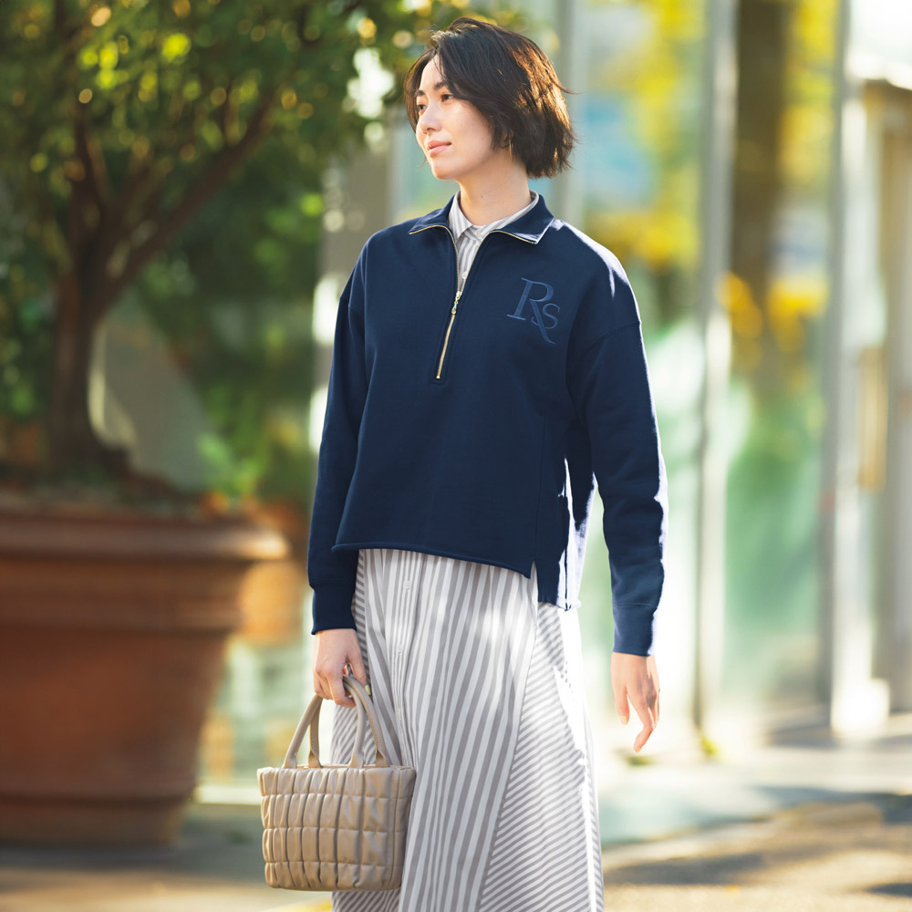 Town Sporty上品さと軽やかさを両立した“タウンスポーティ”スタイル。きれいめな装いにスポーティなアクセントを加えることで、日常にもなじむ抜け感のある着こなしに。艶があるシルケット加工の裏毛素材で、カジュアルすぎずに大人っぽい印象。ハーフジップは閉めるとシック、開けるとインナーがのぞいておしゃれ感がアップします。両サイドにはフライス生地のパネル切り替えがあり、すっきり見え。裾はカットオフとスリット入りで、さりげない抜け感を演出します。