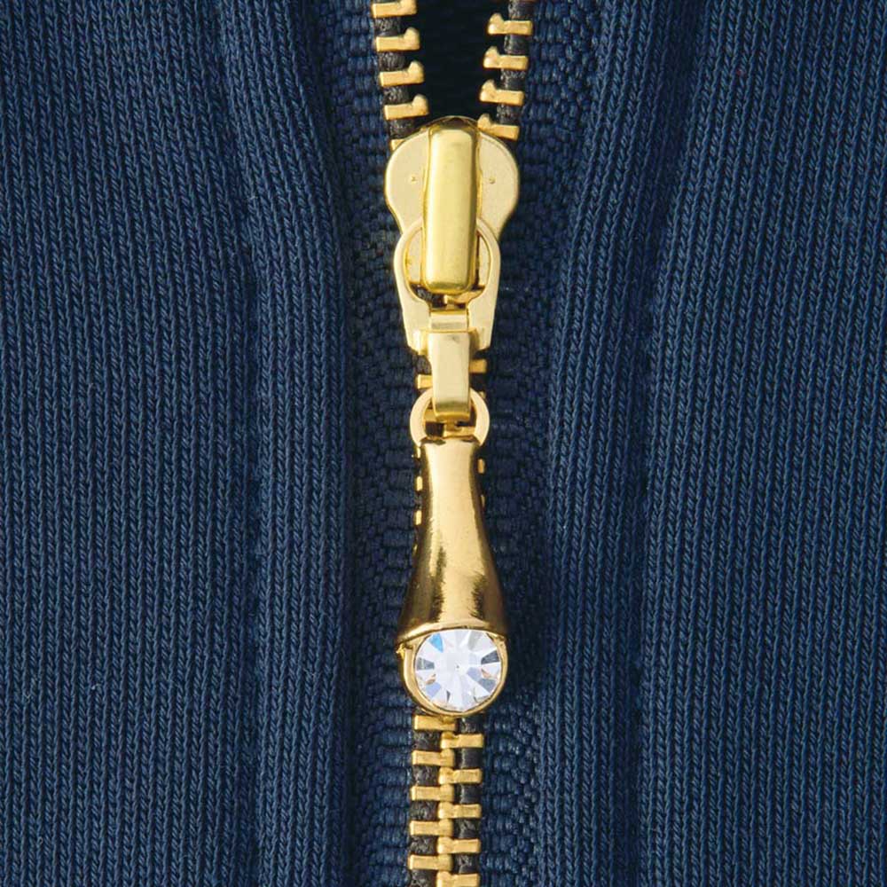 ゴールドのファスナーには、高級感があるビジューのチャームつき。