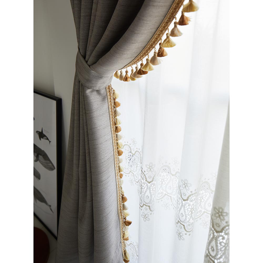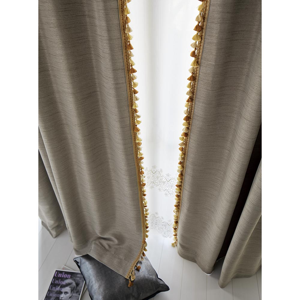 光沢感のあるシャンタン調生地と3色のフリンジが洗練されたデザインの遮光カーテン。