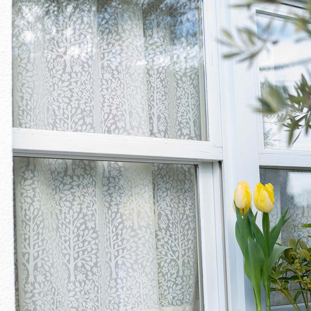 吉谷桂子さんがお届けする、「木漏れ日」を感じるレース生地木漏れ日は、木々と光が織りなす自然からの贈り物です。室内にいても、木漏れ日を感じる。こころがほっと癒される。そんなレースが出来上がりました。柄は、吉谷さんが自らデザイン。花咲く春から葉が色づき実をつけるまで、自然を楽しめるようなデザインです。幹の根元には、ビオラやデージーの小花が咲いています。一枚の布の中で四季を感じる、室内にいても自然を感じられる美しいデザインに仕上がりました。朝から夕方まで、変化する光と影の美しさを楽しんで夜明けのほんのり明るい朝の光、太陽の光量がもっとも強い昼の光、日が沈みかけたオレンジがかった夕方の光。一日を通じて変化する光の美しさを、光が生み出す模様の”影”とともに感じて。壁や床に映されたその影は、まるで一枚の絵画のよう。家の中でも光の変化を感じることで、なんだか心が豊かになる気がします。外から見ても美しい柄がはっきり出る手法で編立ているので、外からみても柄がしっかり見えます。庭作業の間も窓をみてほっこり、なんてこともあるはず。ストーリーを持つ、色【オフホワイト】まっさらな白ではなく、温かみのある黄みを帯びた、クリーム色のようなホワイト色に仕上げています。部屋は明るく、そして光を通すとやや暖色系の色味に変化する、美しい色です。