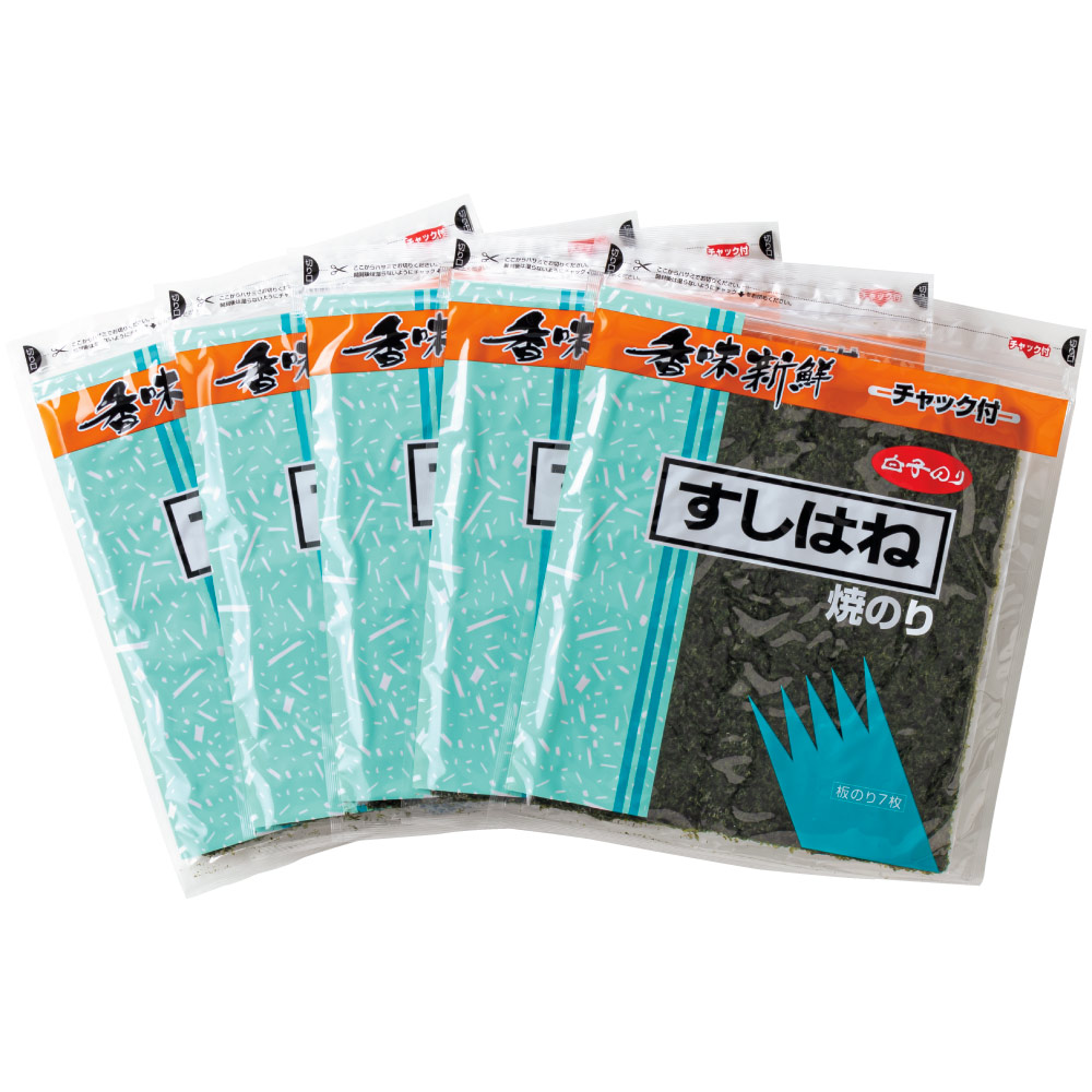 お寿司屋さんが使用するレベルの海苔が多少キズありだから、お買い得!お寿司屋さんが使用するレベルの海苔が多少キズありのためお買い得価格でご提供! 老舗メーカー「白子のり」寿司はねです。 1袋にのりは7枚入り。チャック付きで使い勝手の良さもポイントです。のり巻きやおにぎり、手巻きずしなどお好みの大きさできってお使いください。例えば、そのまま好きな具材を包めば、握らない簡単おにぎり。2つに切って手巻きずし。3つに切っておにぎり。4つに切って好きな具材をのせて手巻きご飯。8つに切ってごはんと一緒に。小さく切ってもみのり、細かくきざんできざみのりなどなど…。1枚が大きい、全型の板のりだからこそアレンジ自在です!【白子のり とは】明治2年創業、全国の海苔の入札権を持った150年超の歴史を築くメーカーです。加工海苔業界のリーディングカンパニーとして、日本の食卓を彩ってきました。「加工海苔の東日本エリアの社別販売シェア(販売額)」では、1997年から2022年まで1位を獲得しつづけているなど、長年業界トップクラスのブランドとして親しまれています。(※インテージ社調べ)。白子のり専属の海苔のプロフェッショナルによって仕入れられた国産の原料を使用のみ使用しています。旬の海苔の新鮮な味と香りをお楽しみ下さい。
