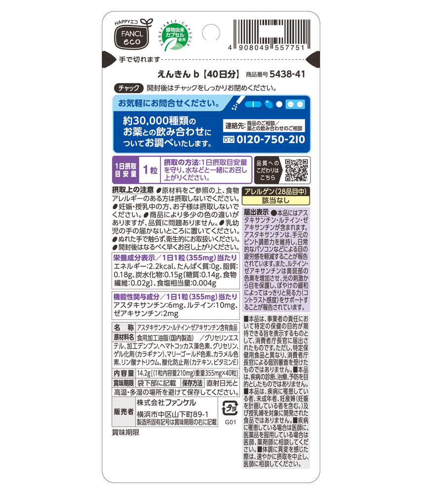 1日1粒!大人の目の複数のお悩みをサポートしてくれるアイケア新習慣※40日分単品販売合計価格よりおトク!日本初!目の機能性表示食品※※えんきん(届出番号:A7)は初めて公表された目の機能性表示食品です。こちらのえんきん(届出番号:E700)は届出表示を追加したものです。1日1粒で続けやすく、気になる目の悩みにアプローチ!※機能性関与成分による研究報告★手元のピント調節力を維持し、目の疲労感を軽減★光の刺激から目を保護★ぼやけを緩和し、はっきりと見る力(コントラスト感度)をサポート◎早めのえんきん!こんな方にオススメ・パソコン仕事で目がしょぼしょぼ。目が疲れやすい。・小さい文字が見にくい・似ている文字がぼやけて見間違えてしまうリニューアル前から好評!・メーカー累計販売個数2000万個突破※旧品2007年10月〜2020年12月末までの販売実績概算・ファンケル定期便登録者数No.1※2020年12月末におけるメーカー商品別健康食品定期便登録者数(全170商品中)●機能性表示食品【届出番号 E700】届出表示本品にはアスタキサンチン・ルテイン・ゼアキサンチンが含まれます。アスタキサンチンは、手元のピント調節力を維持し、日常的なパソコンなどによる目の疲労感を軽減することが報告されています。また、ルテイン・ゼアキサンチンは黄斑部の色素を増加させ、光の刺激から目を保護し、ぼやけの緩和によってはっきりと見る力(コントラスト感度)をサポートすることが報告されています。