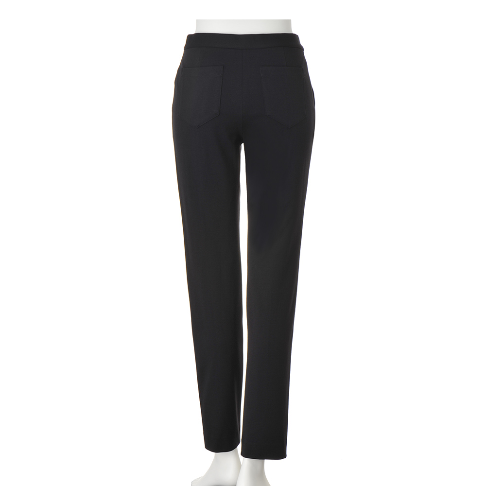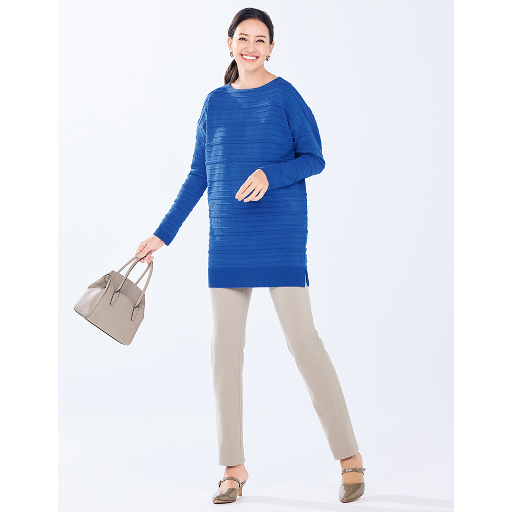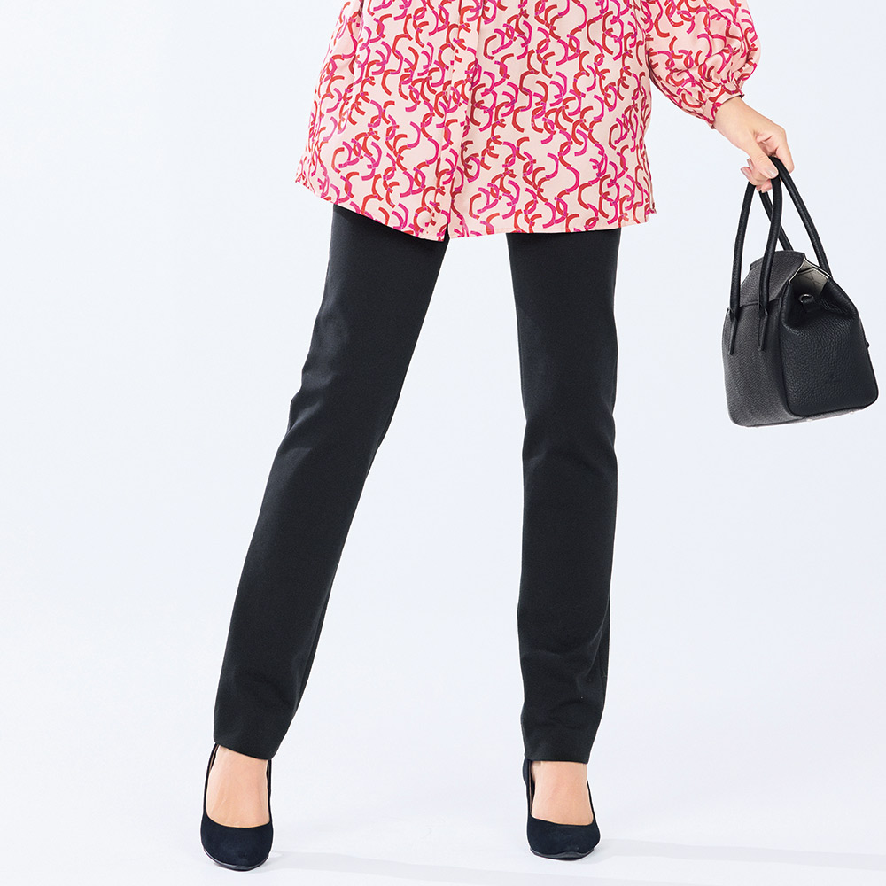 きちんと感ある美脚を追求した大人のためのスリムパンツ一度はけば、その実力に誰もが納得するロングセラーパンツ。「東レ(株)」が開発したクロスウォーム(R)素材で、吸湿発熱機能が生み出すぬくもりに加え、高いキックバック力も魅力。特殊な編み組織によるベアポンチなので、脚線を拾い過ぎず引き締まった美脚を演出。前ファスナー+ウエストベルトがきちんと感と快適性を両立します。