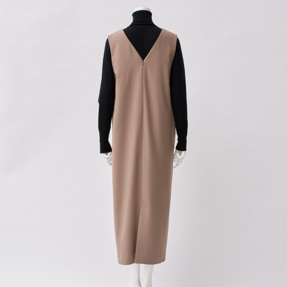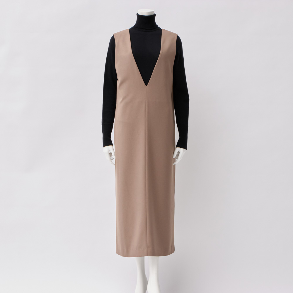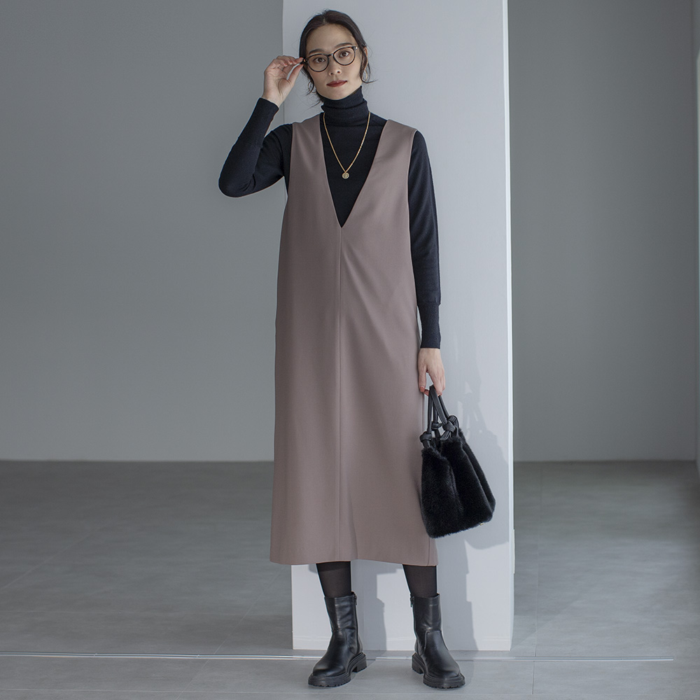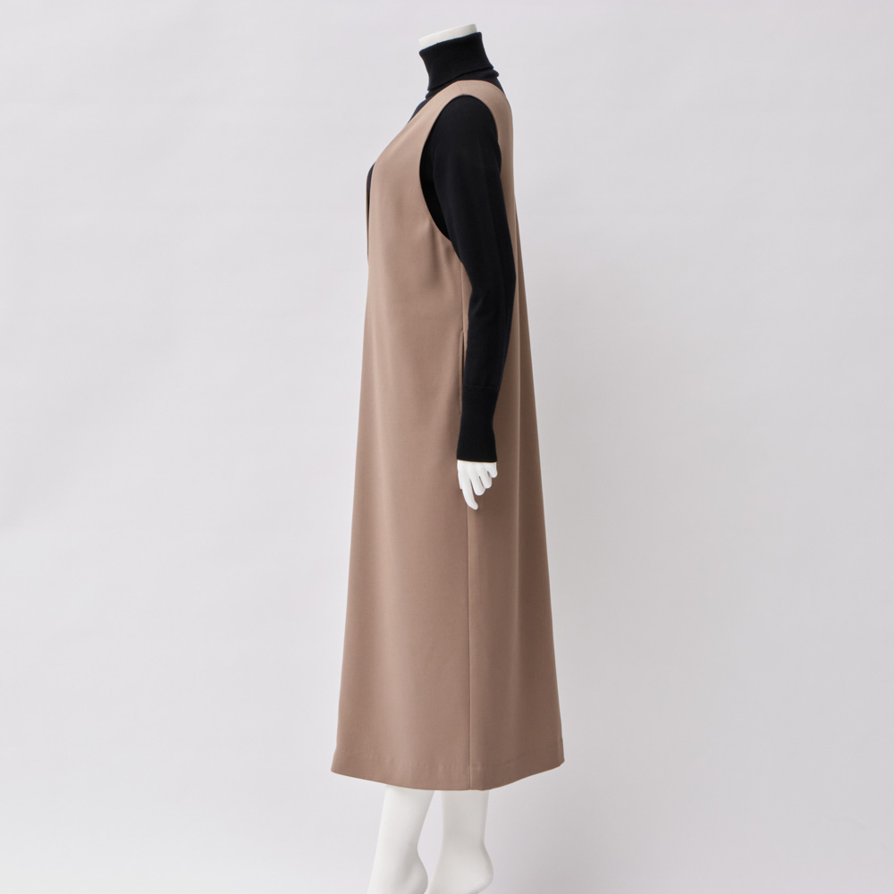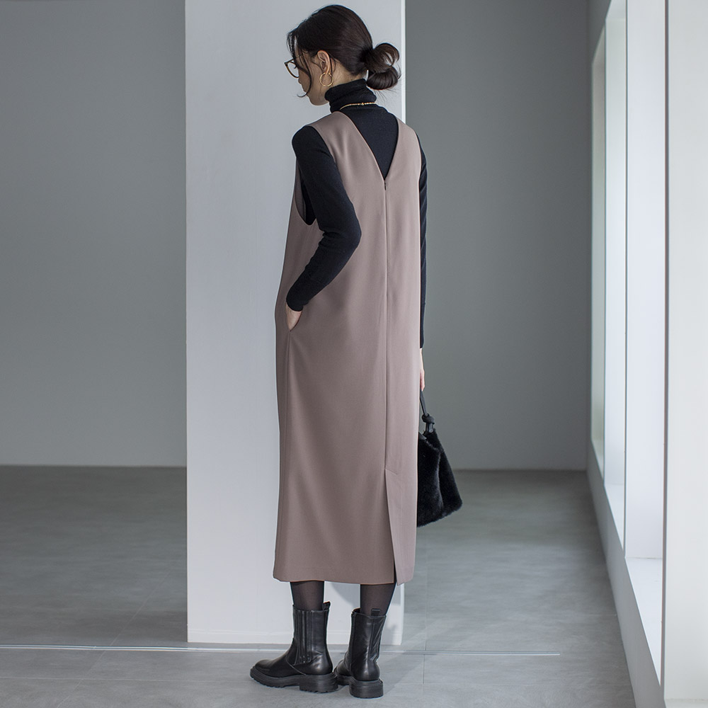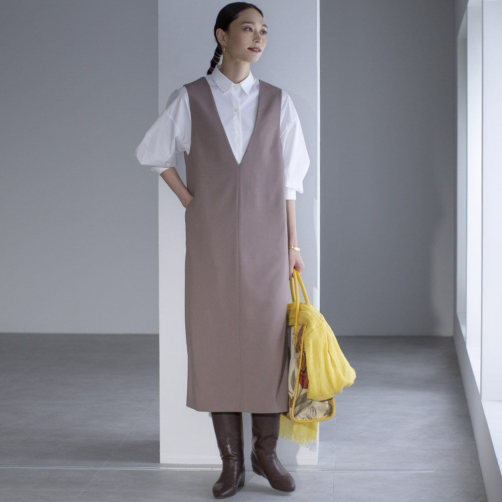 深いVネックデザインが特徴的なジャンパースカートは、後ろもV開きにすることで抜け感がり、スタイリッシュな着こなしが楽しめます。身体のラインを拾わないストレートシルエットと程よい肉感のあるツイル素材なので、インナー次第でオールシーズン着用可能。シンプルながらも大人っぽいフォルムで、上品な印象を与えます。裾はベント入りで足さばきも◎。Tシャツ、ブラウス、ニットなど、様々なレイヤードをお楽しみください。