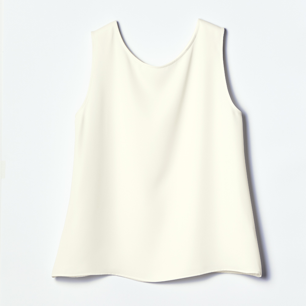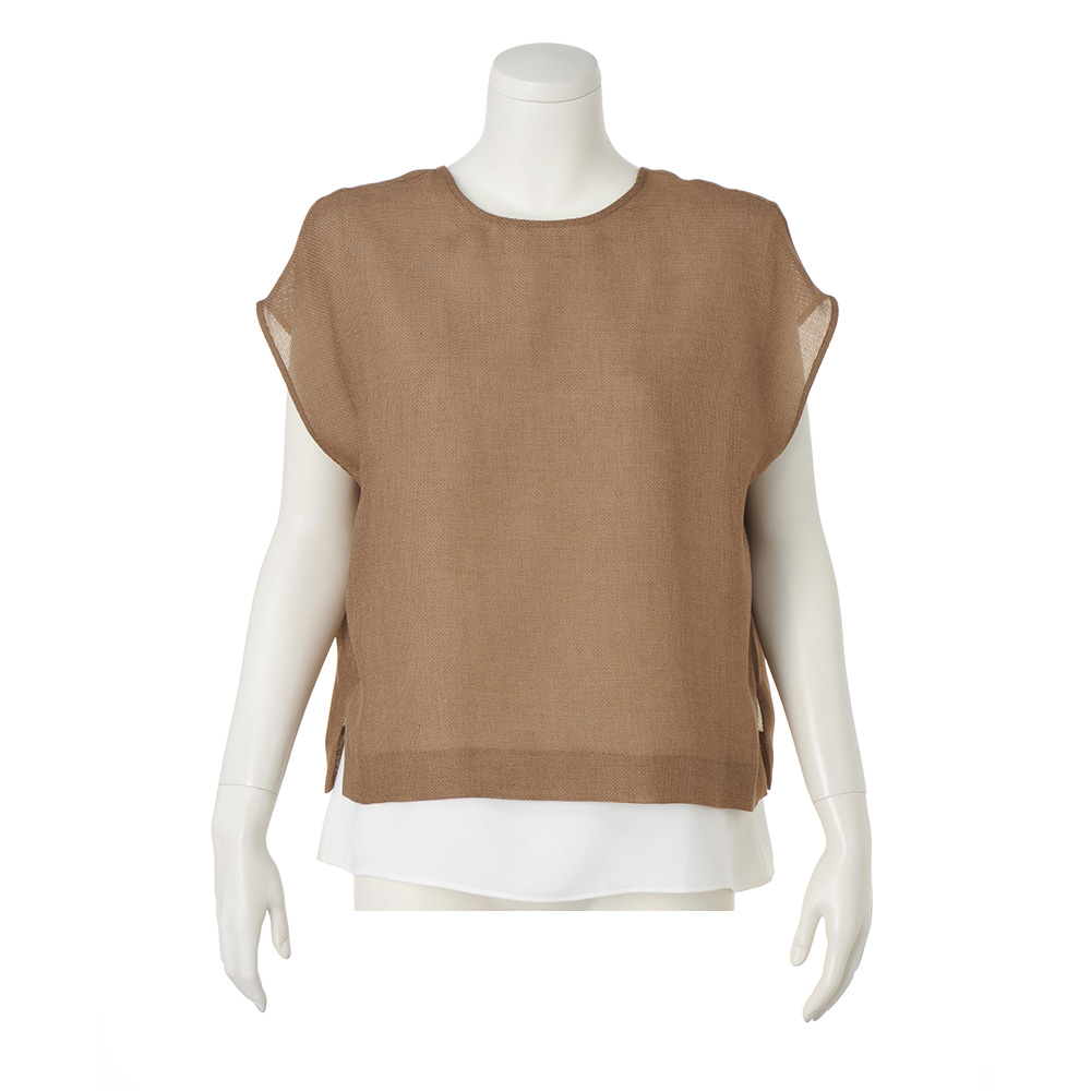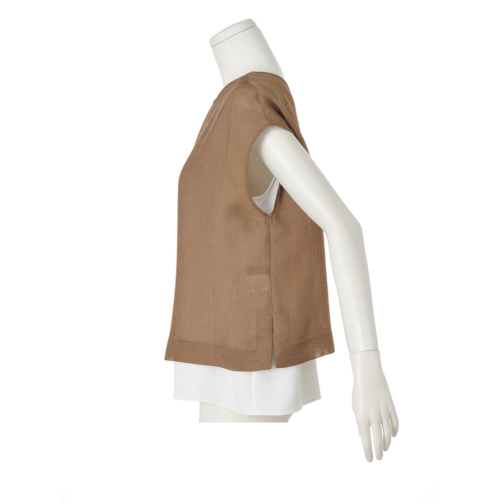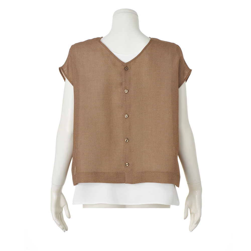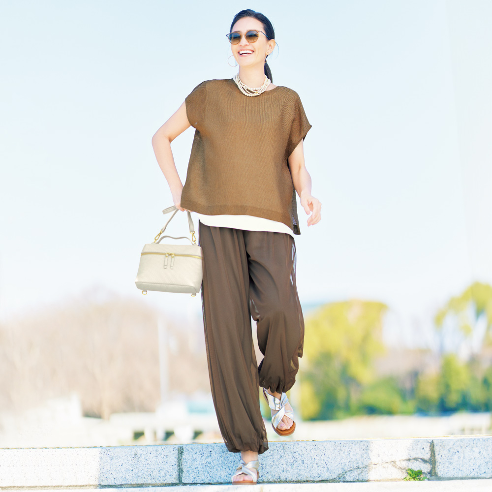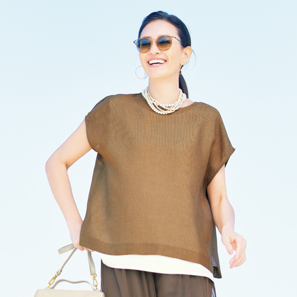 素材と色の緩急が織り成す、大人モードなカジュアル。エアリーな素材を重ねることで生まれる奥行きとニュアンスを、気負わず楽しめるモードな着こなし。トップスは、メッシュ織りの透け感とシャンブレーの優しい陰影が涼し気なプルオーバーとインナーをセットにしてお届け。ボクシーなフォルムの後ろは、浅いV開きにボタンを並べた本開き仕様で、裾から覗く白のトーンアップ効果も絶大です。後ろVネックからはインナーの白が少し覗いて爽やか。前後逆にジレ使いもできる3WAY。