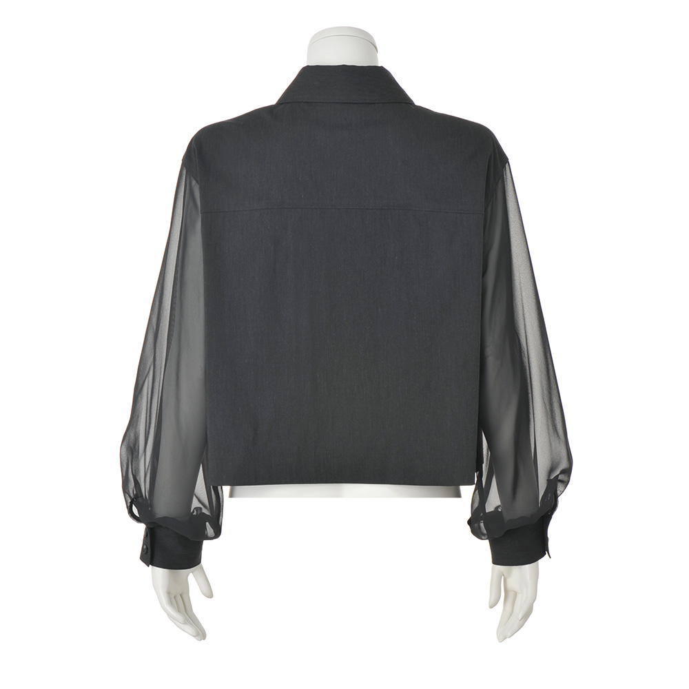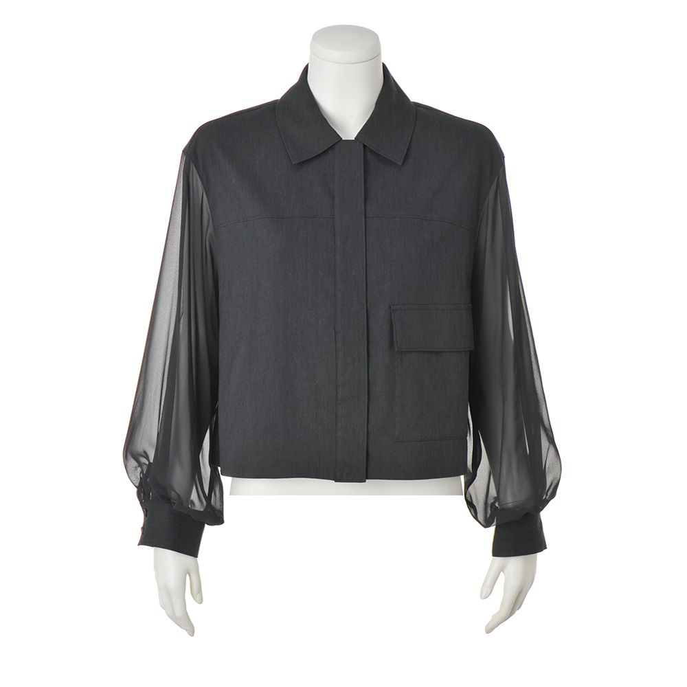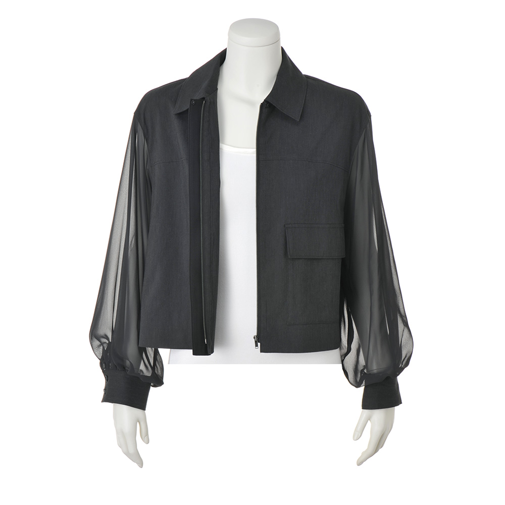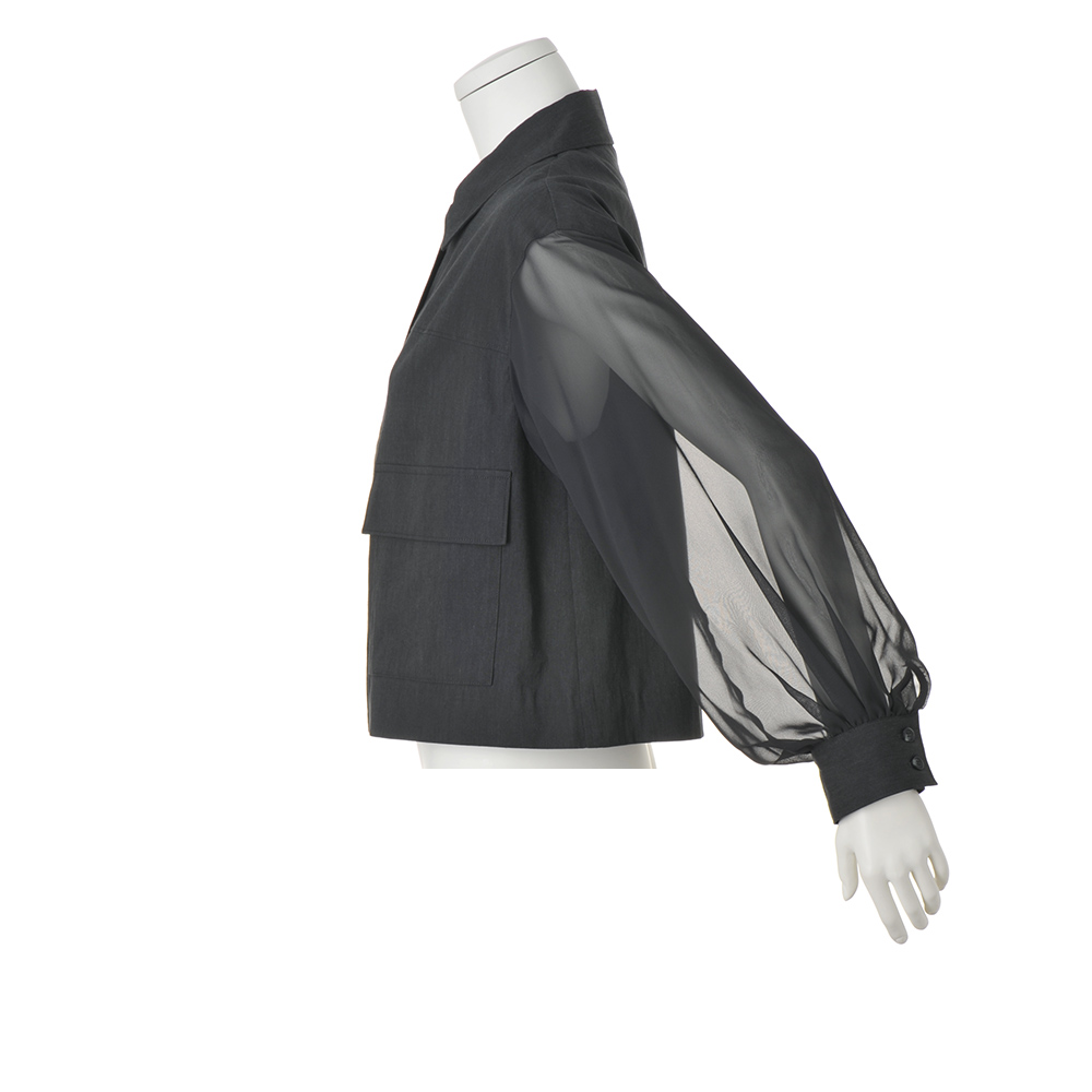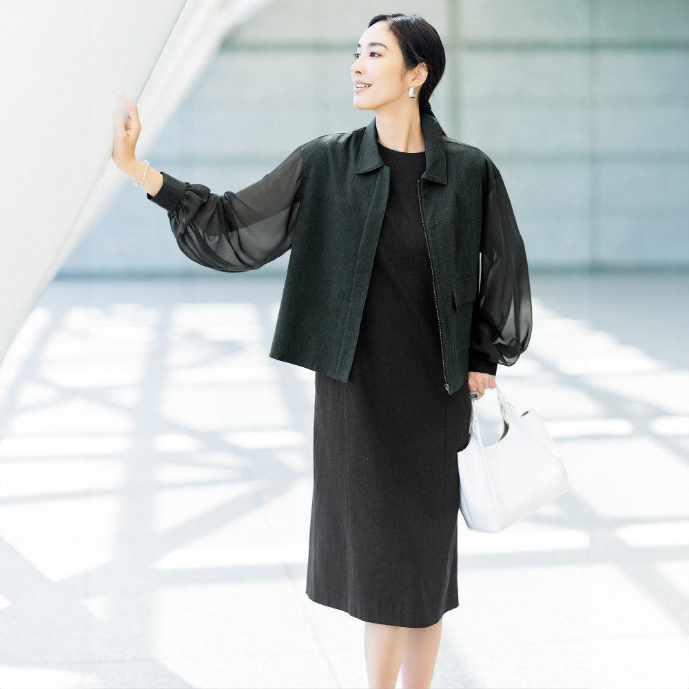 ジャケットとワンピース(商品番号384701〜384702)をセットご購入で5%OFF!※一部のみのキャンセル・返品はお受けできません。多様な「夏の黒」を重ね、ポジティブに季節を楽しむクールで洗練された印象を持つ黒。素材と色に拘ったジャケット+ワンピースで、サマーブラックのこなれ感を進化させました。限りなく黒に近い「ダークチャコールグレー」のジャケットは、ニュアンスある表面感としなやかさが魅力の夏素材に、袖部分をシフォンで切り替えたもの。ステンカラーやポケットのマニッシュさと、肌の透けるボリュームスリーブのコントラストが爽やかな色香を漂わせて。自然なゆとりあるフォルムも、今どきの短め丈でバランスよく。