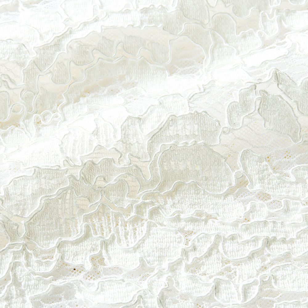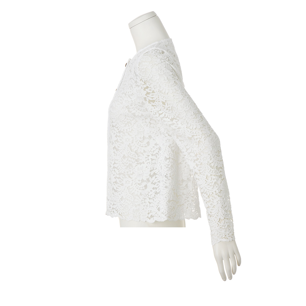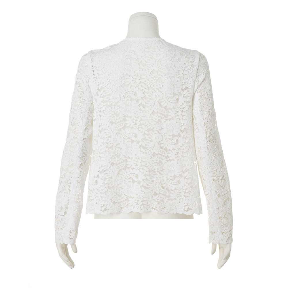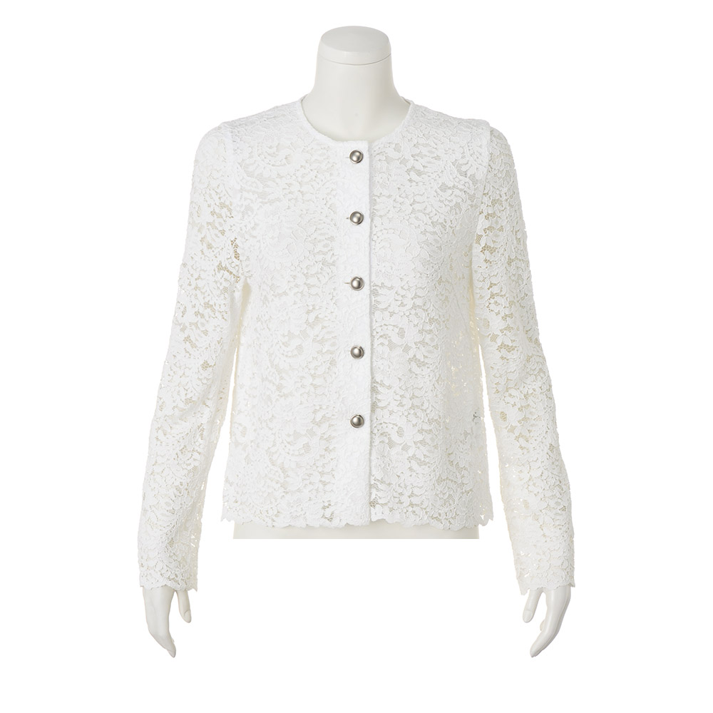 イノセントなホワイトレースを気負いなく軽やかに纏うナチュラルボタニカルの麗しいレースをそのまま纏う、贅沢なジャケットのご紹介です。レースのコード部分は極細レーヨン糸の束を使用し、ソフトな風合いとくっきりした立体感を表現。レースのスカラップを活かした袖口や裾も、エレガンスに拍車をかけます。襟や前端の見返しはグログランテープでクチュール感ある仕立て。レースの透け感や風が通り抜ける心地よさを感じていただきたくて、裏地は柔らかなチュールをセレクトし、身頃のみセット。裾はふらしにして、レースの透け感をアピール。シルエットはモダンなストレートラインで、前を開けて着用してもすっきり。マットシルバーのドーム型ボタンが甘さを抑え、クールなデイリーアウターに。