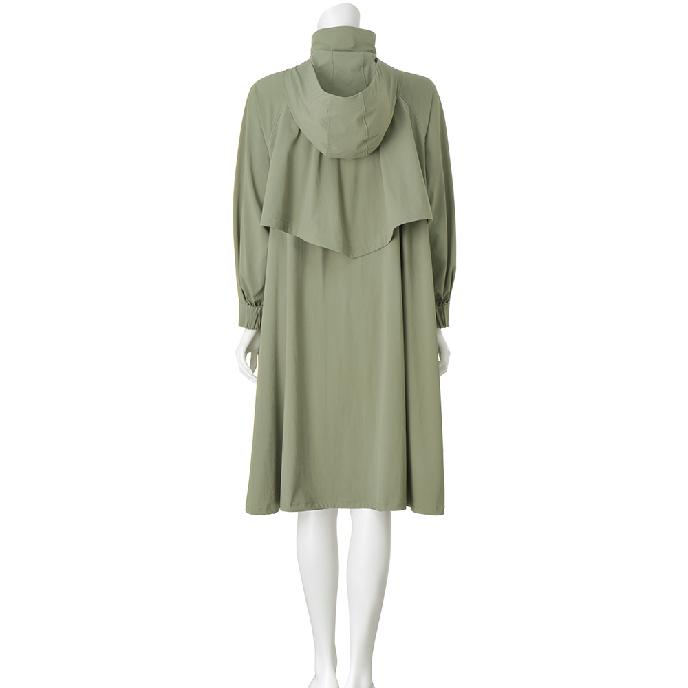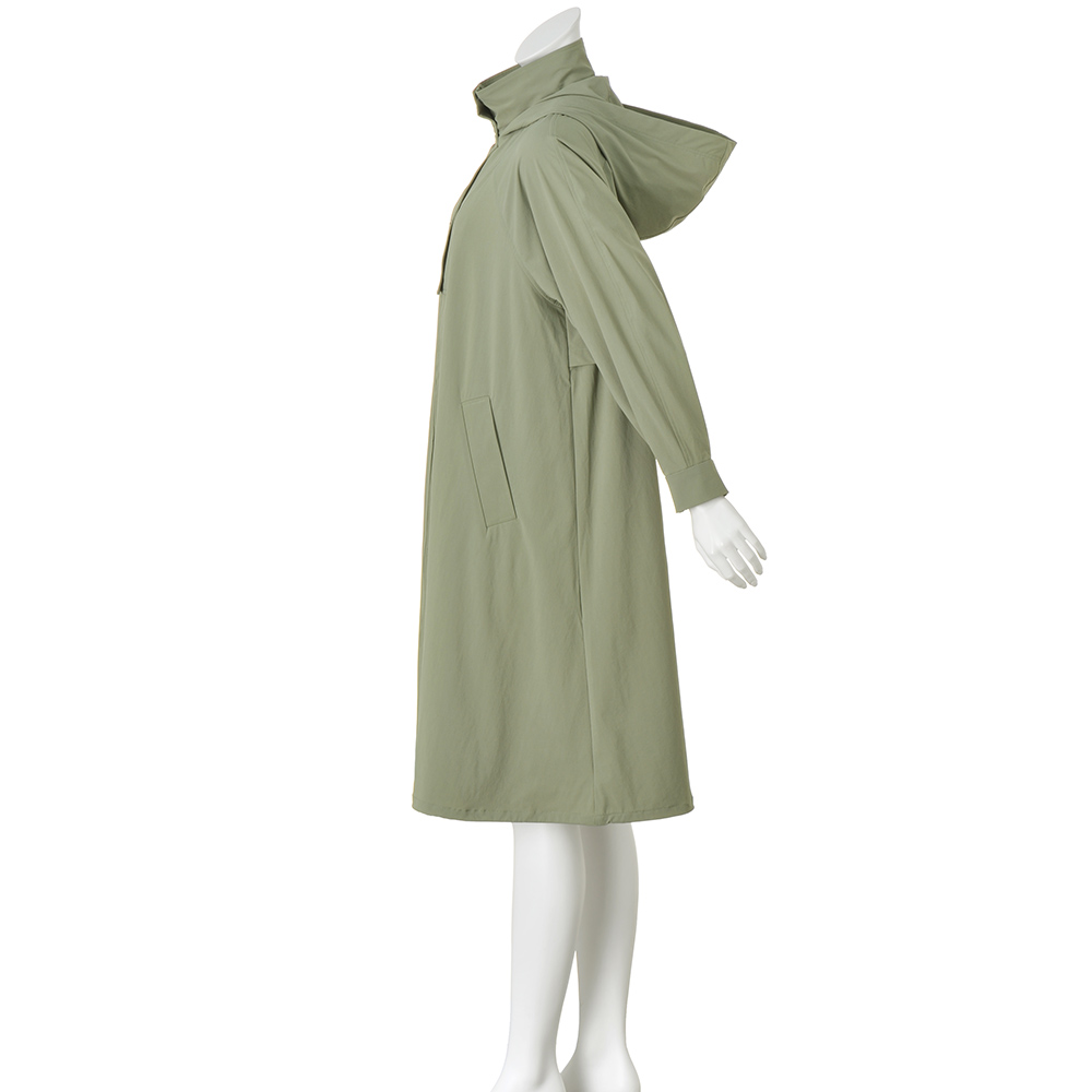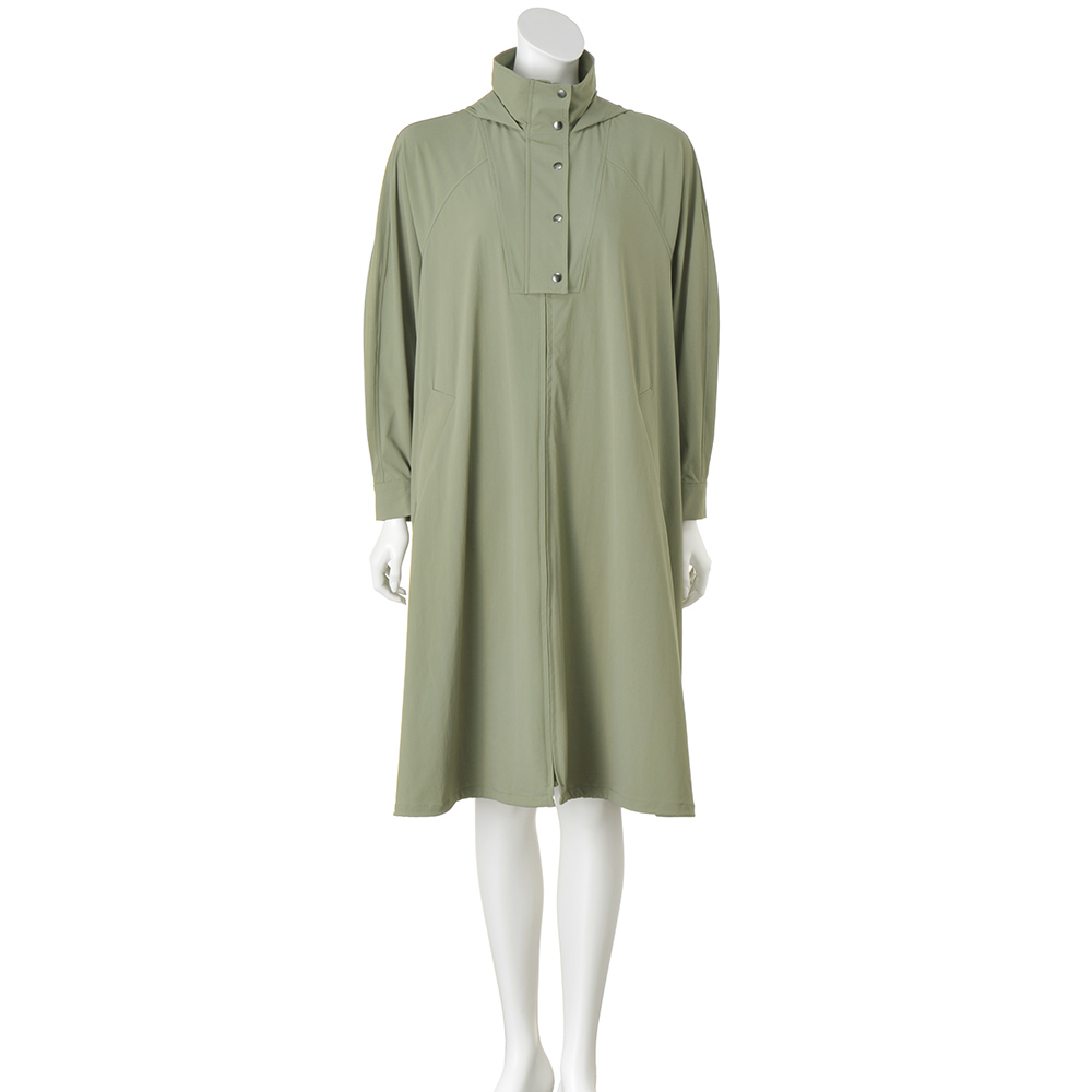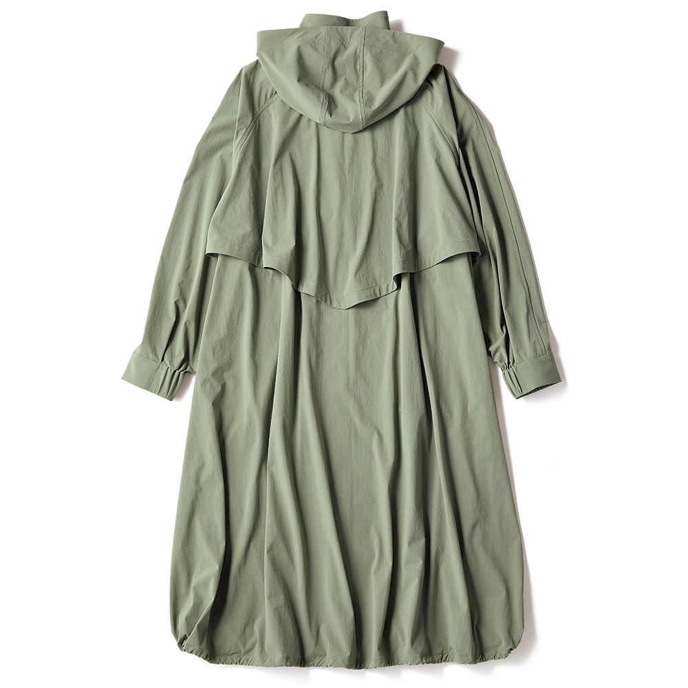 スポーティーカジュアルの最適解。スポーツテイストを大人の日常着に落とし込むなら「きれいめシンプル」でなじみやすく。日常をアクティブに彩るスポーティーコート。秋の長雨の時季にも活躍する、軽やかなはっ水ロングコート。生地は端境期に着やすい薄さと軽さ、しなやかさとドライタッチ、さらに4WAYストレッチまで兼備したはっ水素材。新鮮なデザインにしたくて、高めのスタンドカラーにパッと目を引く前立てのドットボタン付きタブとブザム切り替え、ドレープが印象的な長めのアンブレラヨークなど、拘りのディテールを盛り込みました。広めの身幅とラグラン切り替え、バサッと着られる分量感のあるAラインシルエットは、裾にぐるりと配したドローストリングを絞ることでバルーンシルエットにも。袖口は部分ゴム仕様で、袖をさっとたくし上げられます。
