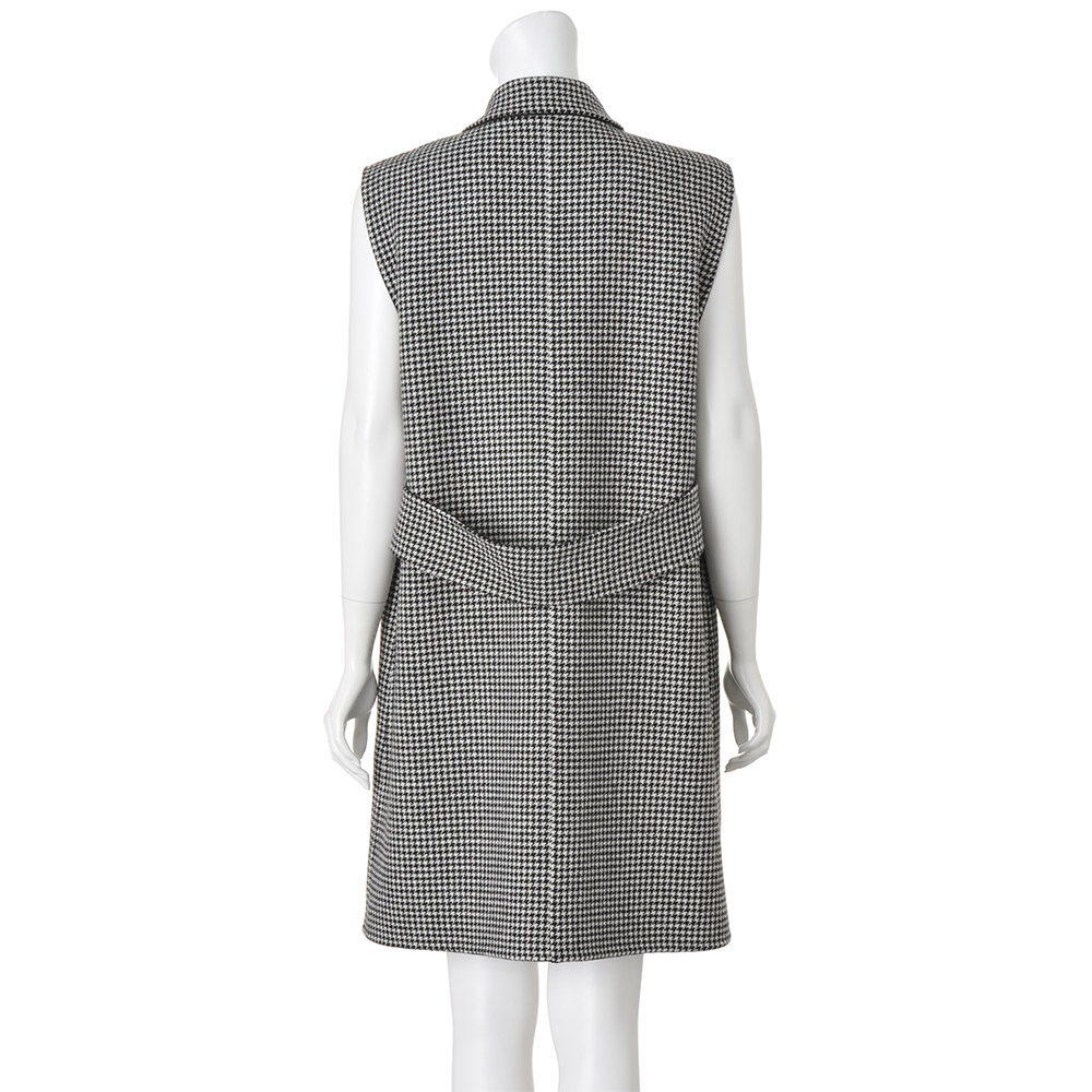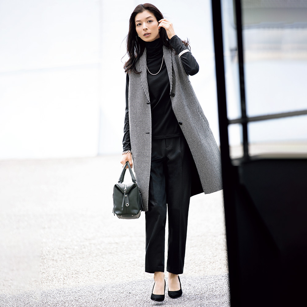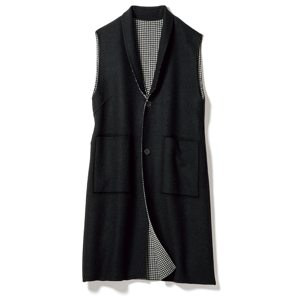 ELEGANCE CAREER 働く私を、軽やかに刷新!仕事だからと真面目すぎてはつまらない。冬も印象的な色や柄を軽やかに取り入れて、働く私をブラッシュアップ!2つの顔を楽しむリバーシブルジレキャリア女性たちから好まれる理由は、ジャケットよりも真面目すぎず、コートのインにも着やすいから。人気のロングジレを今冬は、イタリア「LA TORRE」社の千鳥柄×黒無地のダブルフェイス素材で、両面それぞれ着用できる魅力的なリバーシブルに仕立てました。両面ともデザインはすっきり着こなせるショールカラーのシングルフロント、バストダーツで立体感を出したストレートシルエット。千鳥柄面にのみバックベルトがあしらわれていたり、ポケットデザインが各面で異なっているのも着分けの楽しみに。縫い代を内側に折り畳んで手まつりした高度なリバー仕立てならではの、美しさと軽い着心地にもきっと満足していただけるはず。≫ POINTモノトーンの千鳥柄×黒無地の、両面“主役”のリバーシブル。千鳥柄面には箱ポケット、無地面にはパッチポケット付き。