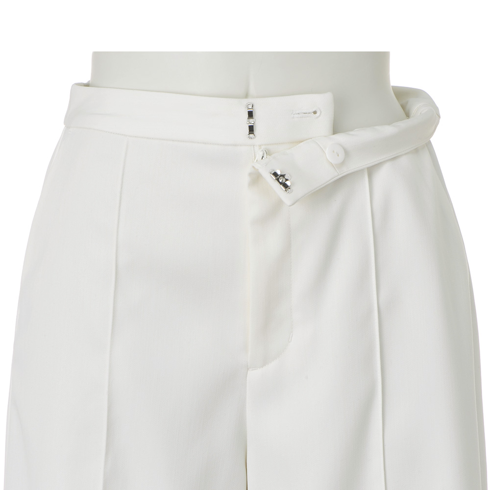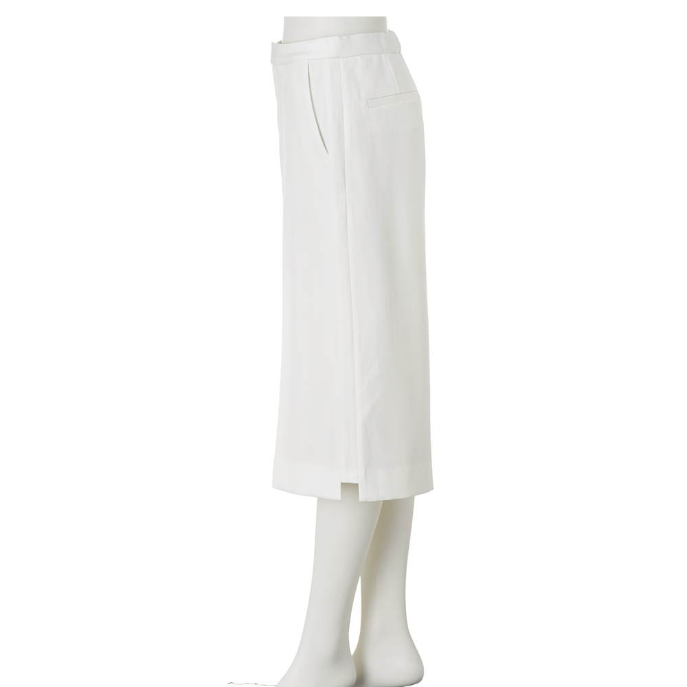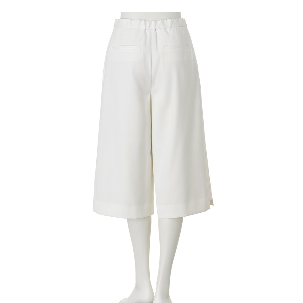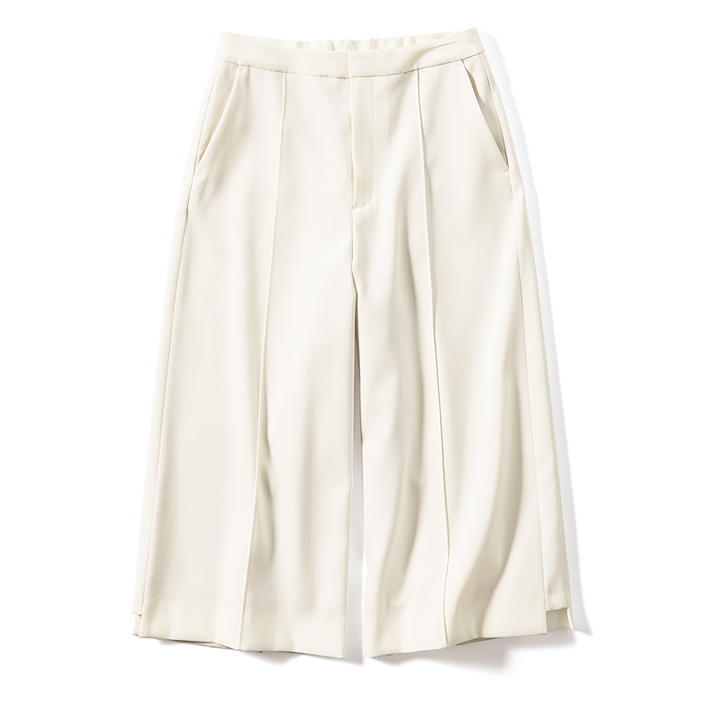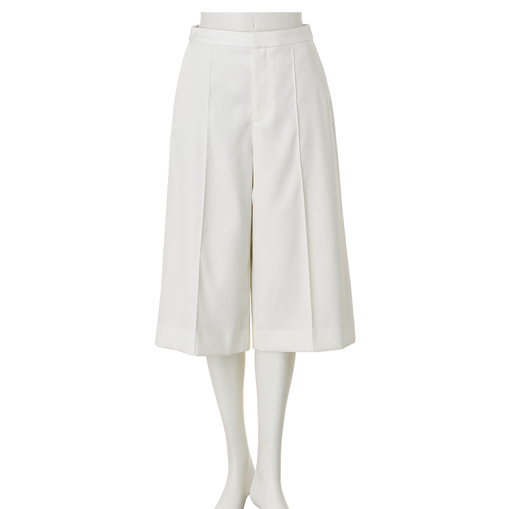 Parisien Style街に映えるフレンチシック。シンプルで上品だけど、遊び心や冒険心も忘れない。ポジティブにお洒落を謳歌するパリっ子たちをお手本に、この春はパリジャンスタイルを纏いませんか?洗練のカギとなるのは、きちんと感と遊び心のさじ加減。春の訪れを予感させるオフホワイトのキュロットパンツ。素材は膨らみ感とハリ感を併せ持つ、仕立て映えするウール混ダブルクロス。フロントのピンタック、脇線をマチ状に切り替えたさりげない縦ライン効果、切り替えを利用した裾のステップ風ヘムで抜け感を演出。≫ POINT高級感のある素材とロングブーツ合わせも決まる上品な丈感に拘ったハーフパンツ。後ろウエストのみゴム入り。