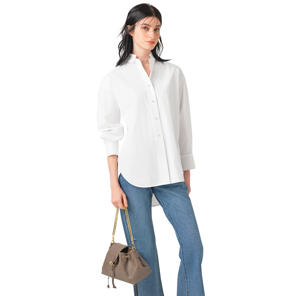 襟アレンジ コーディネート例/春夏に欠かせない白シャツは一歩先ゆく小襟デザインで旬をマーク。