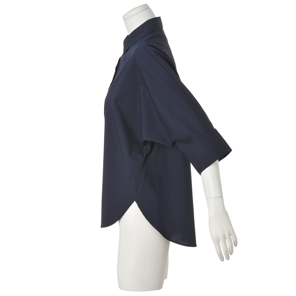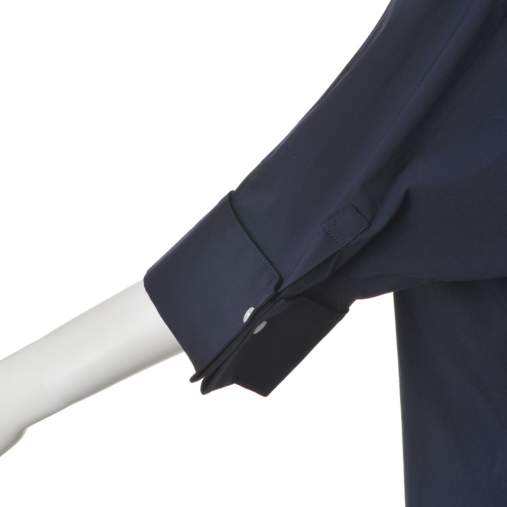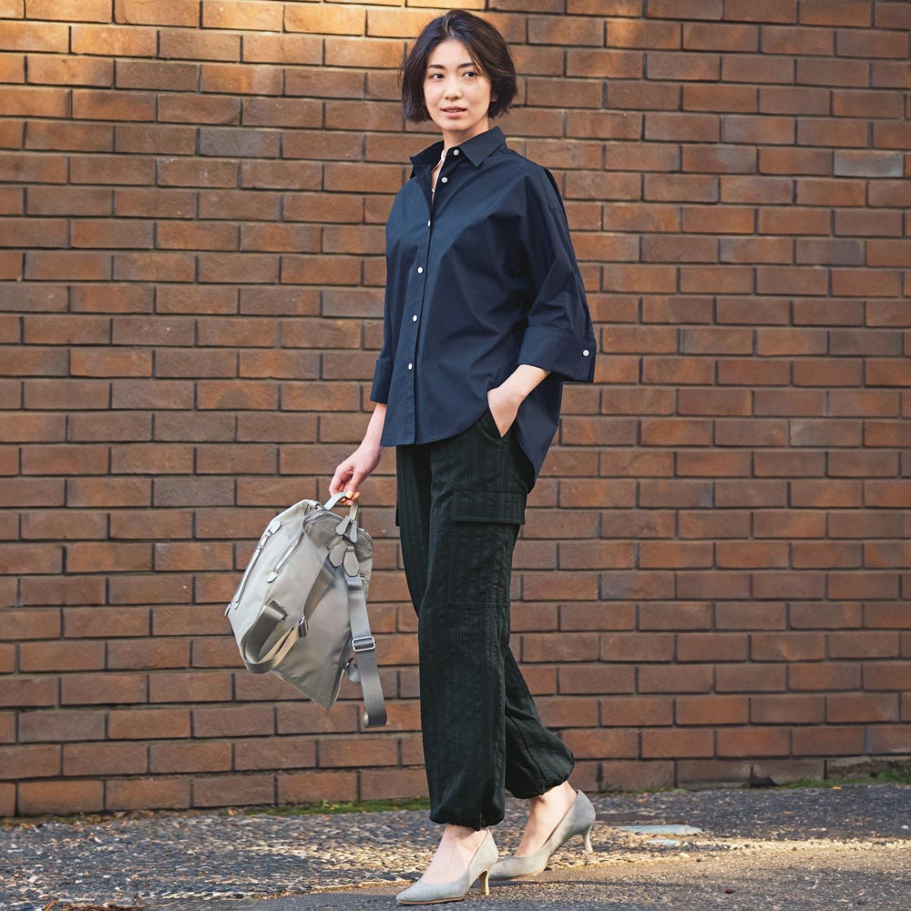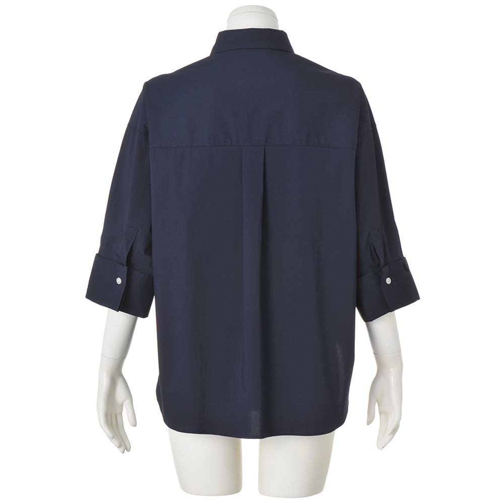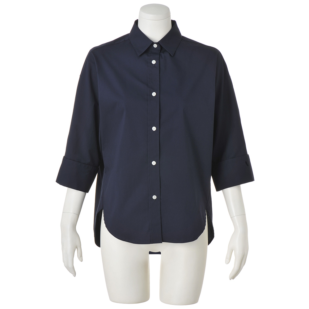 Town Sporty上品さと軽やかさを両立した“タウンスポーティ”スタイル。きれいめな装いにスポーティなアクセントを加えることで、日常にもなじむ抜け感のある着こなしに。接触冷感機能つきのコットン混ブロードシャツ。適度なハリがあり、軽くてすっきりとした風合いです。ドルマンシルエットにワイドカフスを組み合わせ、折り返した袖口は広げるとスリット風のデザインに。前後差のある着丈がヒップまわりをカバーし、ボトムアウトでもサマになります。爽やかな配色ボタンがアクセントに。