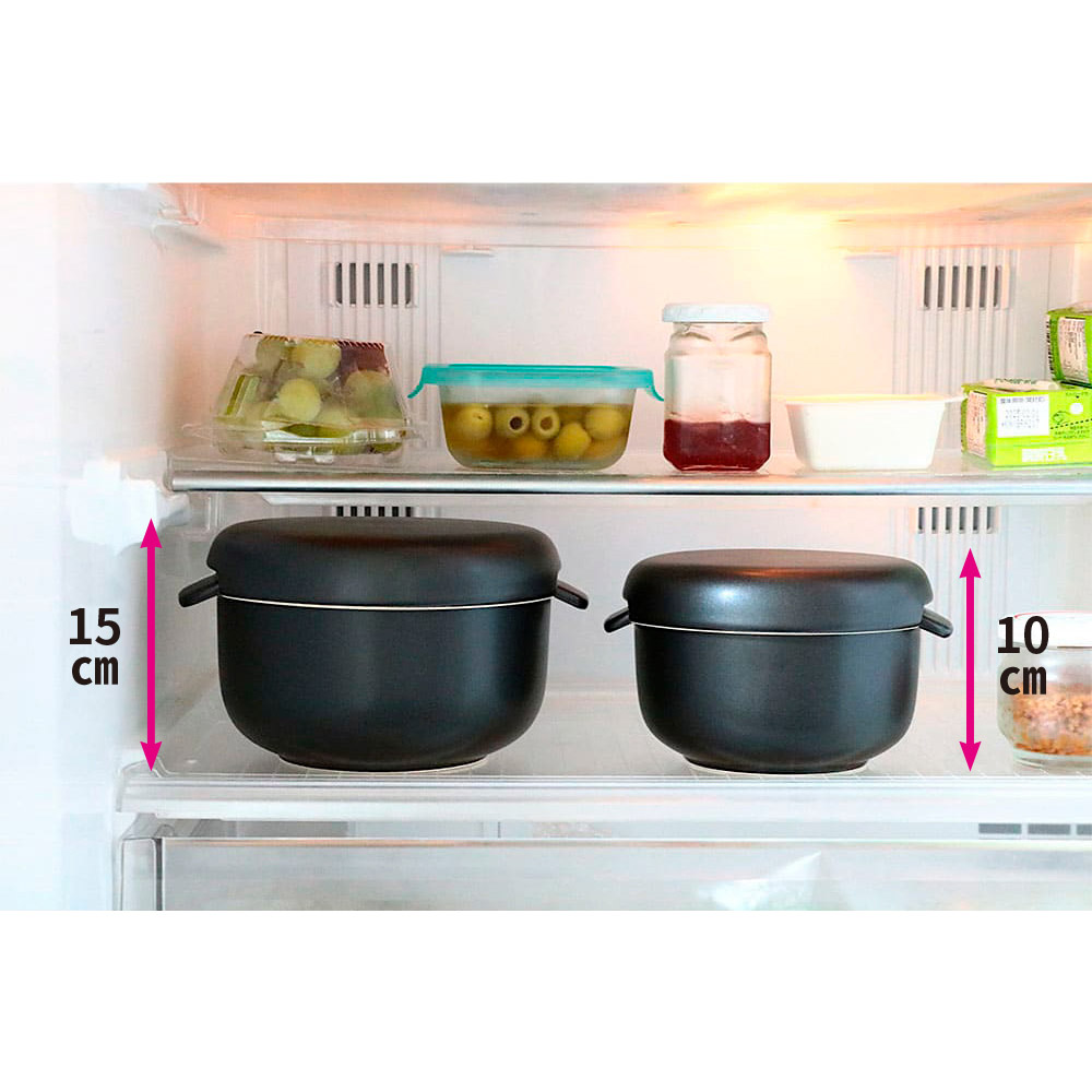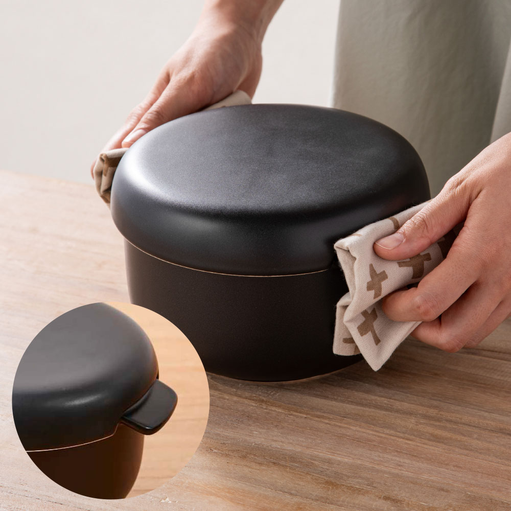 炊飯器の保温機能は便利だけれど、入れっぱなしだと味が落ちるし、ラップに包んで冷凍も味気ない。そんな人におすすめの陶器のおひつです。炊き立てのおいしさをキープ!温め直しもこれ1つ。萬古焼の優れた吸水性を生かしたおひつ。炊き立てのごはんを入れると余分な水分を吸収しておいしく保存。電子レンジで温めると、その水分がごはん1粒1粒にしっかり戻り炊き立てに迫る美味しさに。すぐに食べないごはんは、この陶器のおひつへ。ごはんが炊き上がったら、いま食べない分を炊飯器から移しておくだけ。いつでも炊き立ての味を楽しめます。水分を逃しにくいふたで、電子レンジにも対応。ふたがピタッと閉まる構造で、そのまま電子レンジもOK。いちいち容器を移し替えたり、ラップをする手間もありません。持ち運びしやすい、取っ手付き。電子レンジで加熱したアツアツの状態でも、安定して取り出せます。下向きで持ちやすいので食卓への移動もスムーズ。忙しい朝も満たされたごはんを手軽に。夜のうちに炊いたごはんをこの陶器のおひつに移しておけば、あとは朝起きてチンするだけ。手間なく大満足の朝ごはんが楽しめます。ヒミツはふた裏にあり!老舗窯元ならではの工夫。萬古焼の特徴である耐熱・耐久・吸水性の高さに加え、「棚」と呼ばれる段をふた裏に設けることで密閉性がアップ。ごはんを保湿しながら保管できるのはもちろん、電子レンジでの温め直しも上手にできます。冷蔵庫にもすっきり収まるコンパクトサイズ。左:2合用、右:1合用。家族構成や用途に合わせて選べます。