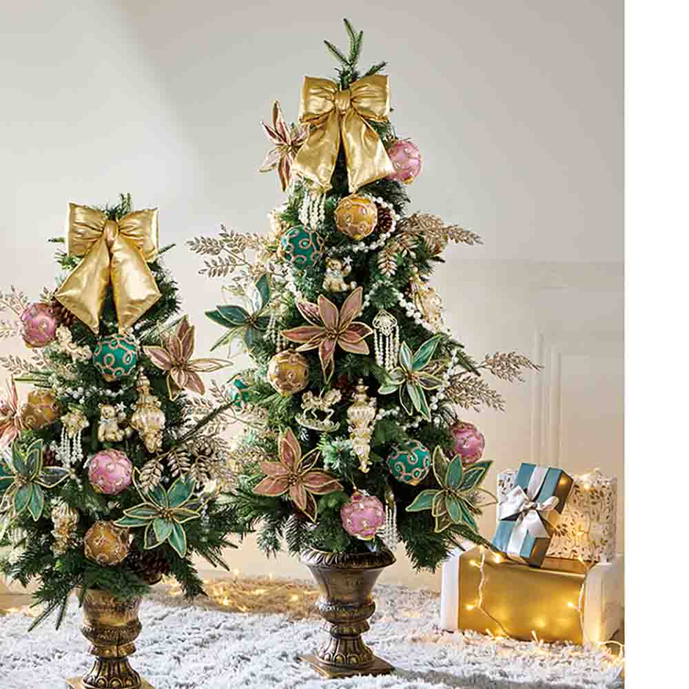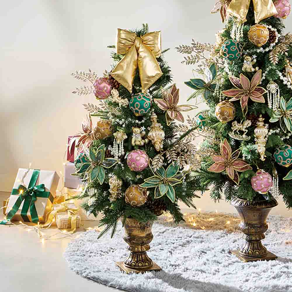 可憐に、シックに、きらめくツリーでリュクスな聖夜を。ディテールにこだわった高級感のあるツリーに、パール&オーロラがモチーフのキラキラのオーナメントをセットしました。大人シックなカラートーンと可愛さのバランスが絶妙です!オーナメントには、大きくボリューム感のあるリボンがあり、ツリーのアクセントになっています。リボン単体でドアなどに飾っても良いです。オーロラストーンがあしらわれたリーフオーナメントは、キラキラと煌びやかでボリューム感も加わるので、ラグジュアリな印象になります。パールのオーナメントも今どき感があって素敵です!約180度〜220度ぐらいでつけるのがおすすめです!飾りつけもウキウキするクリスマスになると思います♪【今回準備数】高さ120cmタイプ 20点【今回準備数】高さ150cmタイプ 20点