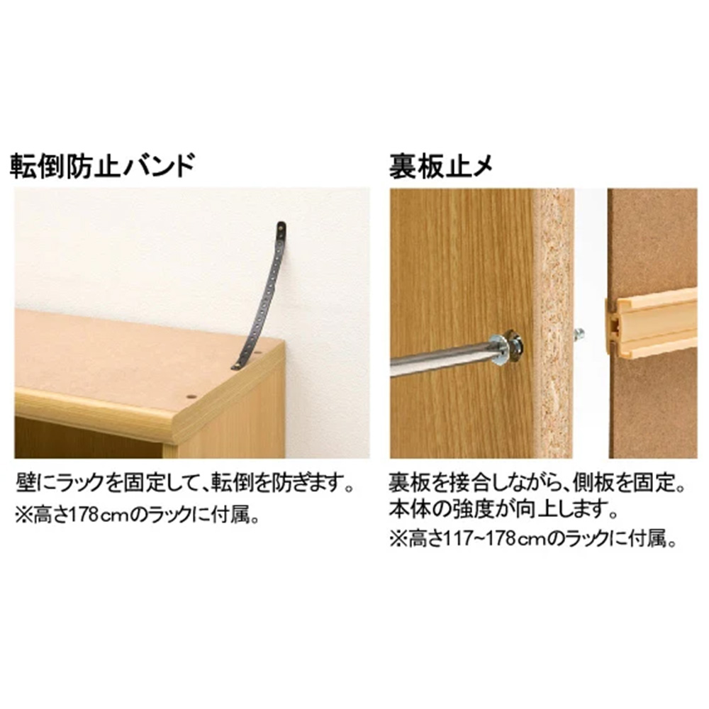 【豊富な色サイズ】【薄型省スペース】【日本製】シンプルデザインでスッキリとした印象の薄型ブックシェルフ。ホルムアルデヒドの発生を最小限に抑えたグレードの素材(F☆☆☆☆)を使用しているため、お子様のいるご家庭でもおすすめです。探しやすく大量収納できるオープンタイプ。豊富なサイズ展開で、スペースにぴったりのタイプをお選びください。4タイプの木目調と、ホワイトの計5色展開です。”全段棚調整”と”豊富なサイズ”で効率収納出来る本棚「空間の有効活用」と「無駄の無い収納」がコンセプト。豊富な色・サイズ展開でどんなお部屋にも合う収納が見つかります。ポイント(1) 棚が全段可動するから無駄なすき間を生まない!棚が全段可動式なので、収納物のサイズがばらばらでも最大限効率良くたっぷり収納できます。好きな位置に棚をセットしてしっかり固定出来るので強度も安心です!ポイント(2) 豊富なサイズ展開で、スペースを無駄無くかしこく使えるアイデア収納!豊富なサイズとシンプルなデザイン、5色のカラー展開で、設置場所に合わせたお好みの組み合わせをお選びいただけます。ポイント(3) 日本製ならではの細やかな気配り可動棚によくある、ただ水平に差し込むだけの棚受けではなく、ネジで本体にしっかり固定した上で可動棚を垂直に受け止める「フリーストップ棚受」(可動固定棚のみ)、側板と裏板をしっかり固定する裏板止メ仕様を採用し、本体の強度と棚板の耐荷重を高めています。また、高さ178cm以上のタイプには転倒防止金具が付属します。職人が作るこだわりの日本製ホルムアルデヒドの発生を最小限に抑えたグレードの素材(F☆☆☆☆)を使用し、熟練の職人が日本の技術で丁寧に仕上げています。