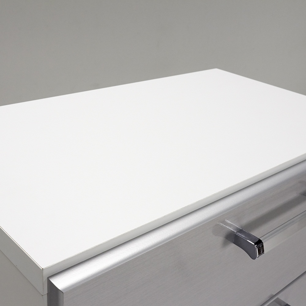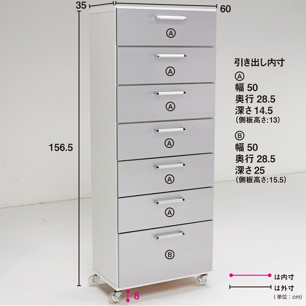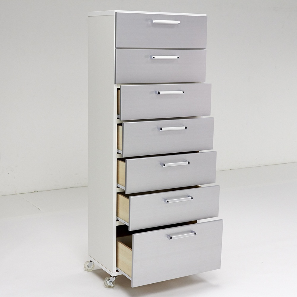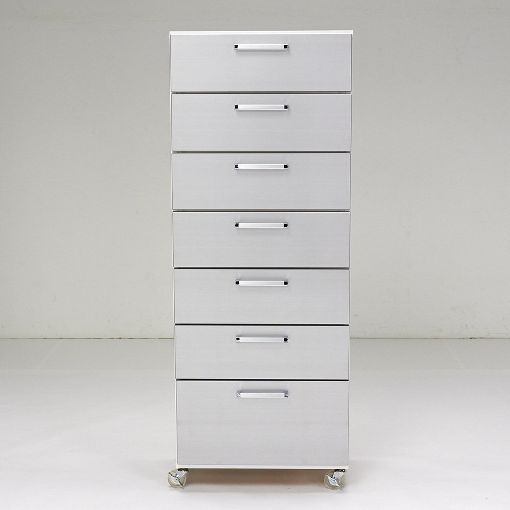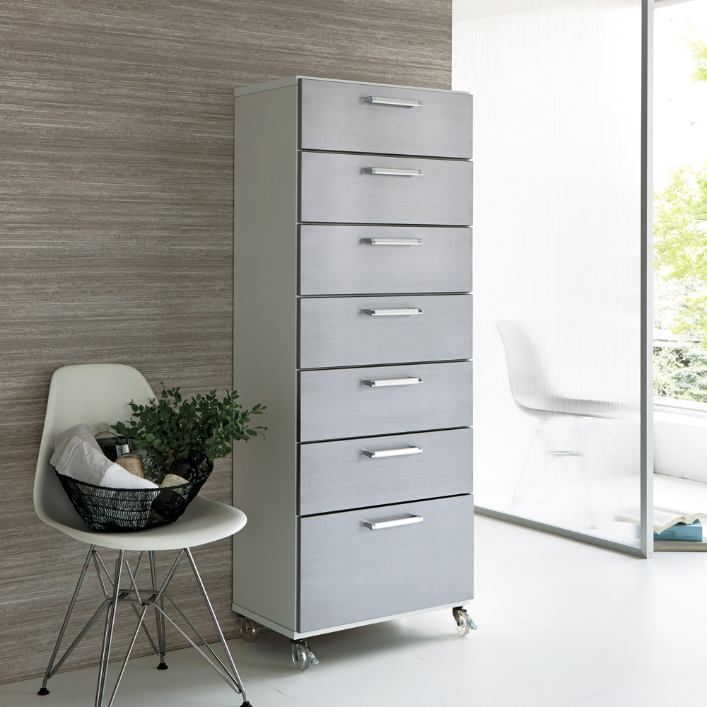 水に強く光沢感のあるUVコート素材を前面に使用した収納チェスト。キャスター付きで移動が簡単にできるので、洗面所収納や衣類収納におすすめです。幅45cmタイプと幅60cmタイプをご用意しています。清潔感のある爽やかなデザインで場所をとらずに収納力を増やせます●前面は美しい光沢のあるシルバーでサニタリー収納やランドリー収納など水回りにぴったりです。●幅は45cm、60cmの2タイプ。引き出し3段・5段・7段タイプをご用意しています。●設置スペースの少ない場所でも効率よく収納を増やすことができるタワーチェストです。最下段の引き出しには背の高い洗剤やストックも収納できます●一番下の引き出しは内寸高さ25cm(他の引き出しは14.5cm)なのでストッカーにも便利です。●スライドレールで手前まで引き出せるので奥の物がスムーズに取り出せます。●ストッパー付きで引き出しが抜け落ちる心配がありません。キャスター付きだから洗面所収納にもクローゼット収納にもおすすめです●キャスターは前輪に2個ストッパー付きです。取り外してもご使用いただけます。●タオル収納や衣類収納をお探しの方にも安心してお使いいただける日本製です。●寝室やリビングの収納家具としてもスタイリッシュなデザインがおしゃれに演出してくれます。