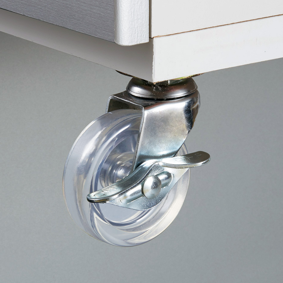 掃除のときにも移動がラクなキャスター付きです。前輪はストッパー付き。クリア色は圧迫感を和らげます。