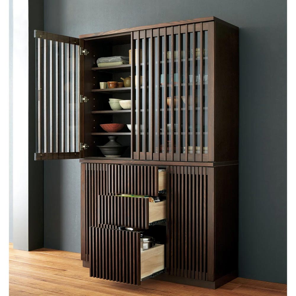 上段の収納部は格子のデザインを際立てる、飾りの前板が付いています。※写真は食器棚 幅120cmタイプです。