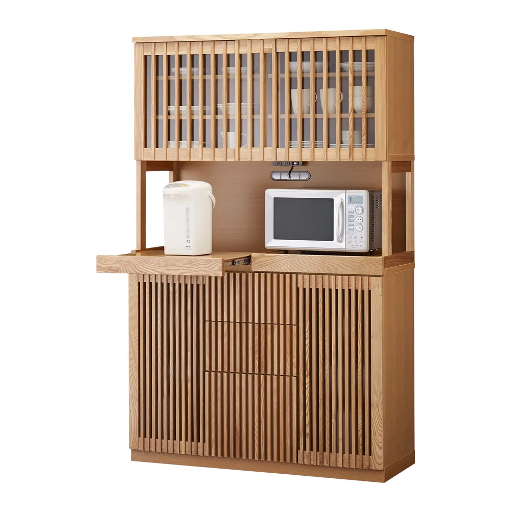 端正を極めたこだわりの食空間を叶える、高級感あふれる和モダンな家電収納庫。日本国内の職人が一つひとつ手作業で丁寧に仕上げたタモ材の格子が、リビングダイニングやキッチンに趣を添えます。お気に入りの食器を飾って眺める贅沢な天然木の食器棚は、格調高い佇まいで、ゆっくりと美味を味わう“割烹”のようなお洒落な雰囲気を醸し出します。毎日のお食事にも、特別なおもてなしのシーンにもオススメの、おしゃれな国産のキッチン収納棚です。〜日本の美意識が凝縮された、和モダン格子シリーズ〜◆美しくあたたかみのある、人気の和風の縦格子デザインで、リビングやキッチン・ダイニングでも存在感を放つ華やかな家電収納キッチンボードです。◆昔から日本の建築で多様に用いられてきた格子デザインは、光と風を取り入れ開放的な空間を演出します。◆シンプルながら目を引く、すっきりとしたオシャレなデザインなので、和室はもちろん、洋室の収納にもオススメです。◆ストライプの様な縦の格子は天井の高さを強調し開放感を与えます。◆引出は分け目をなくすことで、よりシンプルで統一されたお洒落なデザインになるよう、こだわって仕上げております。〜どこか懐かしく、あたたかみのあるタモ材のキッチン家電収納〜◆木目がはっきりしているタモの無垢材を使用し、リビングやダイニング・食卓をあたたかみのある空間へと演出します。◆強さとしなやかさを兼ね備えているタモ材は、頑丈なので安心して永くお使いいただけます。◆一つ一つ丁寧に、国内の職人がこだわって仕上げた人気の国産商品です。◆引き出しはフルスライドレール仕様でスムーズに開閉ができます。◆脚部はアジャスター付きでお客様のお好みで高さ調節が可能です。〜毎日の使い勝手にこだわった、高機能な食器棚〜◆引出は開け閉めスムーズなフルスライドレールが付いています。◆こまごまとしたキッチン雑貨や調理器具、カトラリーも出し入れしやすく便利です。◆上扉は格子とクリアガラスで、収納物の食器をホコリや汚れから守ります。◆上扉に収納したお皿は格子の隙間から見えるので、キッチン収納棚だけではなく飾り棚としてもお使いいただけます。◆下扉は収納した食器や調理器具・食品ストック類を目隠しできる、半透明のミストガラスを採用。◆隠しておきたい食品ストックやフライパン・鍋等の調理器具の収納におすすめです。◆スイッチ式の2口コンセント付で、ON/OFFの切り替えも便利です。◆コンセントは合計1500Wまで対応します。◆オープン部は2つのスライドテーブル付で、蒸気の出るポットや炊飯器も使用可能。◆スライドテーブルは前方に約35cm引き出せます。◆食器と家電をひとまとめに収納できる、便利で収納力たっぷりのお洒落なキッチンボードです。〜商品担当者のコメント〜一つ置くだけで目を引く収納棚で、キッチンに一層の高級感を添えます。華やかな印象ながらシンプルで洗練されたデザインなので、モダンなマンションや北欧系のナチュラルなインテリアにも調和し、おすすめです。こだわりがつまった素敵な空間で、毎日のお食事やだんらんの時間をより「贅沢」にお楽しみいただけたら幸いです。