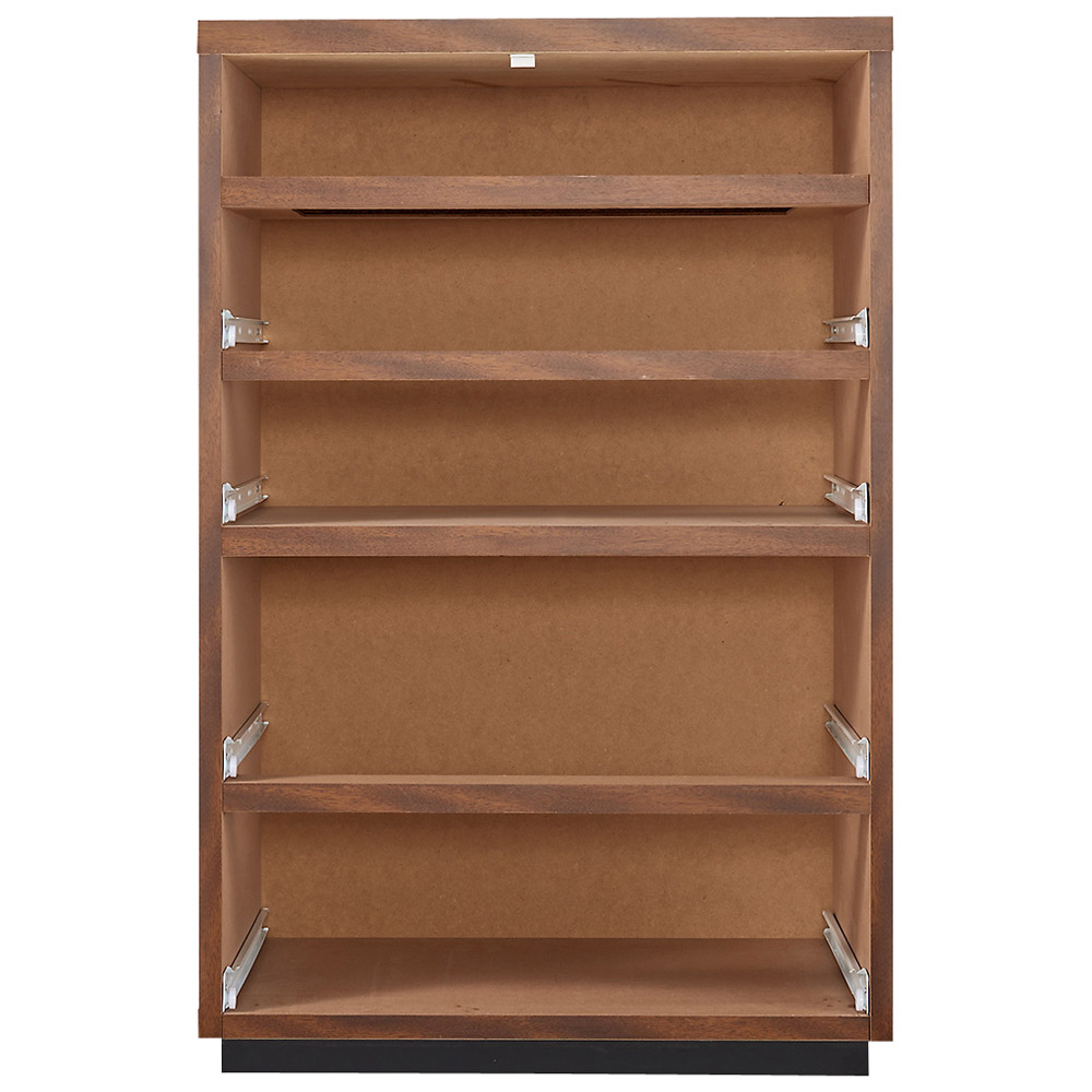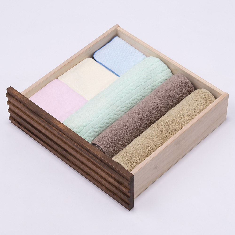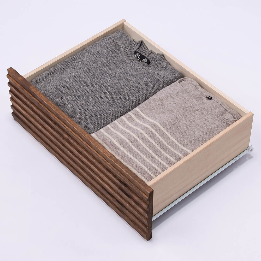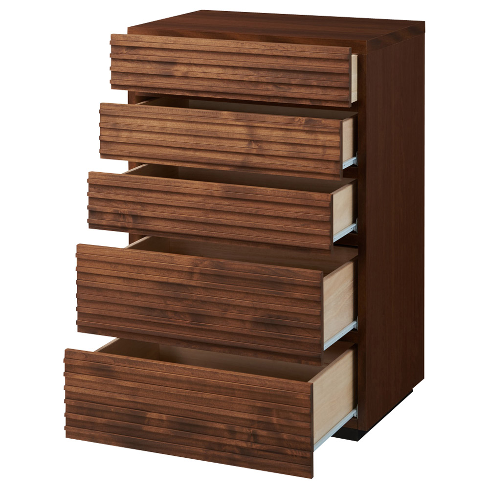 アルダー天然木の横格子デザインは、視覚的にお部屋を幅広に感じさせ落ち着きをもたらす衣類収納。重厚感のある造りは国産品ならではの和家具です。天然木横格子の繊細かつ優美なデザインに魅せられて●天然木の風合いが心安らぐ落ち着いたお部屋にコーディネート。●素材自体はあたたかみがありながらも、お部屋全体はスタイリッシュでシャープな印象になるのが横格子ならではの魅力。●楽器にも使用されるアルダー天然木材をふんだんに使用しました。●アルダー天然木は家具だけでなく、内装材や楽器(ギター)にも使用されている褐色系の木目がきれいな天然木です。●チェストの端から端まで広がる横格子デザインは視覚的にお部屋を幅広に感じさせ、ダークブラウンの色合いが落ち着きを与えてくれます。使いやすさにこだわったサイジングと機能性●サイズのバリエーションは幅60・90・120cm、3〜5段タイプがあります。●引き出しの高さは3種類。靴下やハンカチなどの小物から、トレーナーなどの大物衣料まで、効率よく分類収納できます●引き出しにはスライドレールが設置されおり衣類の出し入れも楽々です。(最上段を除きます。)丁寧な仕上げが光る、安心の日本製●日本の熟練の家具職人が一点一点丁寧に仕上げております。完成品でお届けするので組み立て不要。届いたらすぐに使えるのが嬉しいポイントです。【横格子柄チェスト 幅60・5段・高さ91cm】〈収納部内寸〉・最上段…幅52奥行36.5高さ9cm・上から2・3段目…幅50奥行36.5高さ10cm・4・5段目…幅50奥行36.5高さ15cm