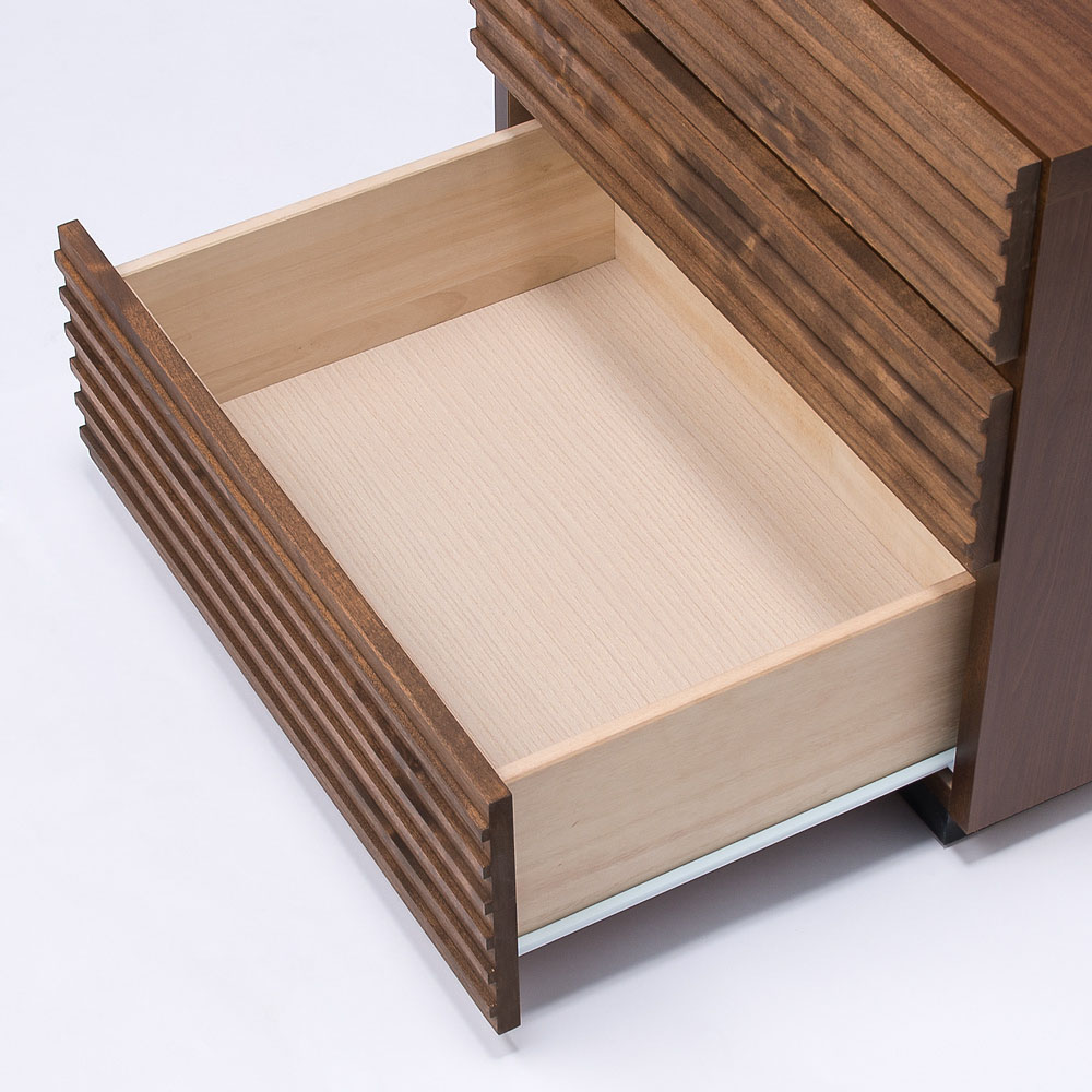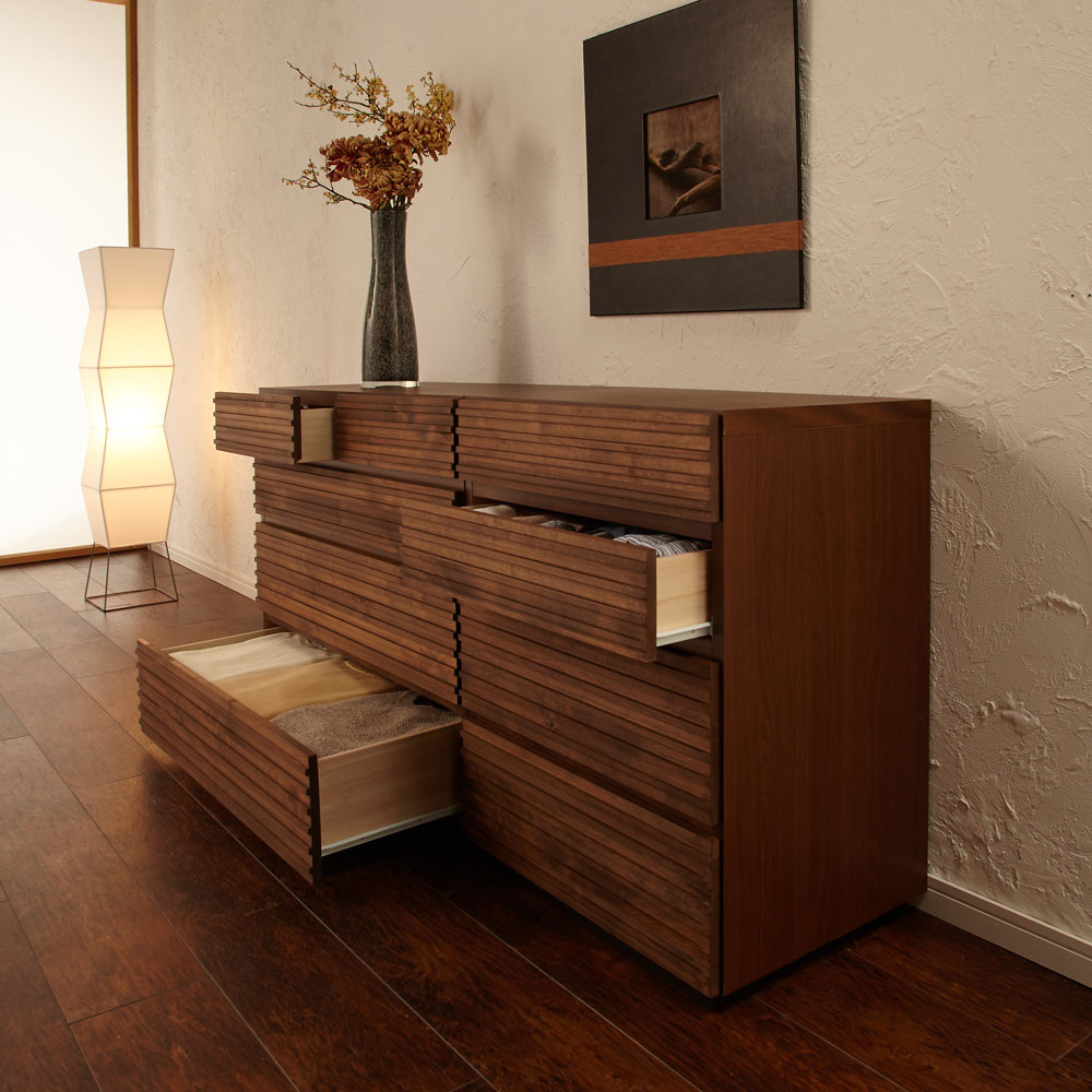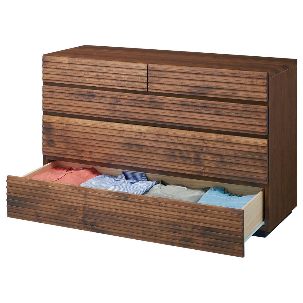 アルダー天然木の横格子デザインは視覚的にお部屋を幅広に感じさせ、ダークブラウンの色合いが落ち着きを与えてくれます。天然木横格子の繊細かつ優美なデザインに魅せられて●天然木の風合いが心安らぐ落ち着いたお部屋にコーディネート。●素材自体はあたたかみがありながらも、お部屋全体はスタイリッシュでシャープな印象になるのが横格子ならではの魅力。●楽器にも使用されるアルダー天然木材をふんだんに使用しました。●アルダー天然木は家具だけでなく、内装材や楽器(ギター)にも使用されている褐色系の木目がきれいな天然木です。●チェストの端から端まで広がる横格子デザインは視覚的にお部屋を幅広に感じさせ、ダークブラウンの色合いが落ち着きを与えてくれます。使いやすさにこだわったサイジングと機能性●サイズのバリエーションは幅60・90・120cm、3〜5段タイプがあります。●引き出しの高さは3種類。靴下やハンカチなどの小物から、トレーナーなどの大物衣料まで、効率よく分類収納できます●引き出しにはスライドレールが設置されおり衣類の出し入れも楽々です。(最上段を除きます。)丁寧な仕上げが光る、安心の日本製●日本の熟練の家具職人が一点一点丁寧に仕上げております。完成品でお届けするので組み立て不要。届いたらすぐに使えるのが嬉しいポイントです。【横格子柄チェスト 幅120・4段・高さ76cm】〈収納部内寸〉・最上段…幅53奥行36.5高さ9cm・上から2段目…幅110奥行36.5高さ10cm・3・4段目…幅110奥行36.5高さ15cm