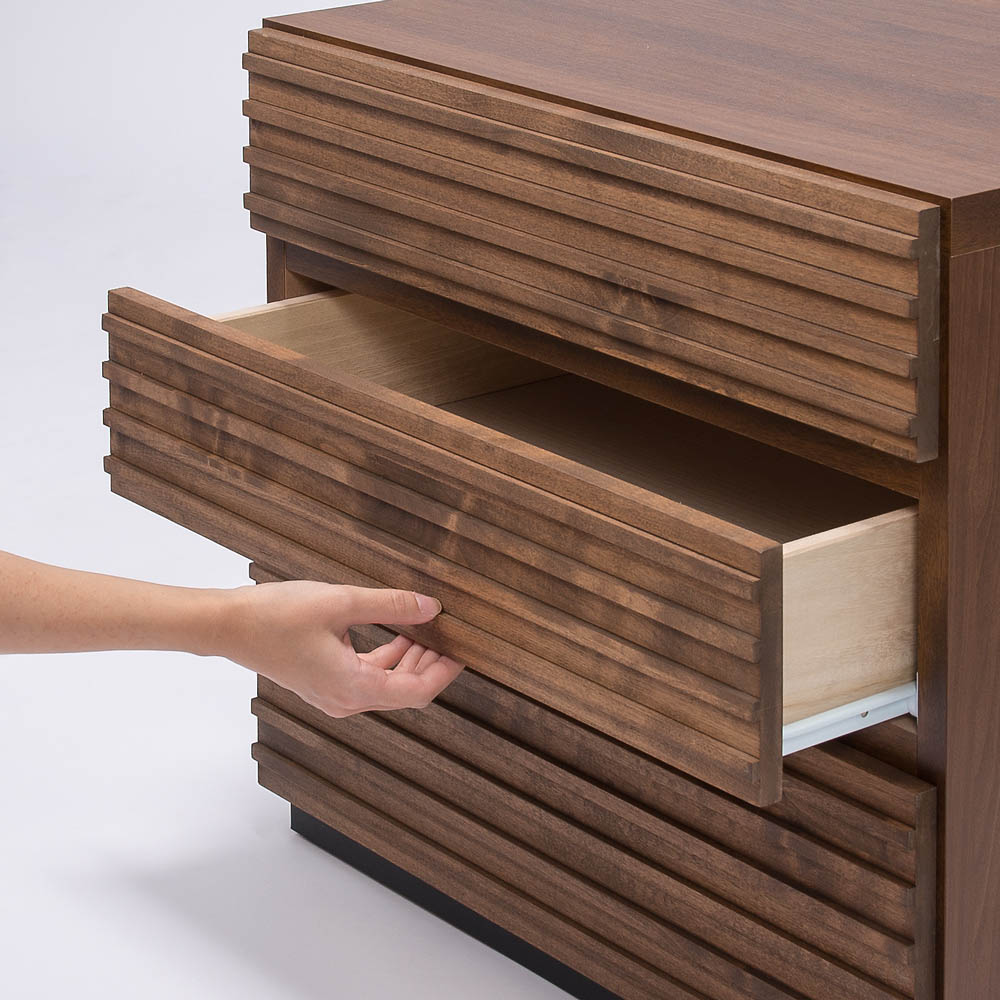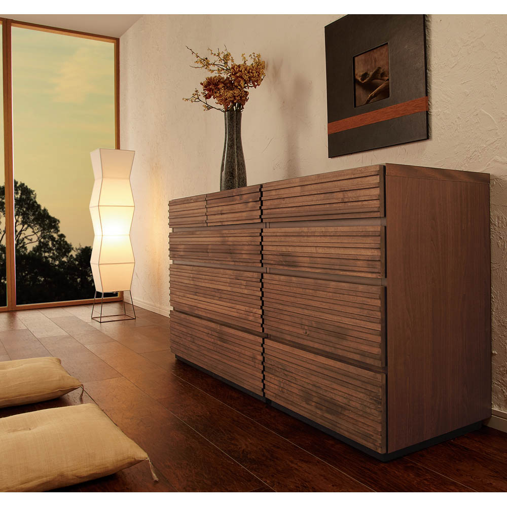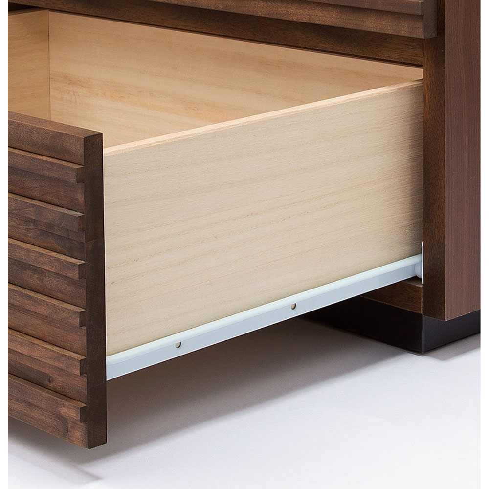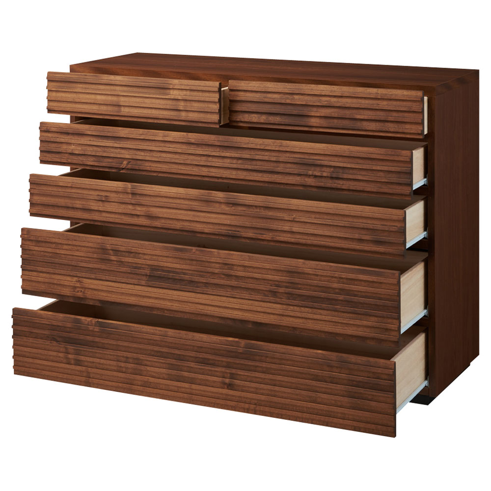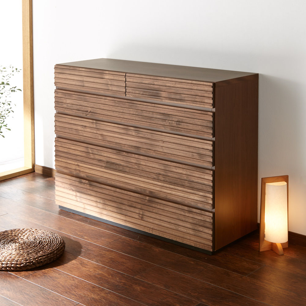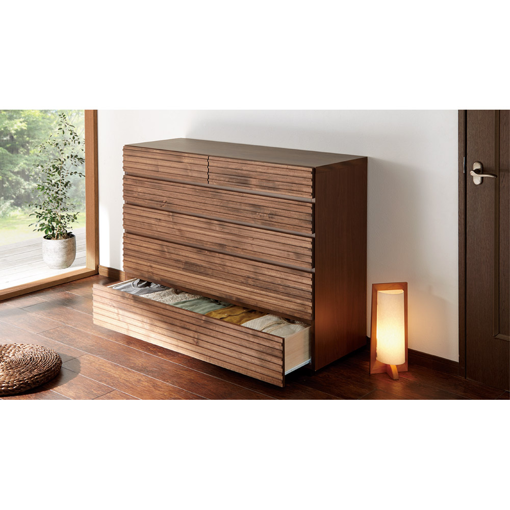 アルダー天然木の横格子デザインは視覚的にお部屋を幅広に感じさせ、ダークブラウンの色合いが落ち着きを与えてくれます。天然木横格子の繊細かつ優美なデザインに魅せられて●天然木の風合いが心安らぐ落ち着いたお部屋にコーディネート。●素材自体はあたたかみがありながらも、お部屋全体はスタイリッシュでシャープな印象になるのが横格子ならではの魅力。●楽器にも使用されるアルダー天然木材をふんだんに使用しました。●アルダー天然木は家具だけでなく、内装材や楽器(ギター)にも使用されている褐色系の木目がきれいな天然木です。●チェストの端から端まで広がる横格子デザインは視覚的にお部屋を幅広に感じさせ、ダークブラウンの色合いが落ち着きを与えてくれます。使いやすさにこだわったサイジングと機能性●サイズのバリエーションは幅60・90・120cm、3〜5段タイプがあります。●引き出しの高さは3種類。靴下やハンカチなどの小物から、トレーナーなどの大物衣料まで、効率よく分類収納できます●引き出しにはスライドレールが設置されおり衣類の出し入れも楽々です。(最上段を除きます。)丁寧な仕上げが光る、安心の日本製●日本の熟練の家具職人が一点一点丁寧に仕上げております。完成品でお届けするので組み立て不要。届いたらすぐに使えるのが嬉しいポイントです。【横格子柄チェスト 幅120・5段・高さ91】〈収納部内寸〉・最上段…幅53奥行36.5高さ9cm・上から2・3段目…幅110奥行36.5高さ10cm・4・5段目…幅110奥行36.5高さ15cm