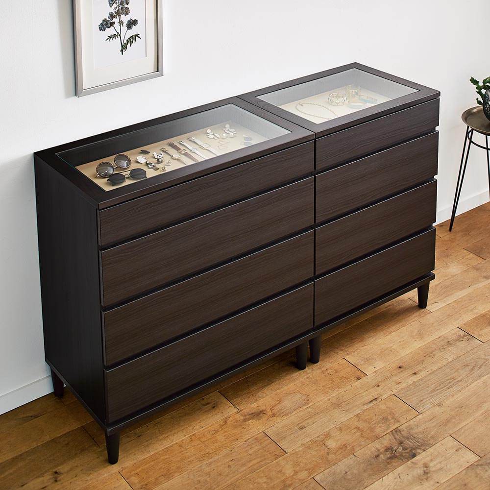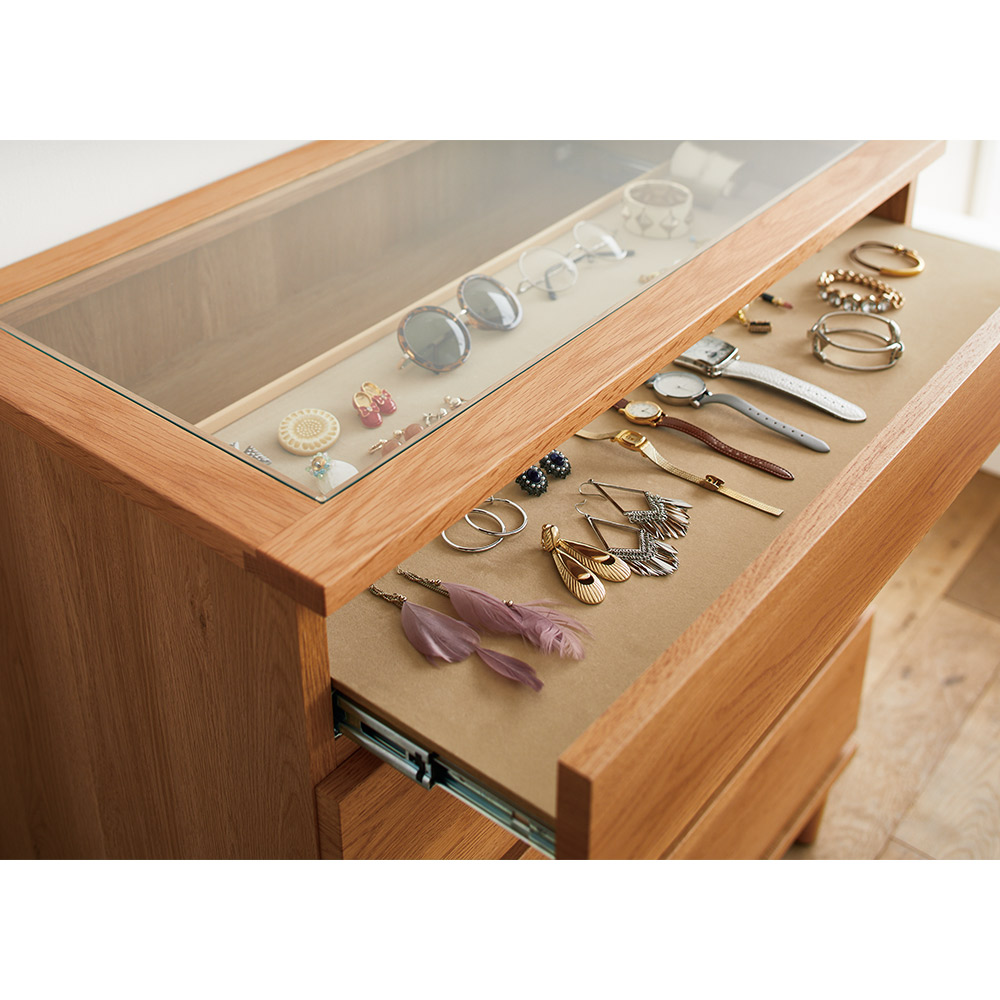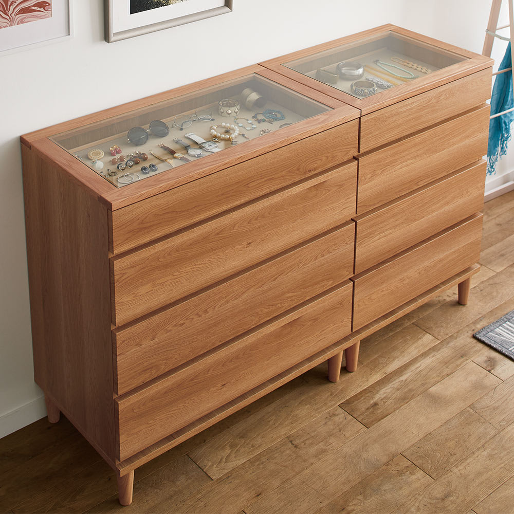 どんどん増えるアクセサリーも洋服もまとめて収納できるチェスト。毎朝の支度の時短にも役立ちます。北欧テイストでナチュラルな空間にもフィット。見やすく、取り出しやすく、お洒落に収納。北欧ジュエリー収納付きチェスト。◆どんどん増えるアクセサリーの収納場所に困っていませんか?◆増えていくジュエリーも洋服も、まとめて収納できるチェストです。天板にオーク天然木を使用した北欧風デザイン。◆天板の木枠にはオーク天然木を使用し、木目調の温もりのある表情でナチュラルな空間にもフィット。◆1段目はアクセサリー収納として。 収納部の内張りには淡い色合いの起毛素材を使用し、アクセサリーを優しく守ります。◆アクセサリー収納部は天板がガラス張りになっているのでディスプレイとして美しく飾れます。 見やすく取り出しやすいというメリットもあります。◆引き出しはストッパー付きレールで開閉もスムーズ。◆お部屋のインテリアの邪魔をしない、シンプルで長く使えるデザインです。◆高さ89cmのロータイプ・108cmのハイタイプの2サイズ展開、 4段タイプと5段タイプの2タイプからお選びいただけます。国産の安心して使える素材を使用しています◆国内の家具工場で職人がひとつずつ丁寧に仕上げました。◆国産品ならではの高品質をお楽しみください。◆脚部を取り付けるだけで、届いたその日からお使い頂けます。新築やリフォーム、模様替えの時にもおすすめの逸品◆お引越しや模様替えのタイミングでスペースを便利に有効活用してみませんか?◆あと少し収納場所が足りないというときに追加するのにおすすめの商品です。