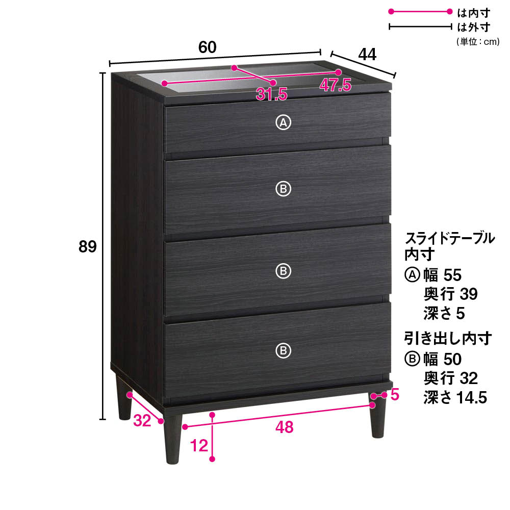 2〜4段目引き出し有効内寸:幅50奥行32高さ14.5cm(側板高さ14cm)