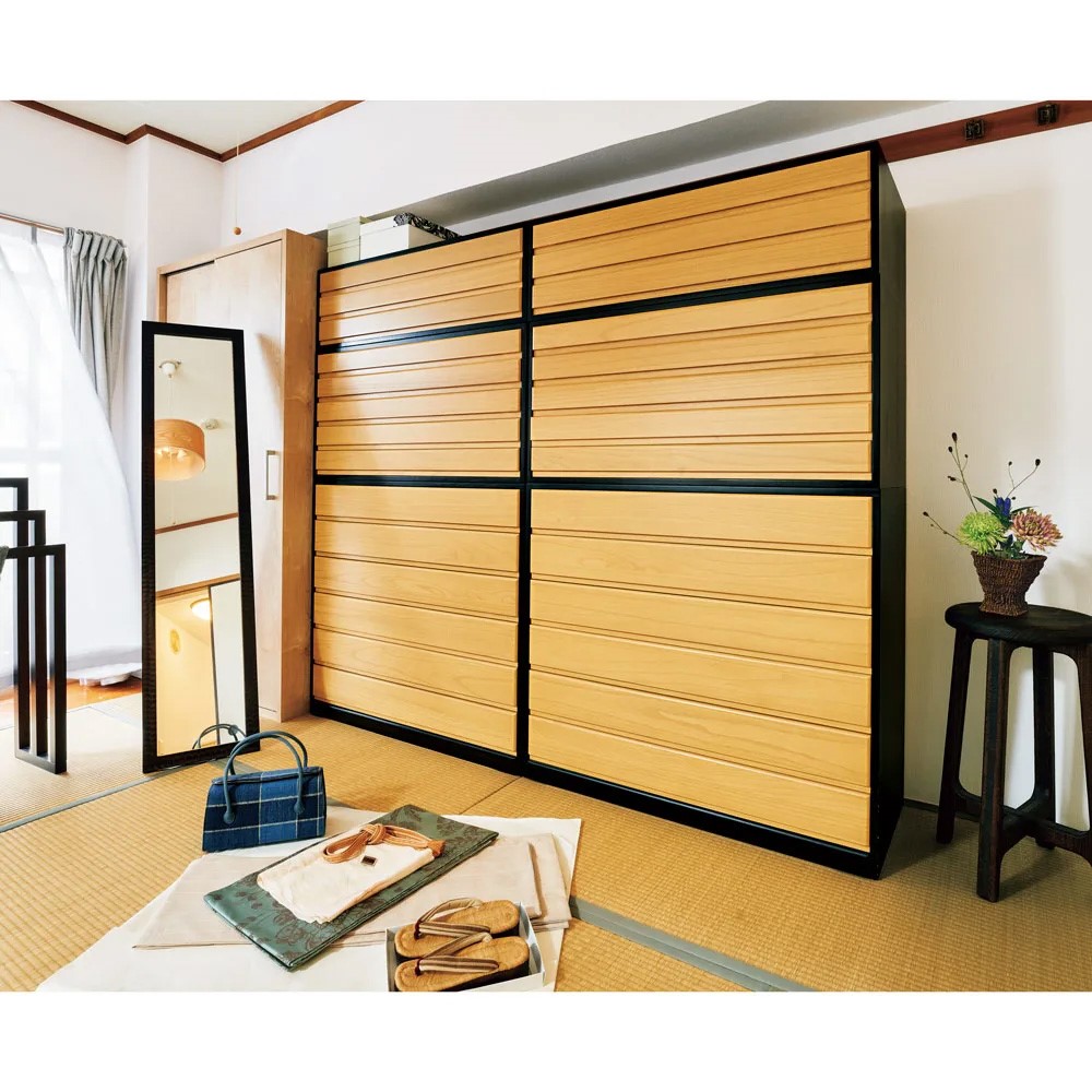 和モダン桐箪笥をご愛用いただいているHさんご夫婦に取材をしました。写真はHさんご夫婦がご自宅で和モダン桐箪笥を活用している取材写真です。 ※写真は上から「着物収納3段+着物収納5段+衣類収納6段」を2列に並べています。