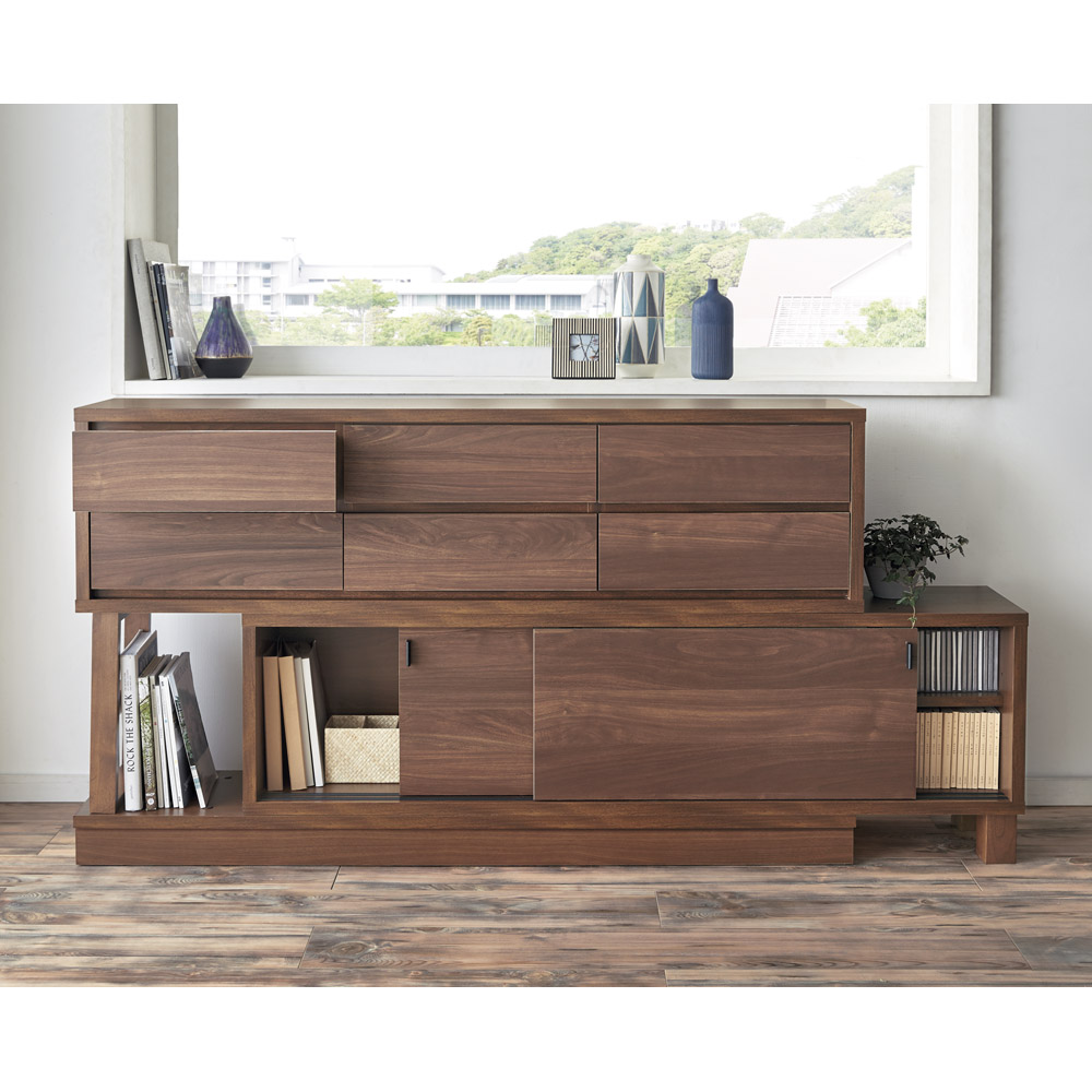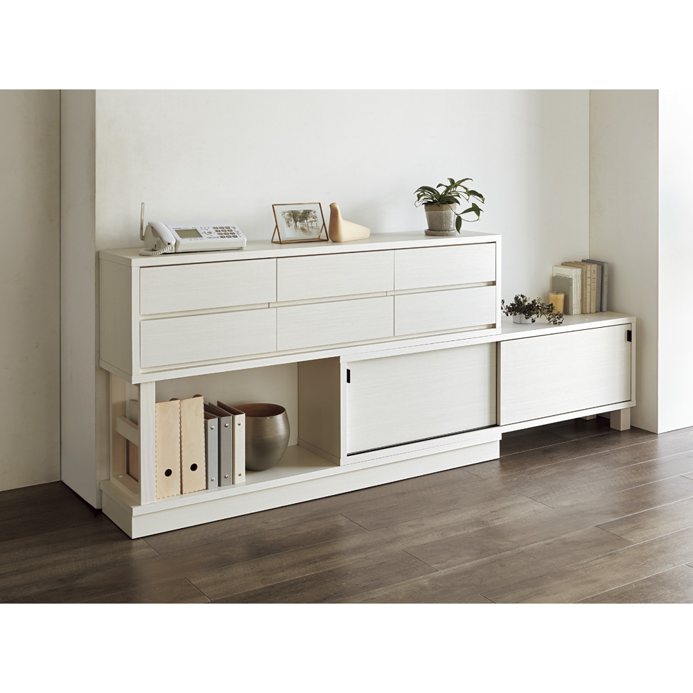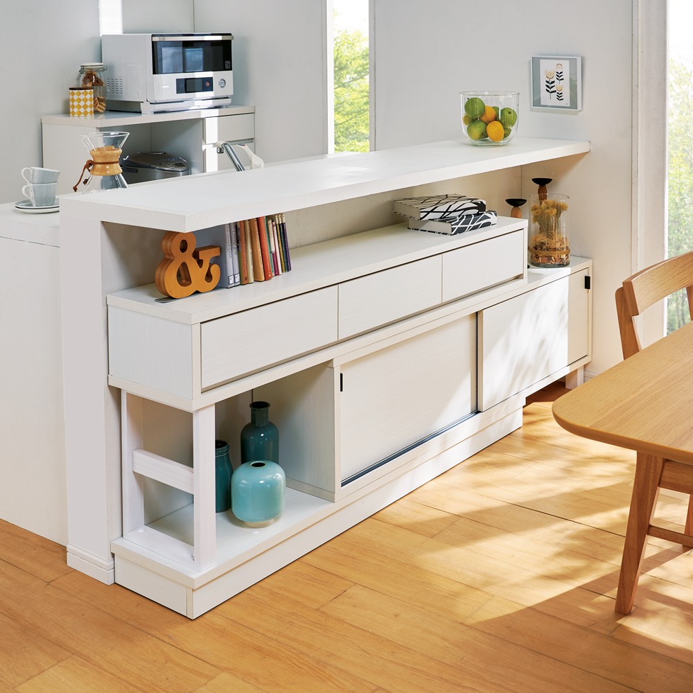 カウンターや窓の下などを有効に活用できる伸長式の収納庫。スリムに見えても奥行きがあるので、雑誌やA4サイズの書類も収納できます。置きたいスペースにぴったり合わせられる便利なスライド式。置きたいスペースにぴったり合わせられる、無段階の伸長式タイプ収納庫カウンター下や窓下など、収納スペースが欲しい場所は様々。その場所にぴったり合うサイズの家具を探すのはなかなか大変…。そんな方のために、無段階で横幅を調整できるカウンター下収納庫のご提案です。ナチュラルな木目柄も、最近主流の内装に調和するものを選び、『ぴったり』にこだわりました。横幅ぴったり、簡単調整できる無段階の伸縮式◆自分で調節できる伸長式なので、お好みの幅に簡単に設定可能なカウンター下の収納です。◆オーダー家具感覚で台所のカウンター下や窓下・壁際にぴったりな幅で設置していただけます。◆サイズは幅160cm〜260cmまでに対応します。◆設置したいダイニングキッチンやリビングのスペースに合わせてお選びください。奥行30cmのスリム設計で収納上手になれるアイデア収納◆キッチンカウンター下や窓下・壁際へ設置することを考え、奥行は30cmと薄型の隙間収納。◆高さは72cmと89cmの2タイプをお選びいただけます。たっぷりの小さな引き出しで、誰でも整理整頓が簡単に。◆上部は6杯の小引き出しで、迷子になりがちなリビング小物・キッチン小物を分類収納。◆乾電池や常備薬、キッチン雑貨やカトラリーまで、散らばる小物をまとめて収納。◆すべての引き出しには脱落防止のストッパー付きの、安心設計です。下部分は、場所をとらない引き戸式でスマートに。◆狭いスペースに設置することを考え、扉は引き戸式になりました。◆開閉時にも場所をとらず、置いてみたら狭くて扉が開かなかった…という心配もありません。◆奥行30cmの薄型収納で、キッチンカウンター下のデッドスペースにもピッタリ収まります。◆薄型でも収納力たっぷり。中皿や小鉢、買い置きの缶詰や瓶詰をまとめて、食器棚・キッチンストッカーとしてもお勧めの隙間収納です。◆右側には可動棚付きで、細々したものを収納。左側には可動棚は無く、本などの大きめの物も収まります。奥行浅めの薄型収納は、設置場所を選ばずリビング収納・書棚としても。◆薄型収納は窓下や廊下・リビングの空きスペースなど、カウンター下以外のデッドスペースも有効活用できます。◆廊下や寝室などの窓下に設置して書斎に収まりきらない雑誌収納やCD収納、DVD収納としても。◆リビングの窓下などに設置すれば、FAX台や電話台、ローボード・窓下収納としても活躍。◆リビングに散らばりがちな小物、生活雑貨をまとめて。ちょっとした本棚としても。どんなお部屋にもなじむ選べる3色展開◆設置する場所に合わせてお選びいただけるよう、お色は3色ご用意しました。◆シックで落ち着いた色合いの『ダークブラウン』◆明るい色合いでお部屋を可愛らしく見せる『ナチュラル』◆リフォームや新築のマンションで人気の白い木目が美しい『ホワイト木目』◆ダイニングキッチンのインテリアになじむデザインで、あっという間におしゃれなキッチン周りに。信頼と安心の国産(日本製)◆国内の工場で職人がひとつずつ生産しています。◆細部の仕上がりなど、国産品ならではの高品質をお楽しみください。組立の際、脚部取付のため軸の長さ10cm以上のプラスドライバーをご用意ください。