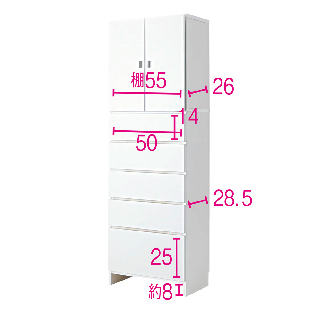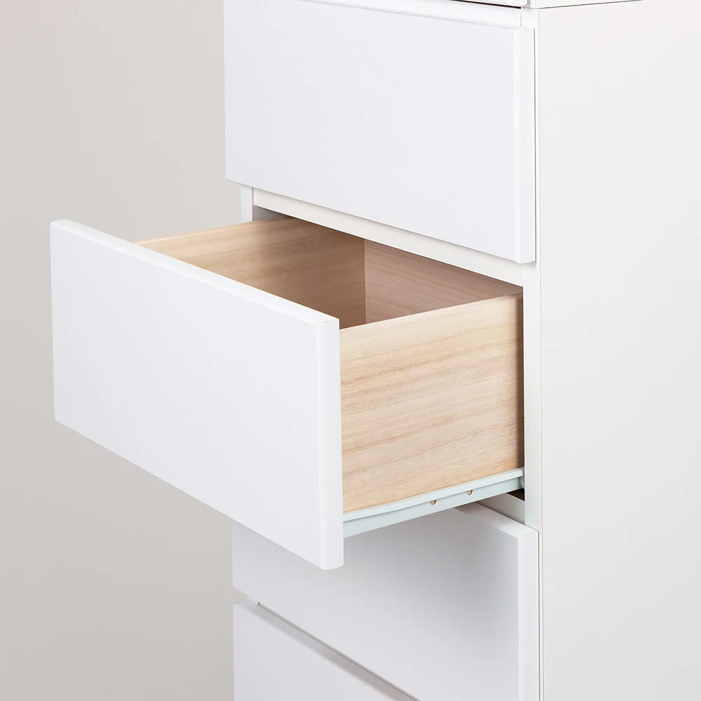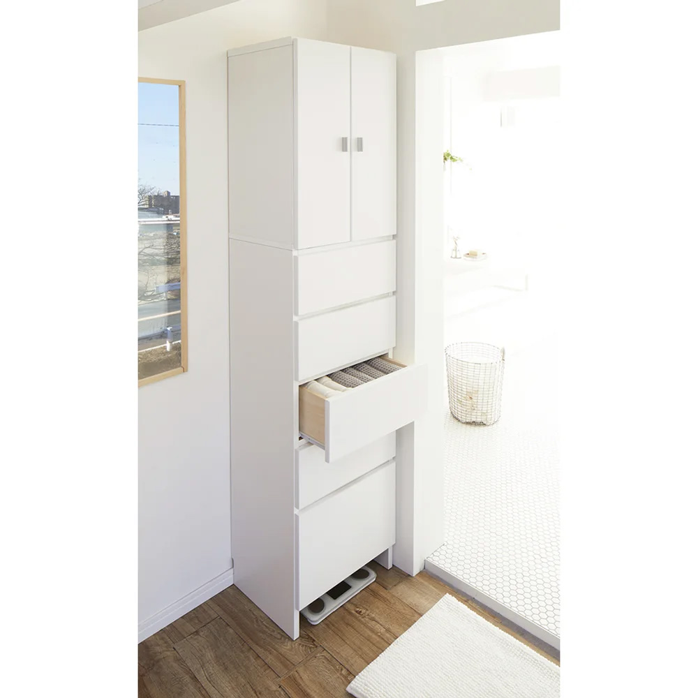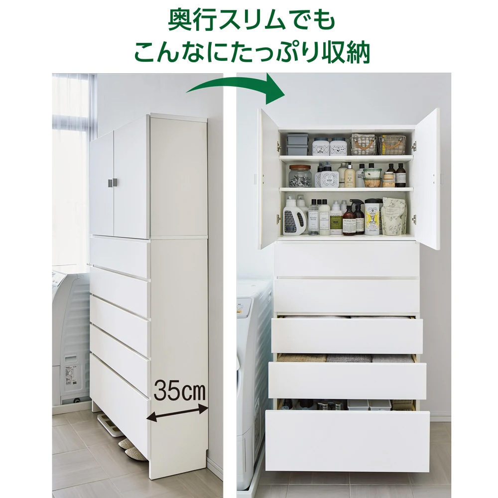 さまざまな種類の物が混在する洗面所での整理に役立つサニタリーチェスト。ストック類は棚、タオルやリネン類は引き出しにと、適材適所の収納ができます。棚部と引き出しを使い分けて、ごちゃつく洗面所もすっきり●収納物に合わせて、上部の扉付き棚と下部の引き出しに分類できます。●180.5cmの高さを活かしてたっぷり収納できます。●収納力のある幅60cm。奥行は35cmで圧迫感なく置けます。●清潔感があり、シンプルで飽きのこないデザインです。【1】上部は洗濯用品が出し入れしやすい「棚収納」●使いやすい収納棚で、扉を閉めれば生活感もすっきり隠せます。●9cm間隔・4段階に高さ調節ができる可動棚2枚付き。物に合わせて効率よく収納できます。●たっぷり入り、出し入れもしやすい高さです。【2】下部はタオルや衣類に適した「引き出し収納」●深さの異なる5杯の引き出しに、タオルや家族の着替えなどがたっぷり入ります。●上4杯の中引き出しにはドライヤーなどの美容家電も見やすく整理できます(内寸高さ14cm)。●最下段の深引き出しには高さのあるボトル類やお掃除用具などが収納できます(内寸高さ25cm)。●引き出しは全段ストッパー付きスライドレールで、開閉がスムーズです。●床と底板の間に約8cmのスペースがあり、体重計やスリッパなどが収納できます。汚れや擦り傷に強く、変色しにくい素材●前面はお手入れがラクなクリーンイーゴスCEフィット。水ハネや汚れはもちろん、擦り傷、日光による劣化・変色にも強い素材です。●水回りで安心して使える万能チェスト。●幅木よけカット(1×8cm)があり、壁面に隙間なくぴったりと設置ができます。●丈夫で丁寧なつくりの日本製です。●完成品でお届けします。お客さまにて「上下のジョイント・取っ手の取り付け」のみ、お願い致します。豊富なサイズから「わが家にちょうど」が選べます●幅は45cm・60cm・80cmの3サイズがあります。●奥行は35cm・42cmの2サイズがあります。●計6サイズから選べて、置きたい場所にぴったり!が叶います。