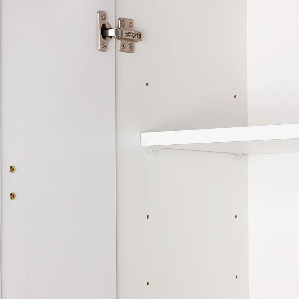大型収納でも圧迫感が少なく、他のインテリアにも馴染みやすいオールホワイト。脚元には体重計をしまうスペースも。 ※写真は幅80cm・奥行42cmタイプです。