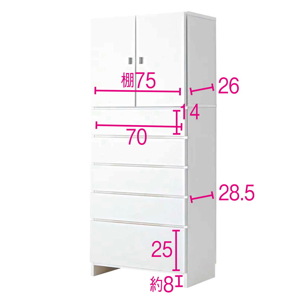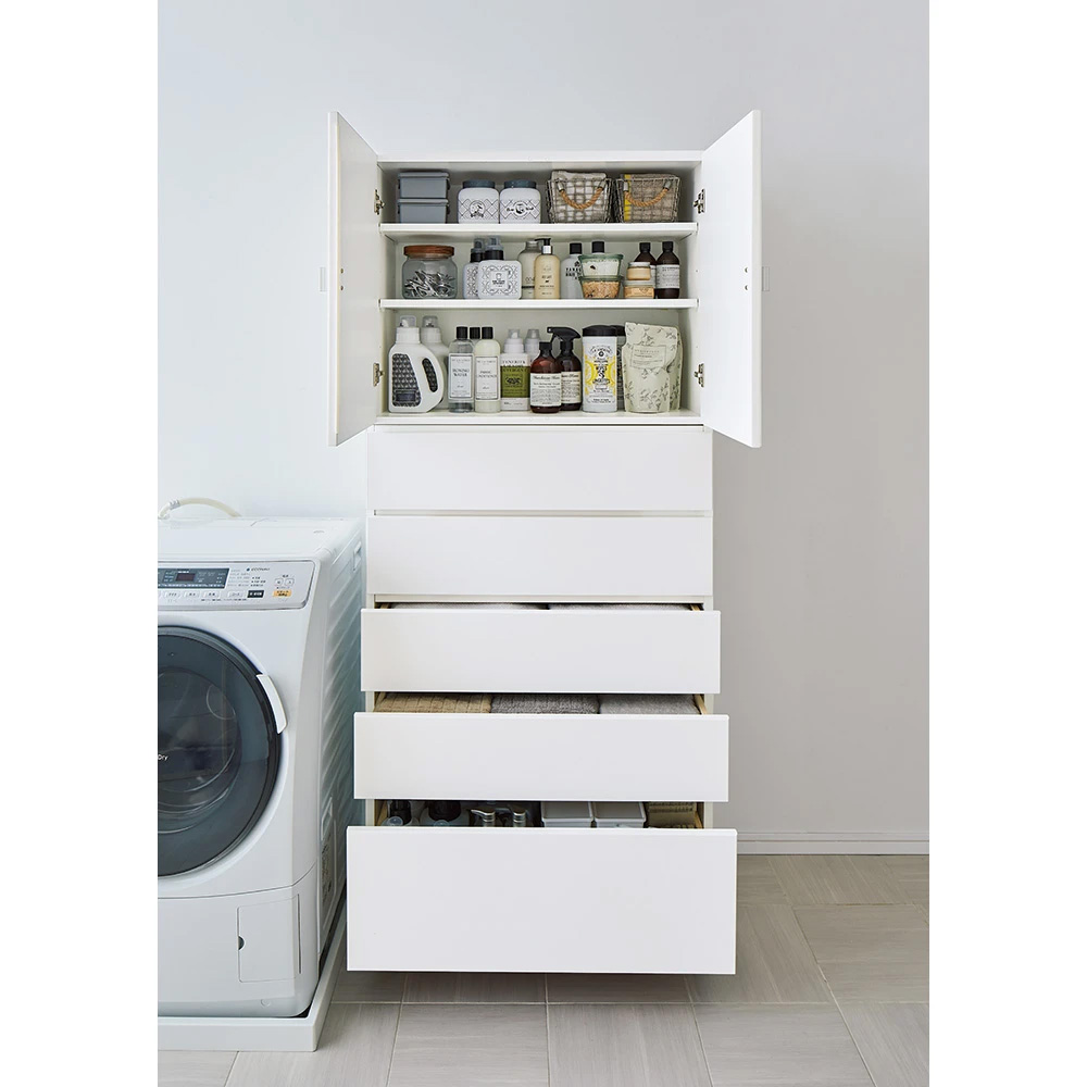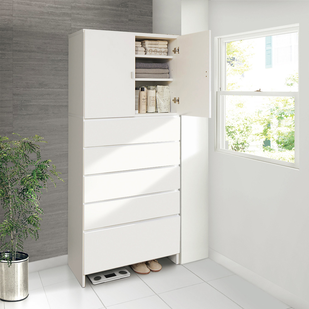 さまざまな種類の物が混在する洗面所での整理に役立つサニタリーチェスト。ストック類は棚、タオルやリネン類は引き出しにと、適材適所の収納ができます。棚部と引き出しを使い分けて、ごちゃつく洗面所もすっきり●収納物に合わせて、上部の扉付き棚と下部の引き出しに分類できます。●180.5cmの高さを活かしてたっぷり収納できます。●たっぷり収納できる幅80cm。奥行は35cmで圧迫感なく置けます。●清潔感があり、シンプルで飽きのこないデザインです。【1】上部は洗濯用品が出し入れしやすい「棚収納」●使いやすい収納棚で、扉を閉めれば生活感もすっきり隠せます。●9cm間隔・4段階に高さ調節ができる可動棚2枚付き。物に合わせて効率よく収納できます。●たっぷり入り、出し入れもしやすい高さです。【2】下部はタオルや衣類に適した「引き出し収納」●深さの異なる5杯の引き出しに、タオルや家族の着替えなどがたっぷり入ります。●上4杯の中引き出しにはドライヤーなどの美容家電も見やすく整理できます(内寸高さ14cm)。●最下段の深引き出しには高さのあるボトル類やお掃除用具などが収納できます(内寸高さ25cm)。●引き出しは全段ストッパー付きスライドレールで、開閉がスムーズです。●床と底板の間に約8cmのスペースがあり、体重計やスリッパなどが収納できます。汚れや擦り傷に強く、変色しにくい素材●前面はお手入れがラクなクリーンイーゴスCEフィット。水ハネや汚れはもちろん、擦り傷、日光による劣化・変色にも強い素材です。●水回りで安心して使える万能チェスト。●幅木よけカット(1×8cm)があり、壁面に隙間なくぴったりと設置ができます。●丈夫で丁寧なつくりの日本製です。●完成品でお届けします。お客さまにて「上下のジョイント・取っ手の取り付け」のみ、お願い致します。豊富なサイズから「わが家にちょうど」が選べます●幅は45cm・60cm・80cmの3サイズがあります。●奥行は35cm・42cmの2サイズがあります。●計6サイズから選べて、置きたい場所にぴったり!が叶います。