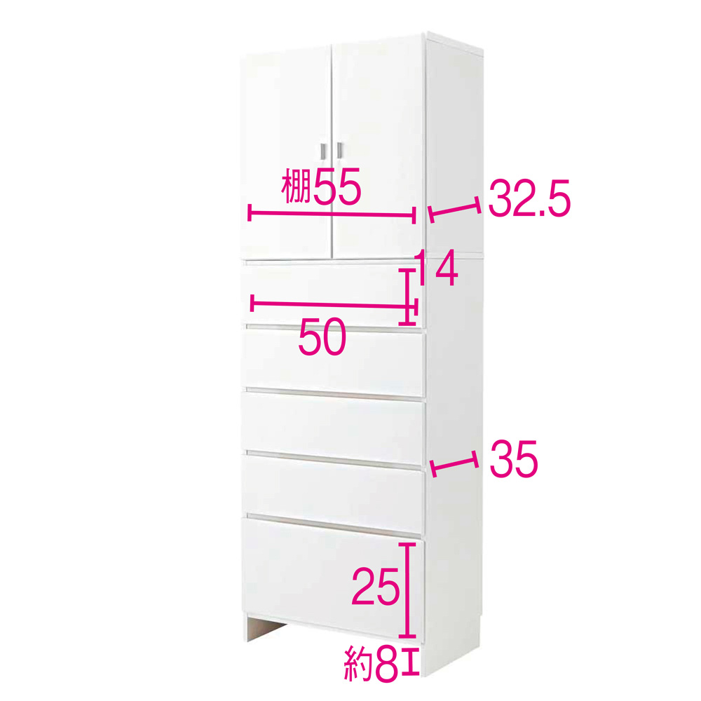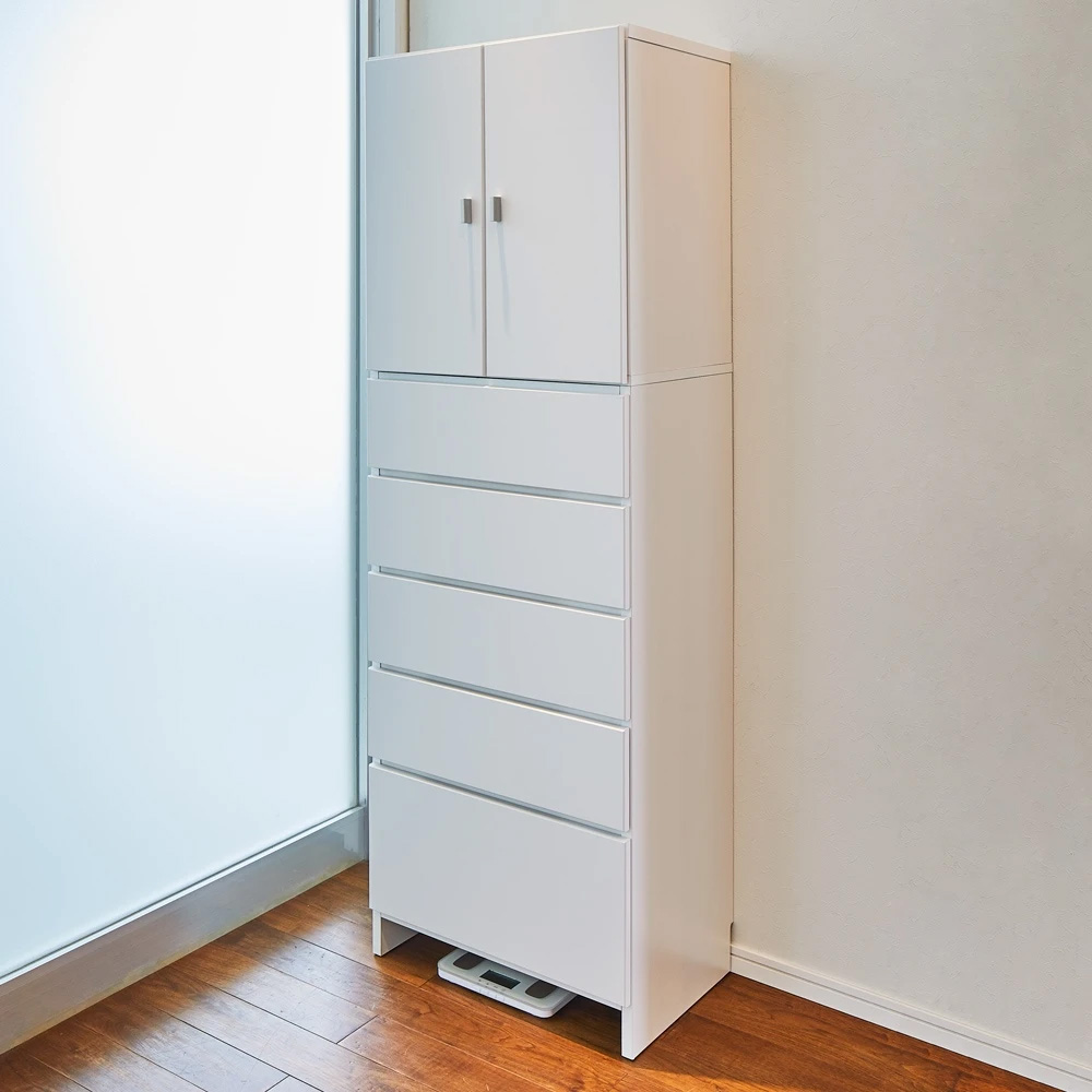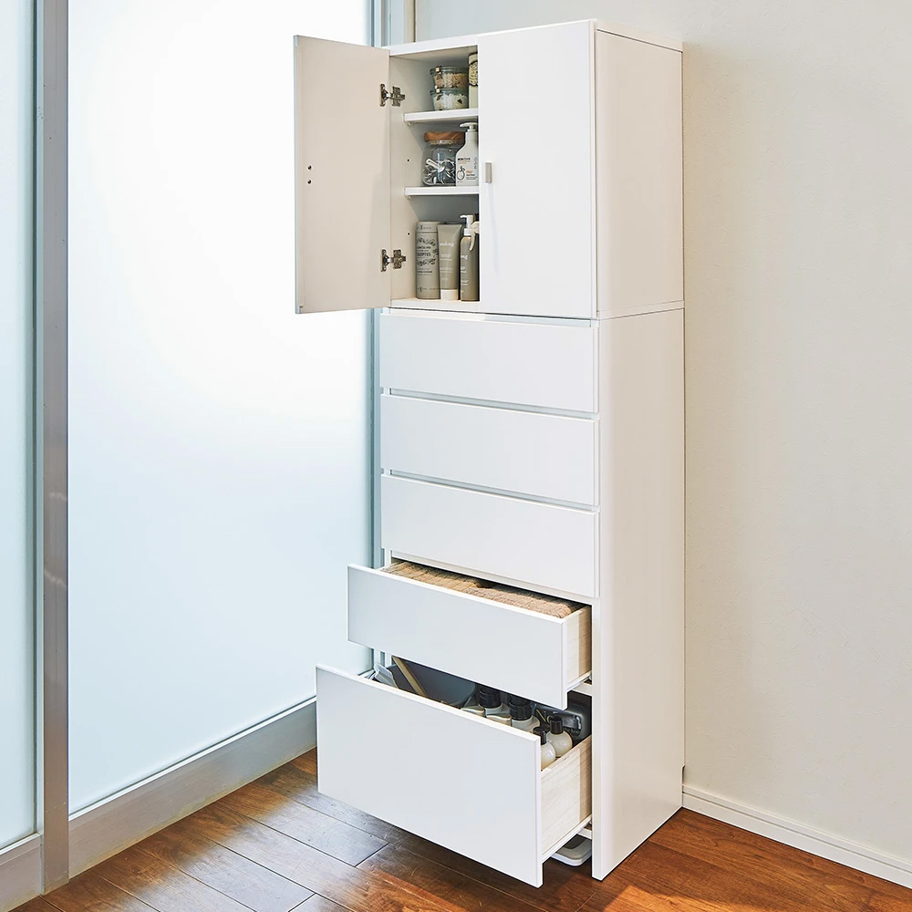 さまざまな種類の物が混在する洗面所での整理に役立つサニタリーチェスト。ストック類は棚、タオルやリネン類は引き出しにと、適材適所の収納ができます。棚部と引き出しを使い分けて、ごちゃつく洗面所もすっきり●収納物に合わせて、上部の扉付き棚と下部の引き出しに分類できます。●180.5cmの高さを活かしてたっぷり収納できます。●収納力のある幅60cm×奥行42cmサイズ。●清潔感があり、シンプルで飽きのこないデザインです。【1】上部は洗濯用品が出し入れしやすい「棚収納」●使いやすい収納棚で、扉を閉めれば生活感もすっきり隠せます。●9cm間隔・4段階に高さ調節ができる可動棚2枚付き。物に合わせて効率よく収納できます。●たっぷり入り、出し入れもしやすい高さです。【2】下部はタオルや衣類に適した「引き出し収納」●深さの異なる5杯の引き出しに、タオルや家族の着替えなどがたっぷり入ります。●上4杯の中引き出しにはドライヤーなどの美容家電も見やすく整理できます(内寸高さ14cm)。●最下段の深引き出しには高さのあるボトル類やお掃除用具などが収納できます(内寸高さ25cm)。●引き出しは全段ストッパー付きスライドレールで、開閉がスムーズです。●床と底板の間に約8cmのスペースがあり、体重計やスリッパなどが収納できます。汚れや擦り傷に強く、変色しにくい素材●前面はお手入れがラクなクリーンイーゴスCEフィット。水ハネや汚れはもちろん、擦り傷、日光による劣化・変色にも強い素材です。●水回りで安心して使える万能チェスト。●幅木よけカット(1×8cm)があり、壁面に隙間なくぴったりと設置ができます。●丈夫で丁寧なつくりの日本製です。●完成品でお届けします。お客さまにて「上下のジョイント・取っ手の取り付け」のみ、お願い致します。豊富なサイズから「わが家にちょうど」が選べます●幅は45cm・60cm・80cmの3サイズがあります。●奥行は35cm・42cmの2サイズがあります。●計6サイズから選べて、置きたい場所にぴったり!が叶います。
