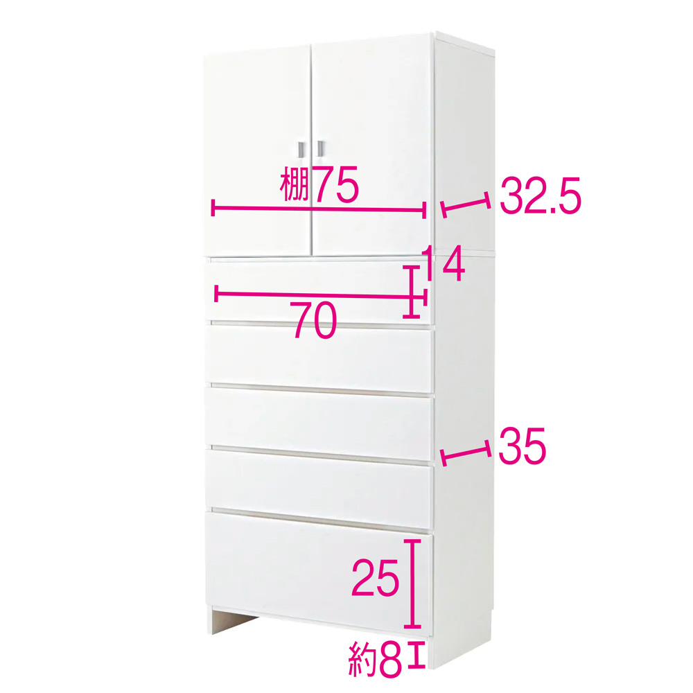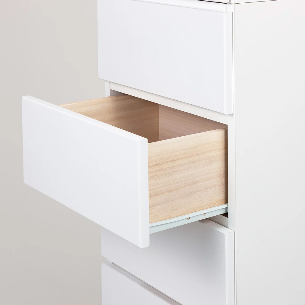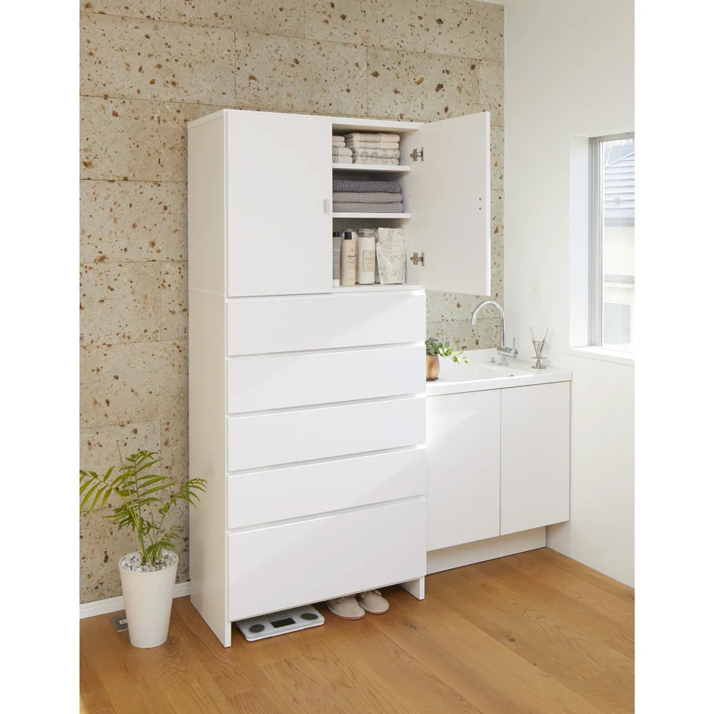 さまざまな種類の物が混在する洗面所での整理に役立つサニタリーチェスト。ストック類は棚、タオルやリネン類は引き出しにと、適材適所の収納ができます。棚部と引き出しを使い分けて、ごちゃつく洗面所もすっきり●収納物に合わせて、上部の扉付き棚と下部の引き出しに分類できます。●180.5cmの高さを活かしてたっぷり収納できます。●たっぷり収納できる幅80cm×奥行42cmサイズ。●清潔感があり、シンプルで飽きのこないデザインです。【1】上部は洗濯用品が出し入れしやすい「棚収納」●使いやすい収納棚で、扉を閉めれば生活感もすっきり隠せます。●9cm間隔・4段階に高さ調節ができる可動棚2枚付き。物に合わせて効率よく収納できます。●たっぷり入り、出し入れもしやすい高さです。【2】下部はタオルや衣類に適した「引き出し収納」●深さの異なる5杯の引き出しに、タオルや家族の着替えなどがたっぷり入ります。●上4杯の中引き出しにはドライヤーなどの美容家電も見やすく整理できます(内寸高さ14cm)。●最下段の深引き出しには高さのあるボトル類やお掃除用具などが収納できます(内寸高さ25cm)。●引き出しは全段ストッパー付きスライドレールで、開閉がスムーズです。●床と底板の間に約8cmのスペースがあり、体重計やスリッパなどが収納できます。汚れや擦り傷に強く、変色しにくい素材●前面はお手入れがラクなクリーンイーゴスCEフィット。水ハネや汚れはもちろん、擦り傷、日光による劣化・変色にも強い素材です。●水回りで安心して使える万能チェスト。●幅木よけカット(1×8cm)があり、壁面に隙間なくぴったりと設置ができます。●丈夫で丁寧なつくりの日本製です。●完成品でお届けします。お客さまにて「上下のジョイント・取っ手の取り付け」のみ、お願い致します。豊富なサイズから「わが家にちょうど」が選べます●幅は45cm・60cm・80cmの3サイズがあります。●奥行は35cm・42cmの2サイズがあります。●計6サイズから選べて、置きたい場所にぴったり!が叶います。