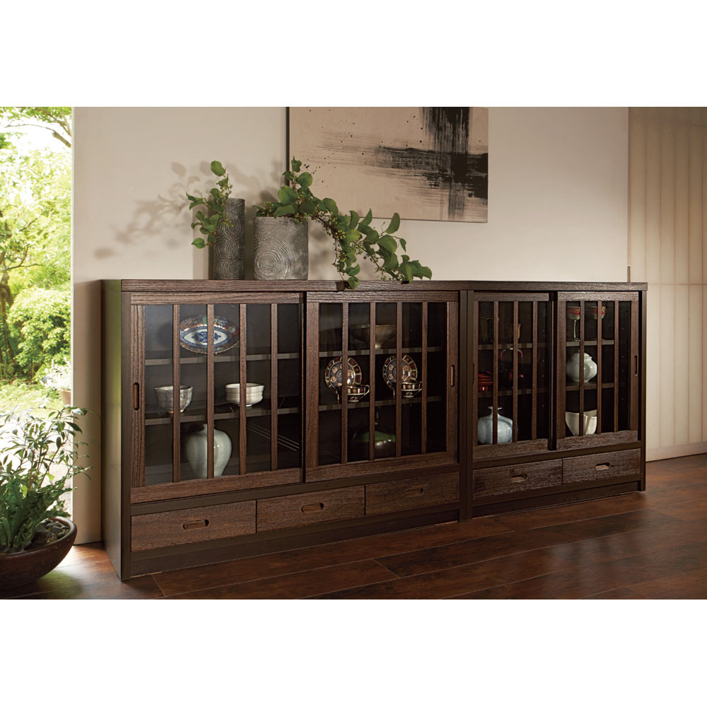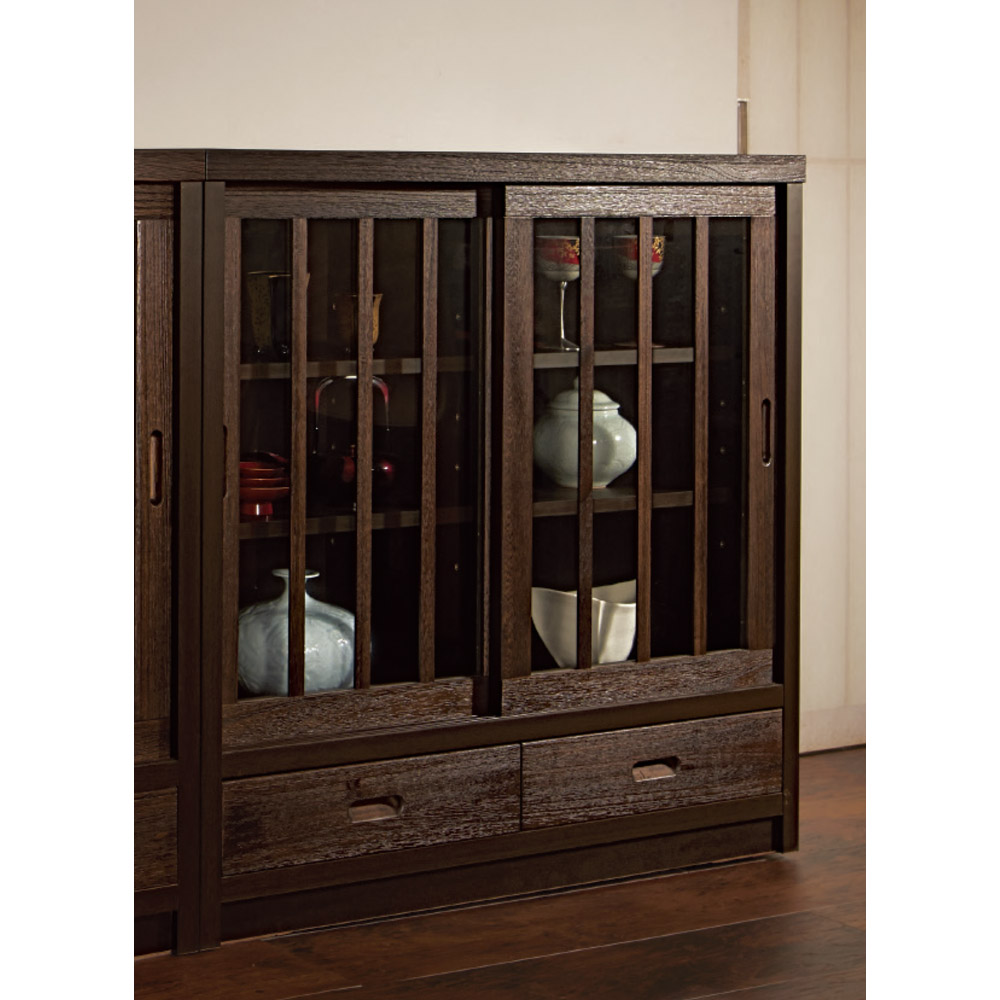 和モダンデザインの美しい木目の質感と格子が際立つ、国産の水屋箪笥。〜立体的な木目の質感と人気の格子デザインがマッチ〜●古民家風デザインがおしゃれな引き戸式食器棚。●格子が美しいガラス扉の収納部は、飾り棚としてもおすすめです。●丈夫な箱組引き出しなど、国産ならではの丁寧なつくりが際立ちます。〜ほどよい高さと使い勝手の良さにもこだわりました〜●収納部は出し入れがしやすく、開閉に場所を取らない引き戸式です。●小物の収納に便利な引き出しが2杯付いています。●幅90cmで、収納力も十分です。〜暮らしに合わせて選べる7タイプ〜●幅、高さ、使用方法などに合わせて選べる7タイプをご用意しました。●古美術や本、CDなどのコレクションを上品に飾ることもできます。●憧れの古民家テイストを取り入れた、素敵なお部屋ができあがります。桐 うづくり仕上げ木の表面を磨きながら削ぎ落として木目に凹凸を付け、年輪が浮き上がった美しい表情に仕上げます。立体的な木目の質感と人気の格子デザインが美しくマッチ。引き戸と引き出しが備わった実用性も魅力です。●和風な雰囲気がおしゃれな引き戸食器棚や飾り棚としておすすめです。●高さも87.5cmと低くコンパクトな仕上がりなので圧迫感がありません。