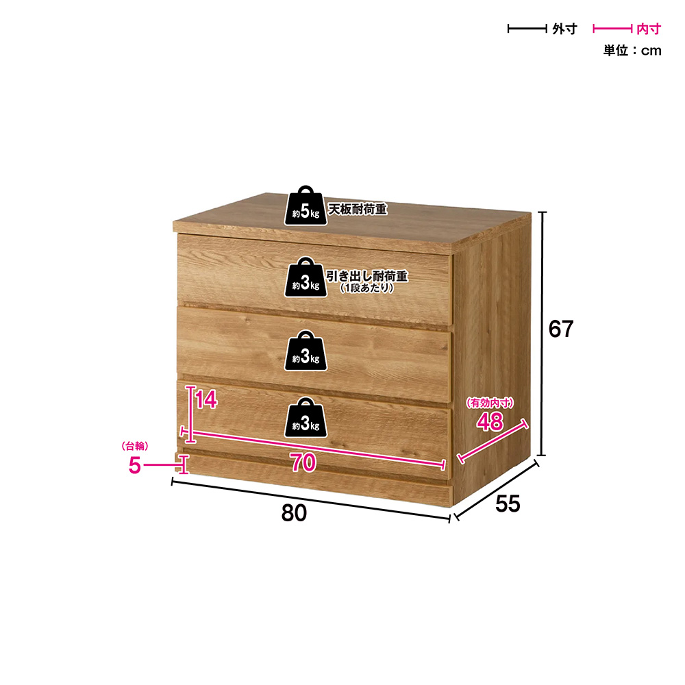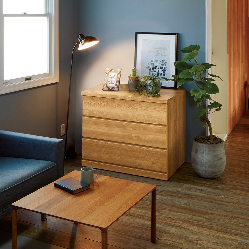隠しキャスター付きだから、移動しやすく見た目もスマート。幅・奥行・高さが選べて、背面まで美しい化粧仕上げなので、自由なレイアウトが楽しめます。家族構成やライフスタイルに合わせて模様替えが簡単に●隠しキャスター付きなので、お掃除や模様替えの時にも移動がラクラク。●「チェストの裏にホコリ溜めたくない」「配置を変えたいけれど動かせない」というお悩みを解決するチェストです。●家族構成の変化や引っ越しも視野に入れて長く使いたいという方にもおすすめ。●背面も美しい化粧仕上げ。●取っ手や飾りのないシンプルな外観だから、どんな空間にもなじみます。●色は清楚な印象の(ア)ホワイトと、風合いのよい木目調の(イ)ブラウンをご用意。お部屋の雰囲気に合わせて選べます。収納スペースに合わせて8サイズをご用意●幅は60cmと80cm、奥行は40cmと55cm、高さは67cm(引き出し3段)と86.5cm(引き出し4段)の計8サイズ。●サイズ違いを数台組み合わせても統一感があり、お部屋がすっきり。●引き出しは上下を入れ替えられるため、シーズンの衣類を出し入れしやすい高さにするだけで、衣替えが完了。●引き出しは全段スライドレール付きで開閉がスムーズ。奥にしまった衣類も取り出しやすい仕様です。リビングはもちろん、寝室やクローゼット内でも役立ちます●キャスターが外から見えないので、普通のローチェストのようなルックス。●リビングルームや寝室、和室に置いても違和感のない佇まいです。●奥行55cmタイプは深いクローゼットにも収まり、内部でスムーズに移動できるから、お掃除もラクちん。●高さ67cmタイプはクローゼットのハンガー下のスペースを有効活用できます。丁寧な仕上げが光る、安心の国産家具●日本の熟練の家具職人が、一点一点丁寧に仕上げている日本製の家具です。●長く使うものだから、細やかな製品精度にこだわってください。●完成品でお届けするので、組み立て不要。届いたらすぐに使えるのが嬉しいポイントです。