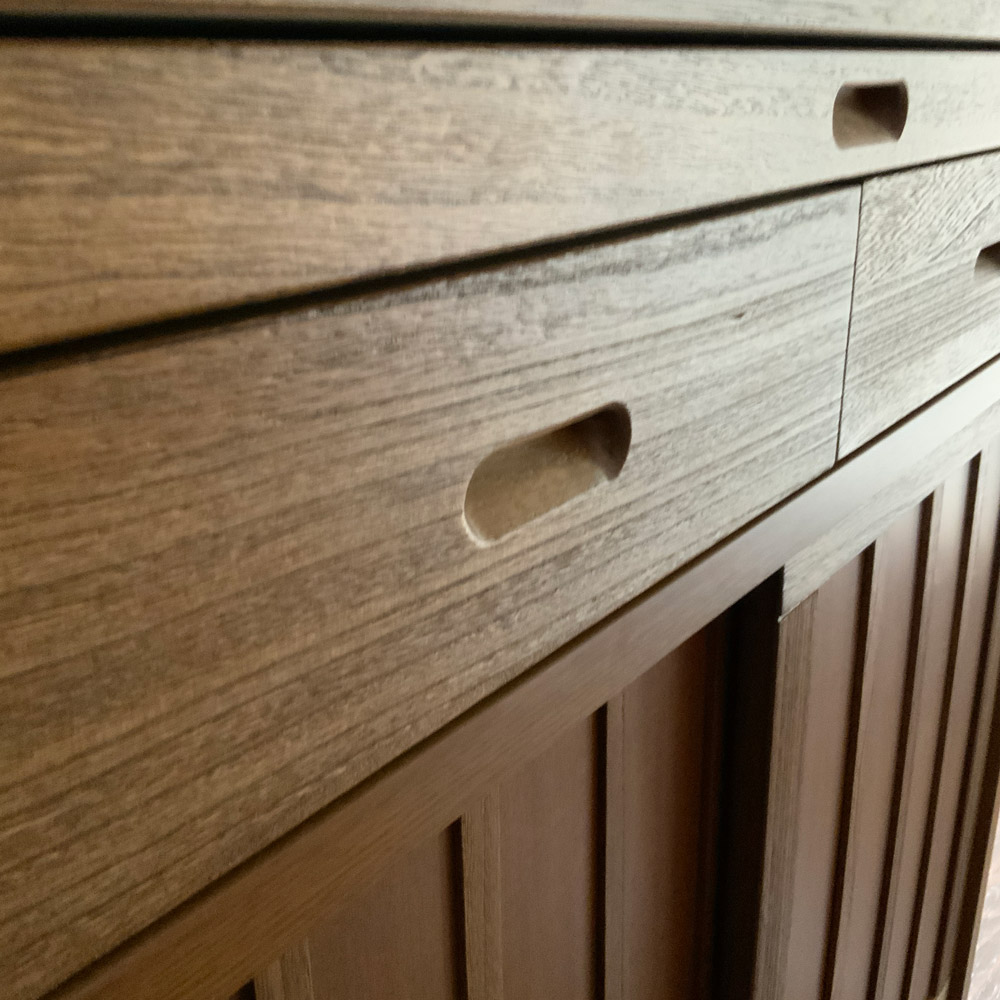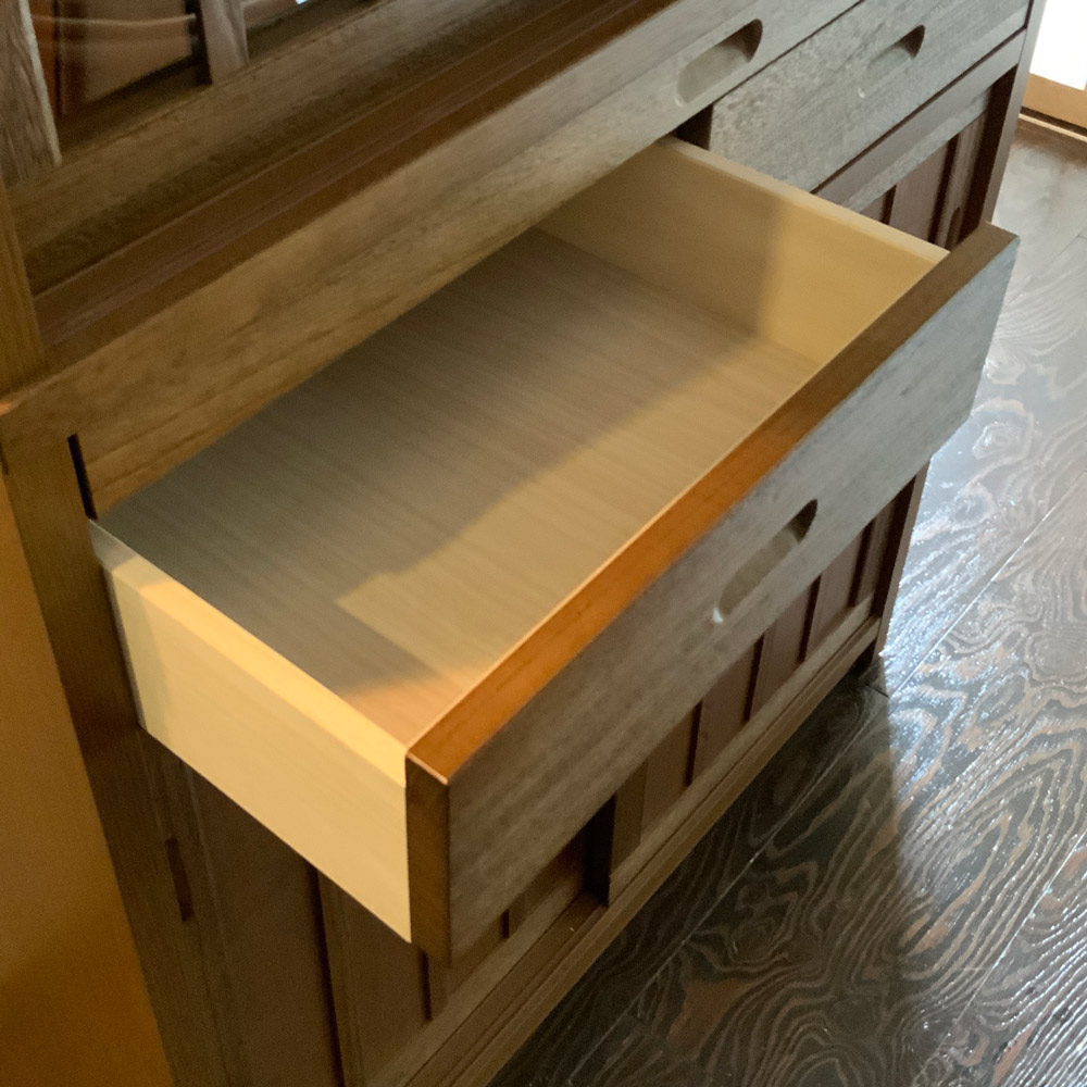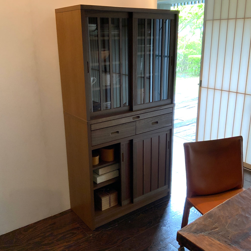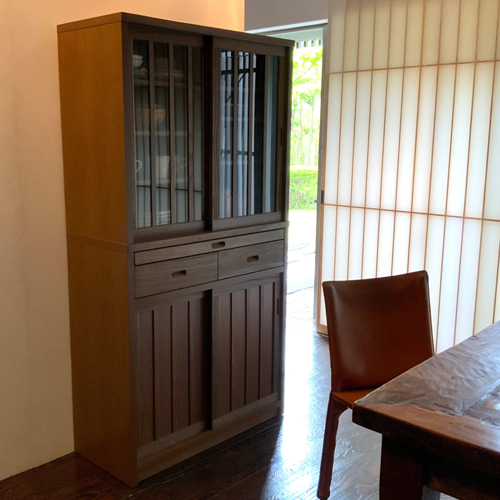 和モダンデザインの美しい木目の質感と格子が際立つ、国産水屋たんすシリーズのダイニングボード。収納力と使い勝手の良さも魅力です。〜立体的な木目の質感と人気の格子デザインがマッチ〜●古民家風デザインがおしゃれな引き戸式食器棚。●格子が美しいガラス扉の収納部は、飾り棚としてもおすすめです。●丈夫な箱組引き出しなど、国産ならではの丁寧なつくりが際立ちます。〜ほどよい高さと使い勝手の良さにもこだわりました〜●収納部は出し入れがしやすく、開閉に場所を取らない引き戸式です。●小物の収納に便利な引き出しが2杯付いています。●盛り付けやちょい置きに便利なスライドテーブル付き。●小柄な方でも最上部に手が届き、圧迫感のないほどよい高さ170cm。〜暮らしに合わせて選べる7タイプ〜●幅、高さ、使用方法などに合わせて選べる7タイプをご用意しました。●古美術や本、CDなどのコレクションを上品に飾ることもできます。●憧れの古民家テイストを取り入れた、素敵なお部屋ができあがります。桐 うづくり仕上げ木の表面を磨きながら削ぎ落として木目に凹凸を付け、年輪が浮き上がった美しい表情に仕上げます。